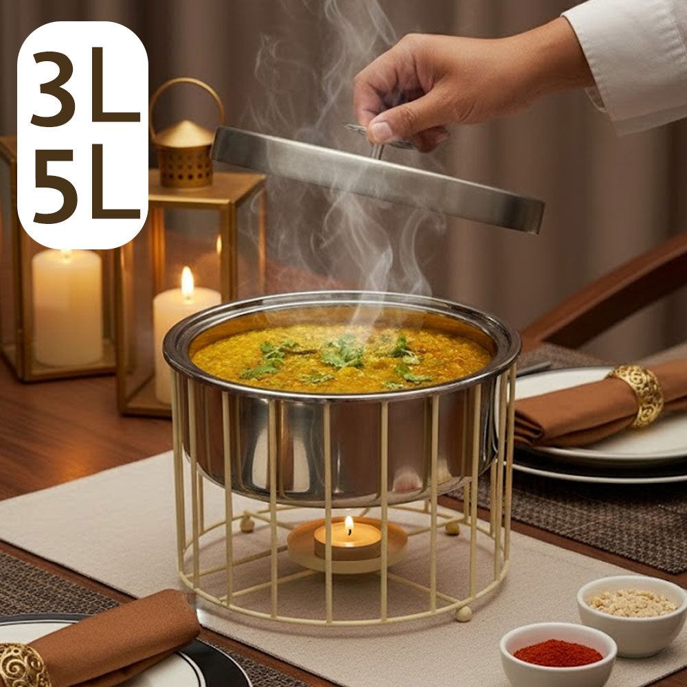 سخان طعام فاخر بتصميم عصري يجمع بين الأناقة والعملية. مصنوع من الستانلس ستيل عالي الجودة المقاوم للصدأ من ديفا ليدي ، مع قاعدة معدنية متينة تمنح ثباتًا وأناقة على طاولة الطعام.