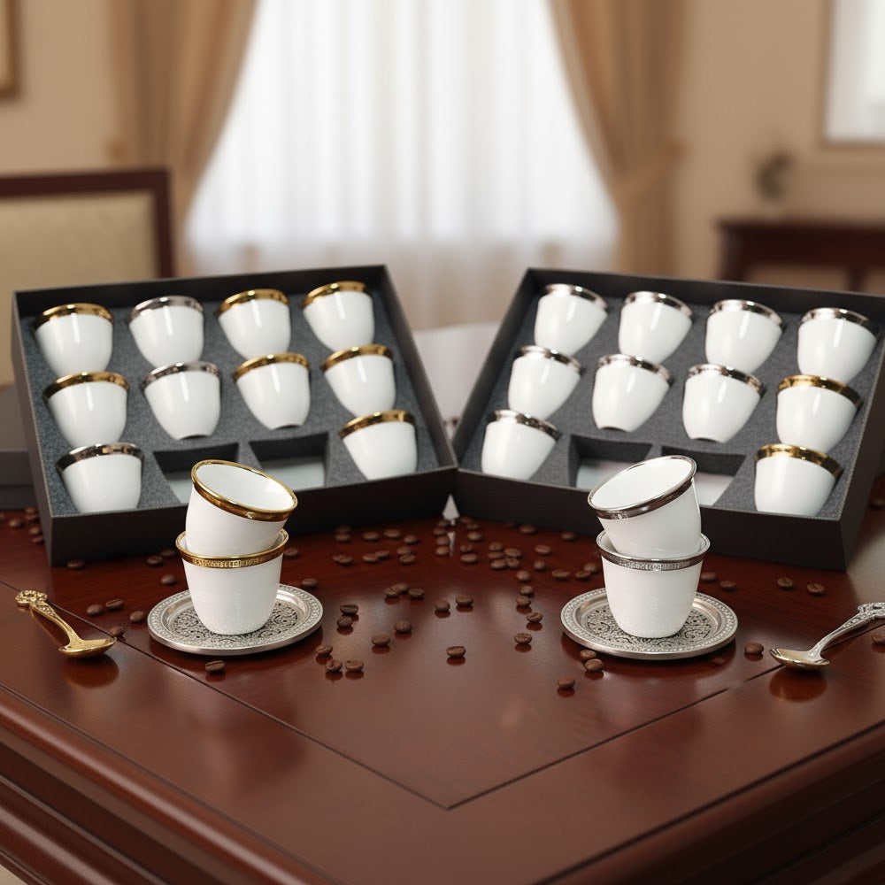قدّم لضيوفك أناقةً خالدة مع طقم فناجين القهوة العربية الفاخر هذا. مصنوع بخبرة من البورسلين الفاخر، كل كوب مصمم ليمنحك الراحة والرقي. يتضمن الطقم اثني عشر فنجانًا بلمسة نهائية رائعة، مُقدمة في علبة هدايا فاخرة، مثالية للتجمعات، أو الضيافة، أو كهدية فاخرة للمناسبات الخاصة. متين، مقاوم للحرارة، وسهل التنظيف، يجمع هذا الطقم بين العملية والأناقة الراقية لكل لحظة قهوة.