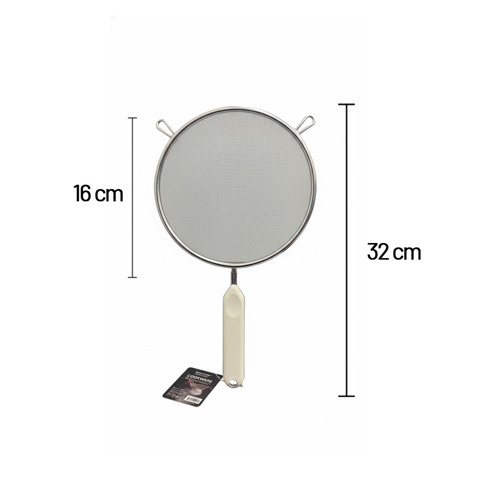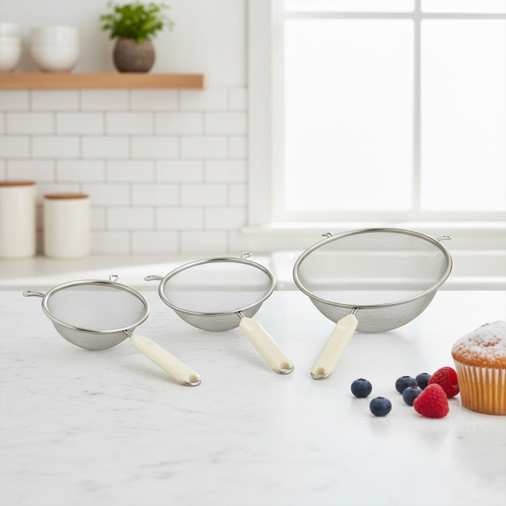 تضمن الشبكة الدقيقة للغاية تصفية سلسة للسوائل والجزيئات الصغيرة، مما يجعلها مثالية للشاي والصلصات والشوربات، كما أنها تحمي من زيت القلي. تحتوي كل مصفاة على خطافين جانبيين لسهولة وضعها على الأواني والأوعية، مما يُبقي يديك حرتين أثناء الاستخدام.