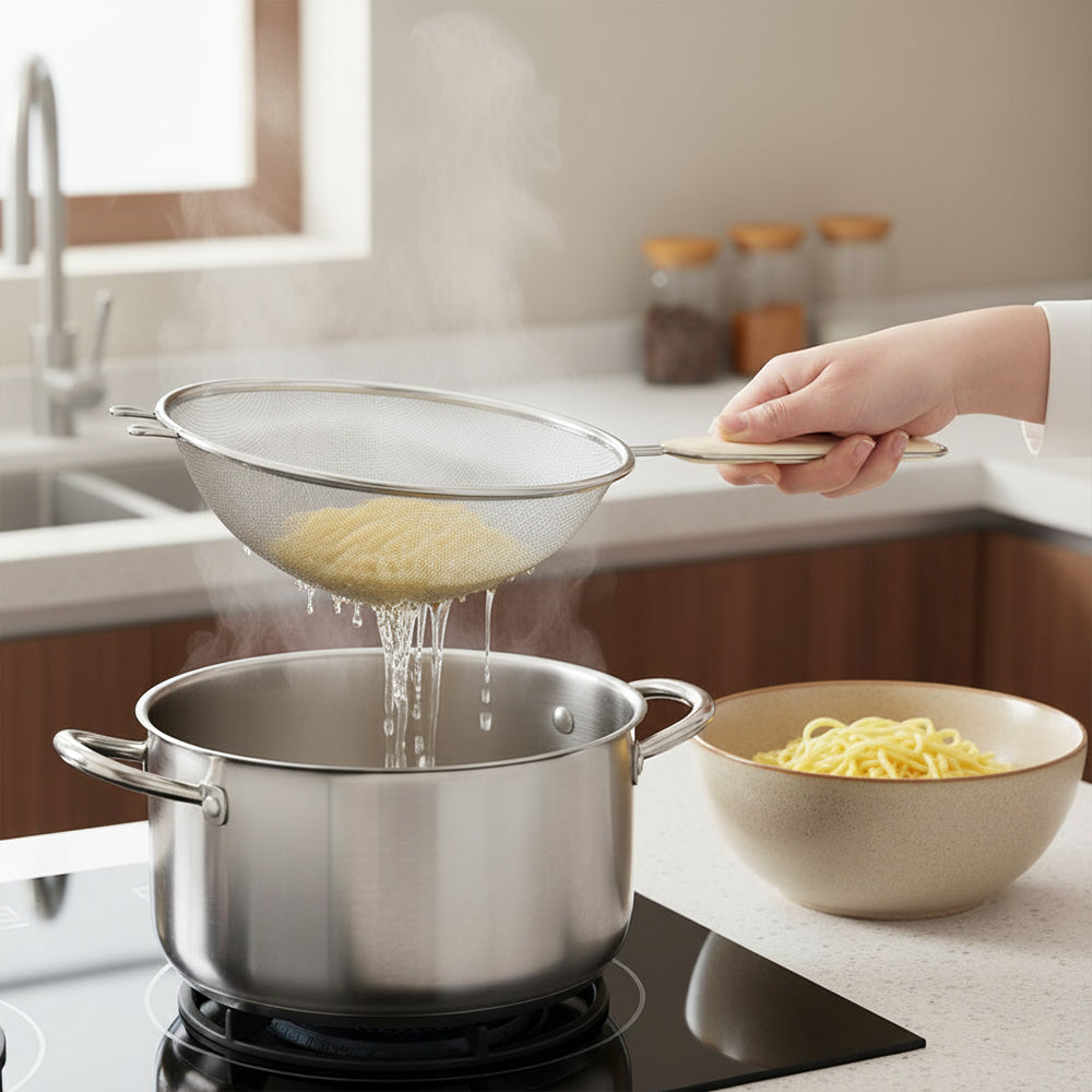 طقم مصافي شبكية دقيقة من الفولاذ المقاوم للصدأ (3 أحجام) هو أداة المطبخ المثالية متعددة الاستخدامات، تجمع بين المتانة والتصميم الأنيق. مصنوعة من الفولاذ المقاوم للصدأ عالي الجودة ومجهزة بمقبض بلاستيكي مقاوم للحرارة، تجعل هذه المصافي الطهي والتحضير أسهل وأكثر أمانًا وفعالية.