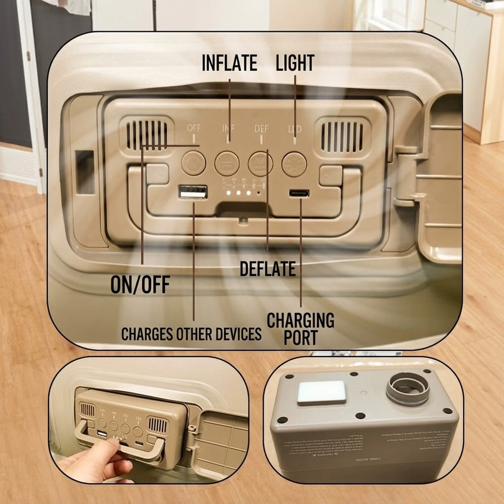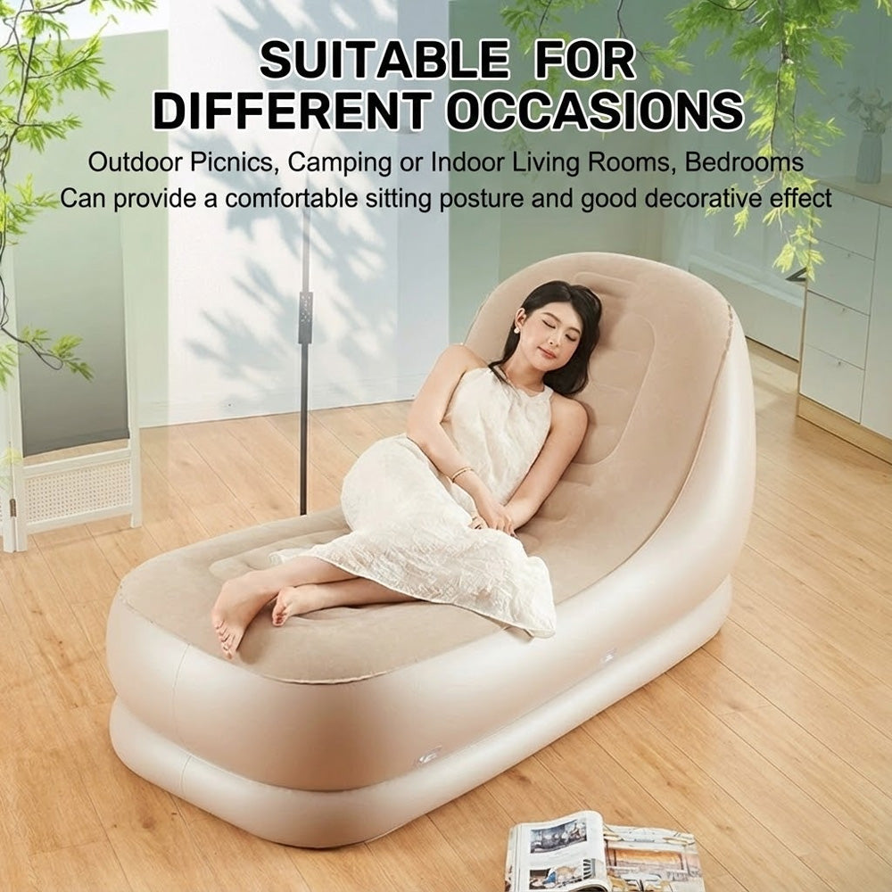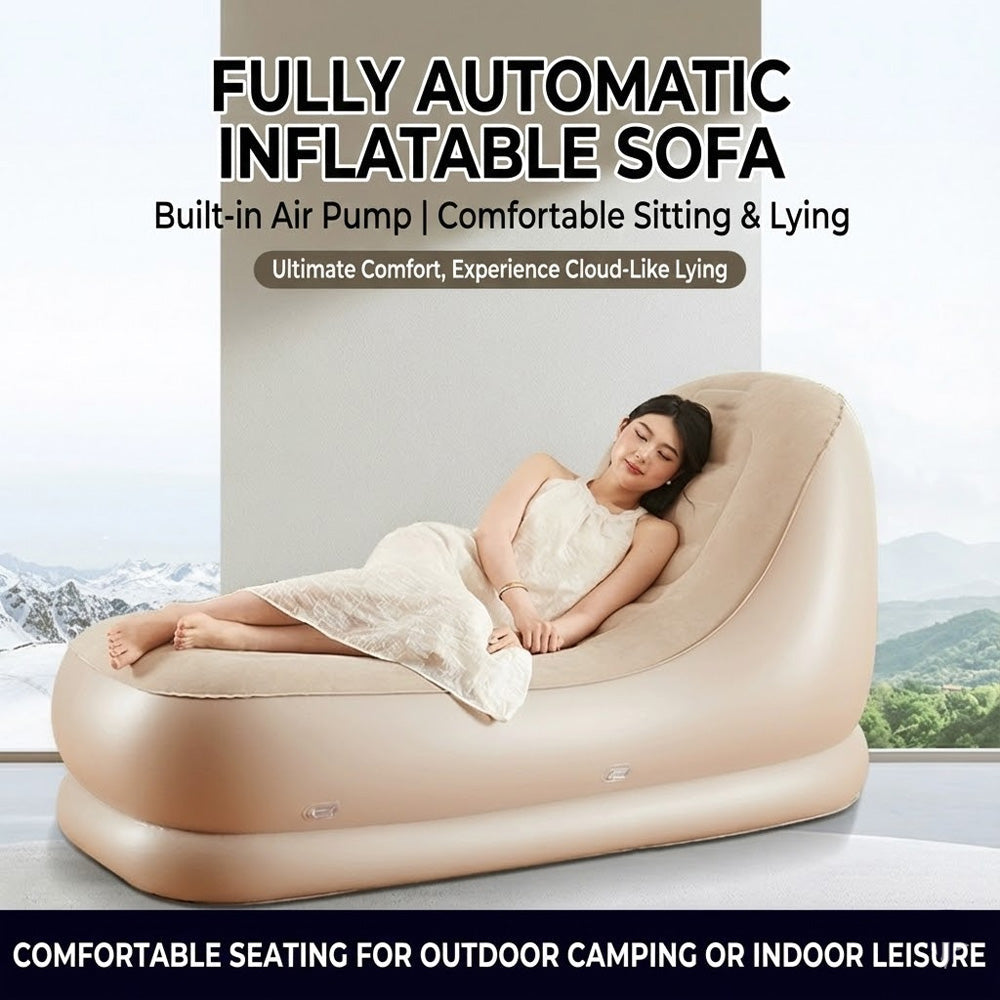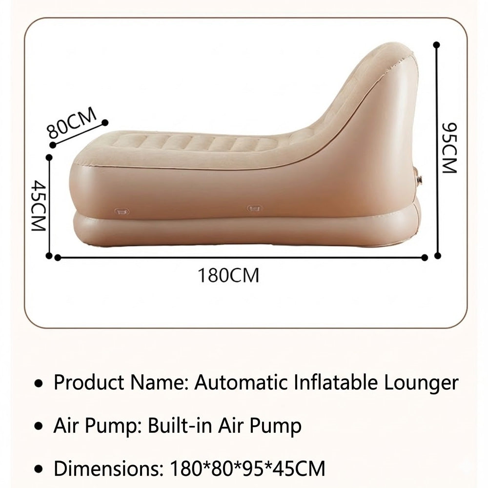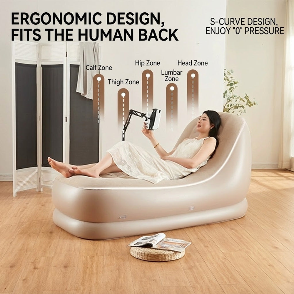 هذا كرسي استرخاء قابل للنفخ أوتوماتيكي بالكامل، مصمم للجلوس والاستلقاء بشكل مريح. يتميز بتصميم منحني على شكل حرف S مريح، يدعم مناطق مختلفة من الجسم، بما في ذلك الرأس، وأسفل الظهر، والورك، والفخذ، وعضلات الساق، مما يوفر تجربة استرخاء خالية من أي ضغط. يتضمن مضخة هواء كهربائية مدمجة قابلة للنفخ والتفريغ تلقائيًا، بالإضافة إلى ميزات إضافية مثل:
