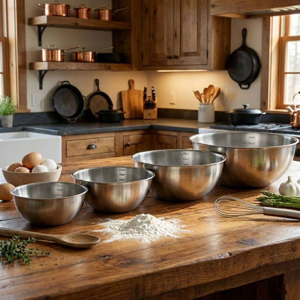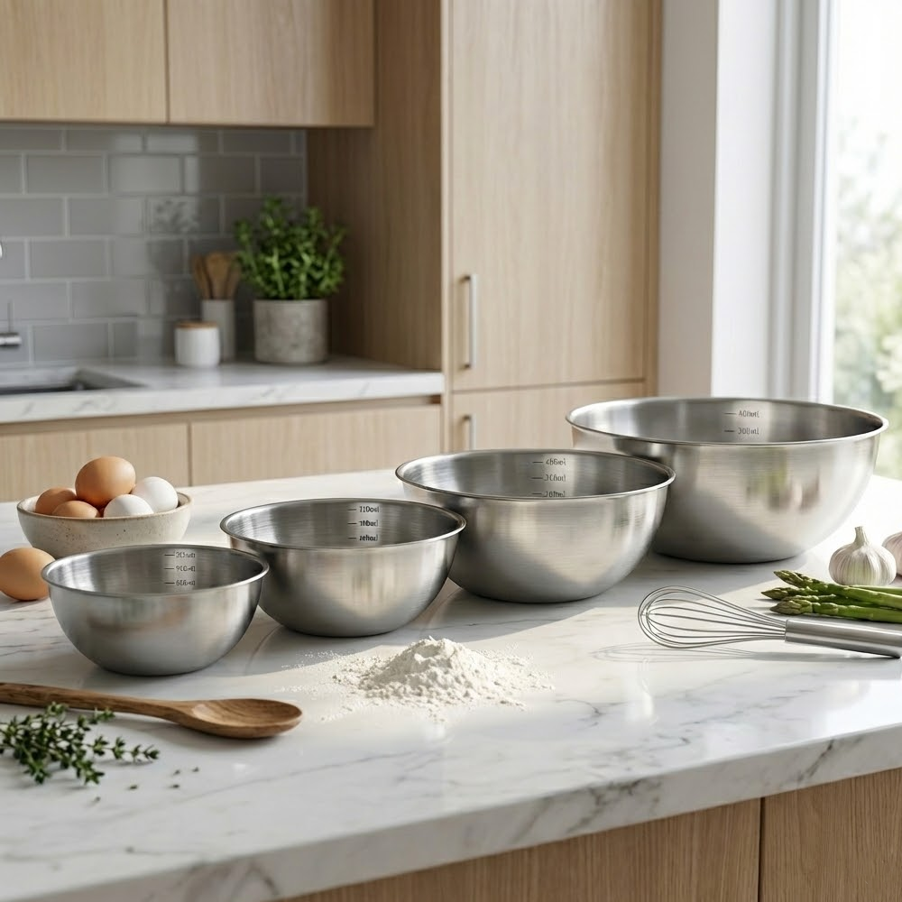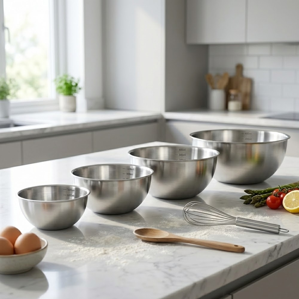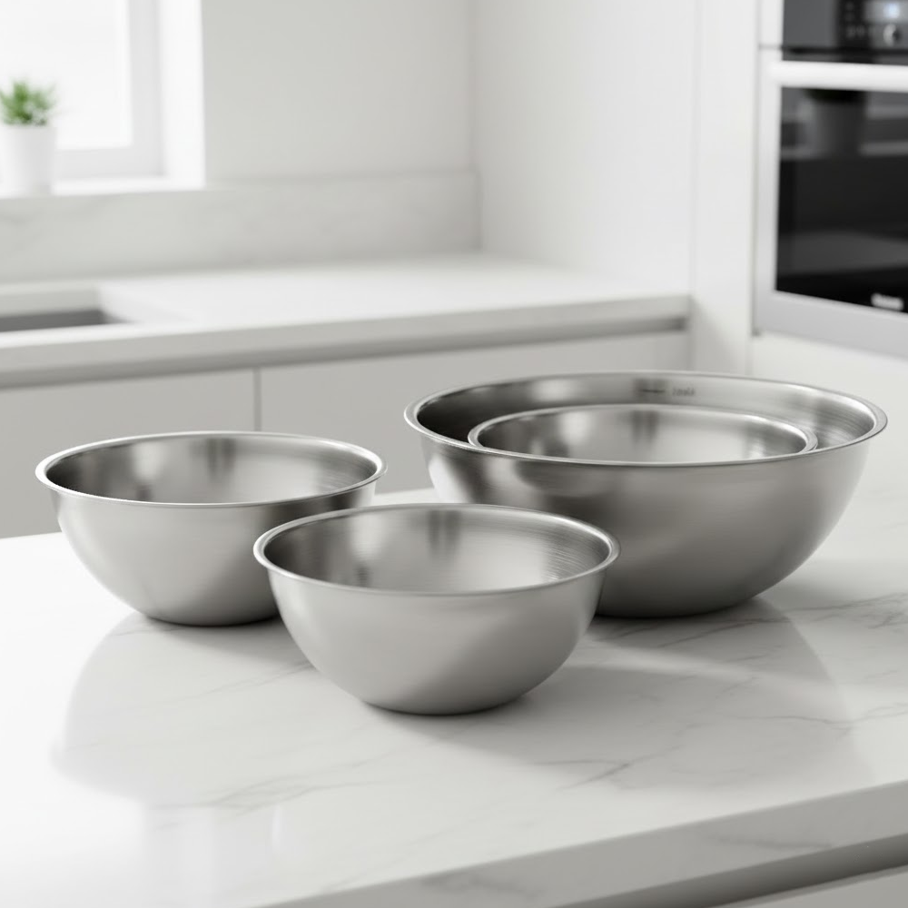 طقم أوعية خلط عملي وأنيق مصنوع من ستانلس ستيل عالي الجودة، مصمم ليكون رفيقك اليومي في المطبخ. يجمع هذا الطقم بين المتانة، السعة المتنوعة، وسهولة الاستخدام، مما يجعله مثاليًا لتحضير مختلف الوصفات من أبسطها إلى الأكبر حجمًا.