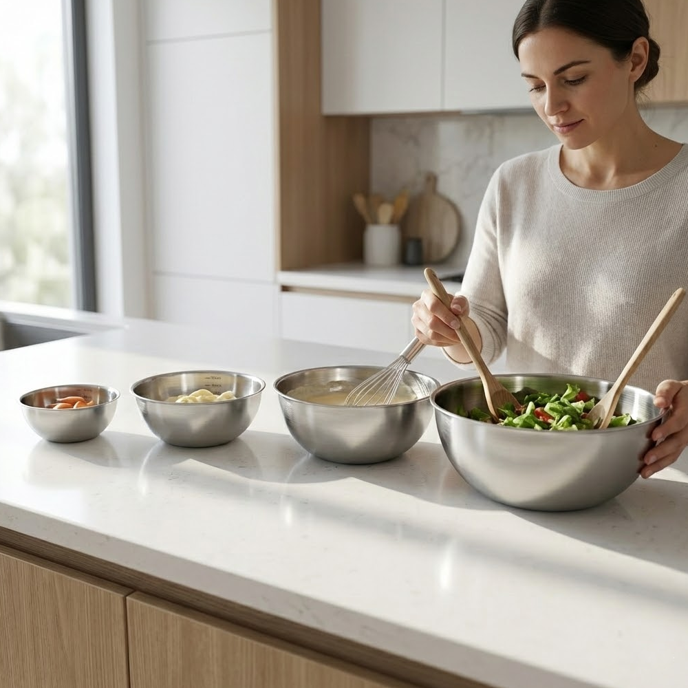 الطقم مناسب لخلط العجائن، تحضير السلطات، غسل الخضار والفواكه، خفق البيض، وتجهيز المكونات اليومية بكل سهولة.