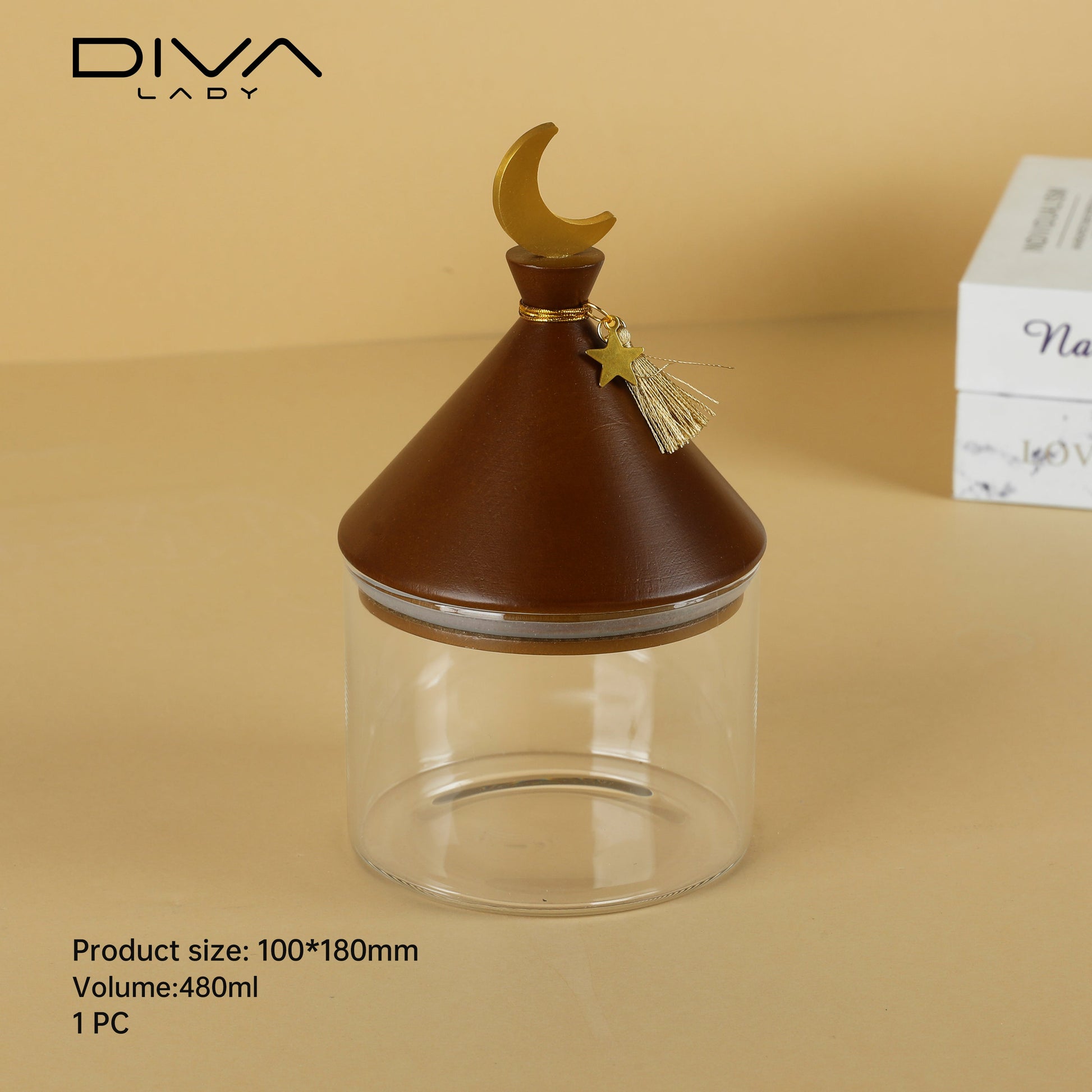 يتميز البرطمان بجسم زجاجي شفاف عالي الجودة، مع غطاء مخروطي أنيق متوفر بتشطيبات راقية (خشبي أو أبيض)، مزين بتفصيلة فاخرة على شكل هلال ونجمة تضيف طابعًا شرقيًا أنيقًا يعكس الذوق الرفيع.