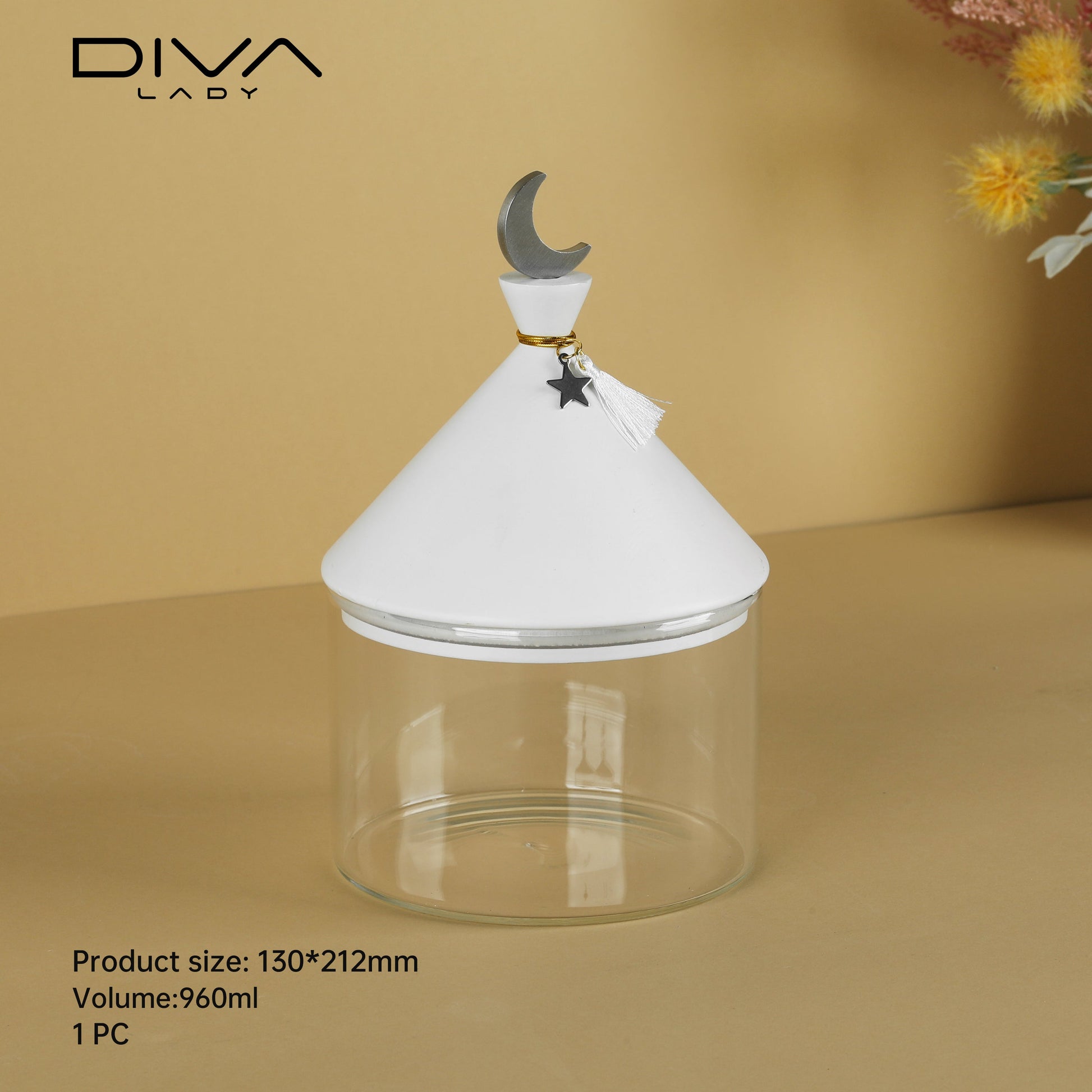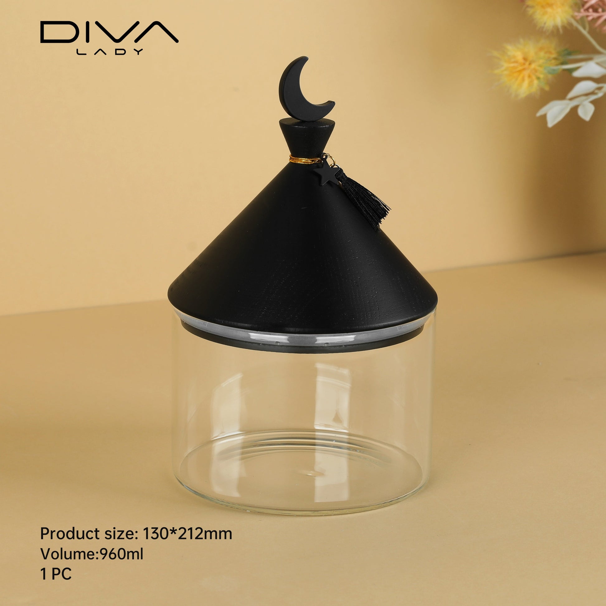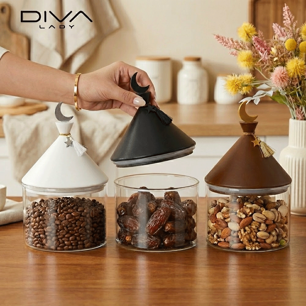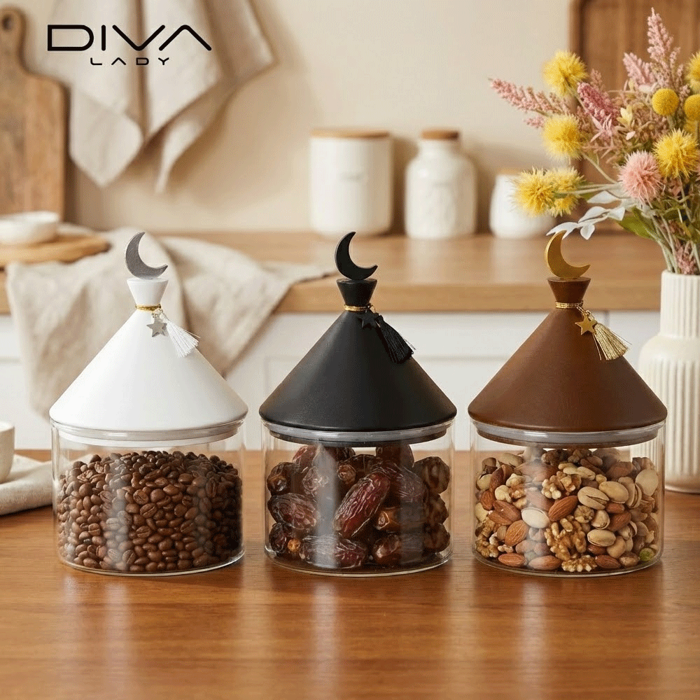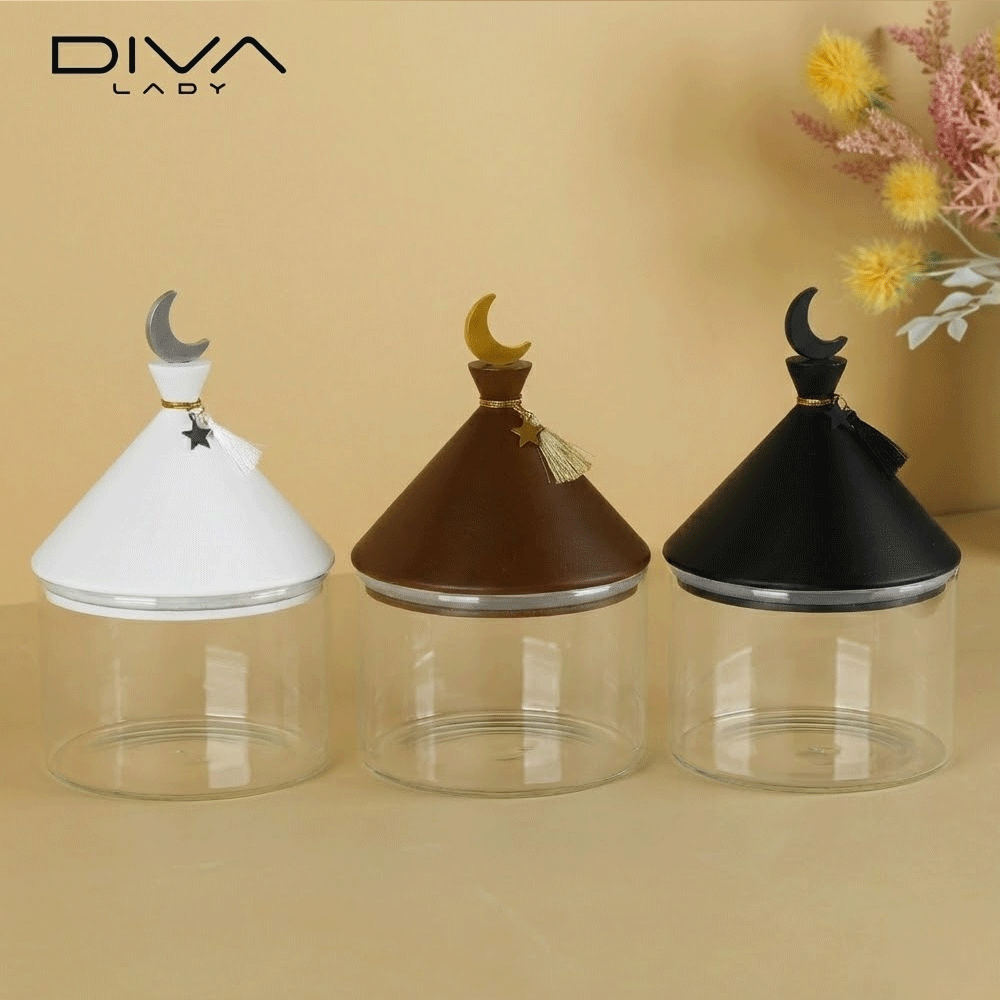 يتميز البرطمان بجسم زجاجي شفاف عالي الجودة، مع غطاء مخروطي أنيق متوفر بتشطيبات راقية (خشبي أو أبيض)، مزين بتفصيلة فاخرة على شكل هلال ونجمة تضيف طابعًا شرقيًا أنيقًا يعكس الذوق الرفيع.