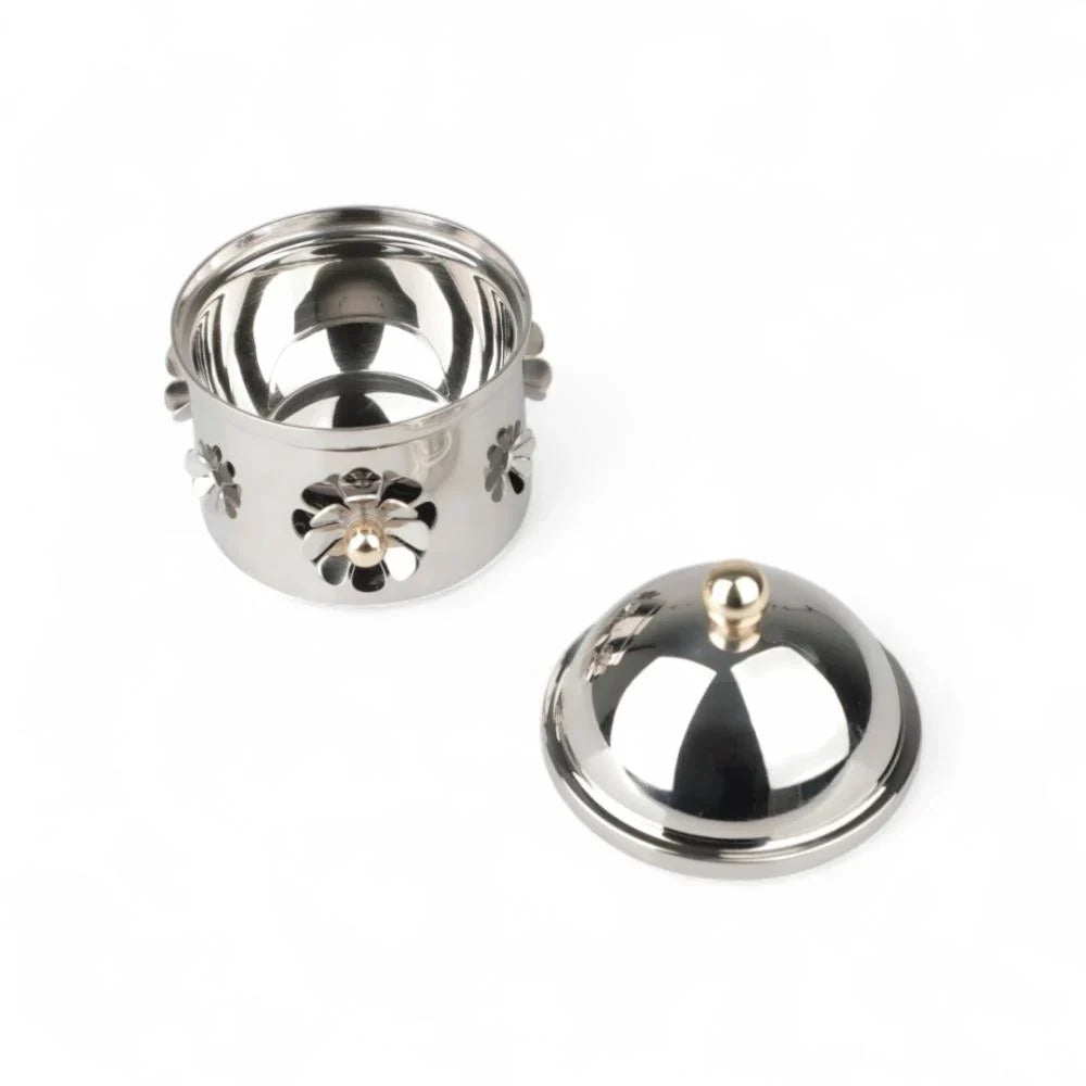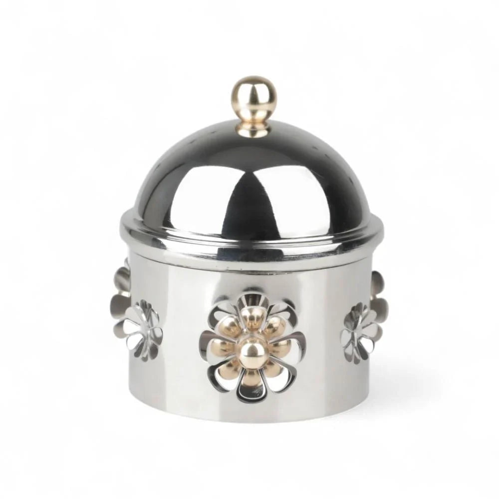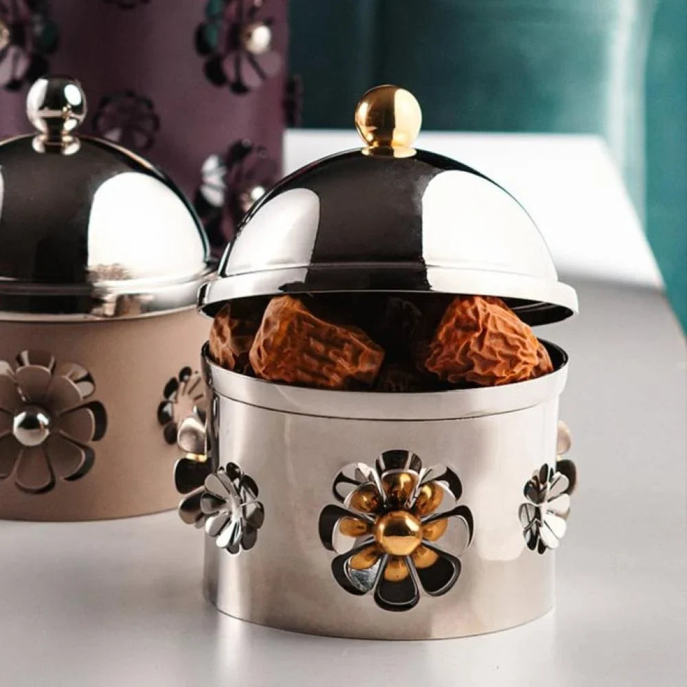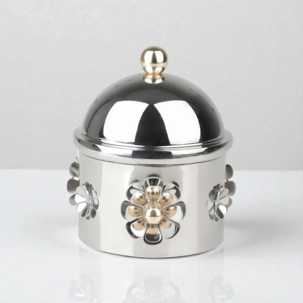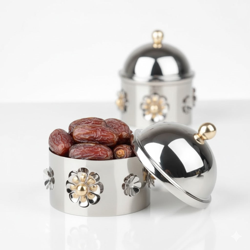 أضيفي لمسة من الفخامة إلى ضيافتك مع هذه التمرية المعدنية الراقية ذات الغطاء اللامع والتصميم الزهري الأنيق. مصنوعة بدقة عالية من المعدن المطلي باللون الفضي والذهبي لتجمع بين الأناقة والمتانة في آنٍ واحد.