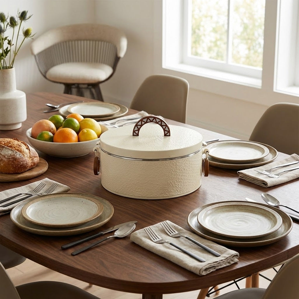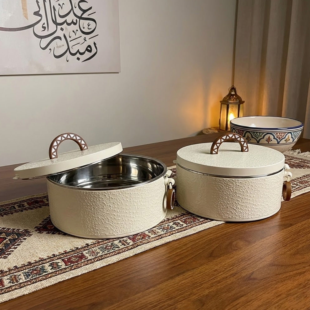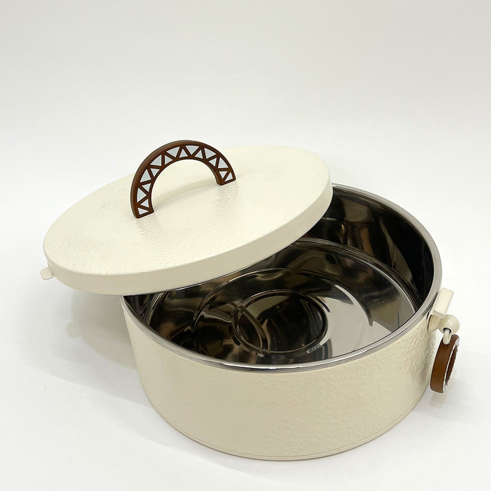 تجمع هذه الحافظة الدائرية الأنيقة والمعزولة لتخزين الطعام بين العملية والتصميم العصري. يبلغ قطرها 31 سم وارتفاعها 11.5 سم، مما يوفر مساحة واسعة لتخزين وتقديم مجموعة متنوعة من الأطباق. تتميز الحافظة بجزء داخلي معدني متين يساعد في الحفاظ على درجة حرارة الطعام، بينما يضفي الجزء الخارجي الكريمي المزخرف لمسة أنيقة على مطبخك.