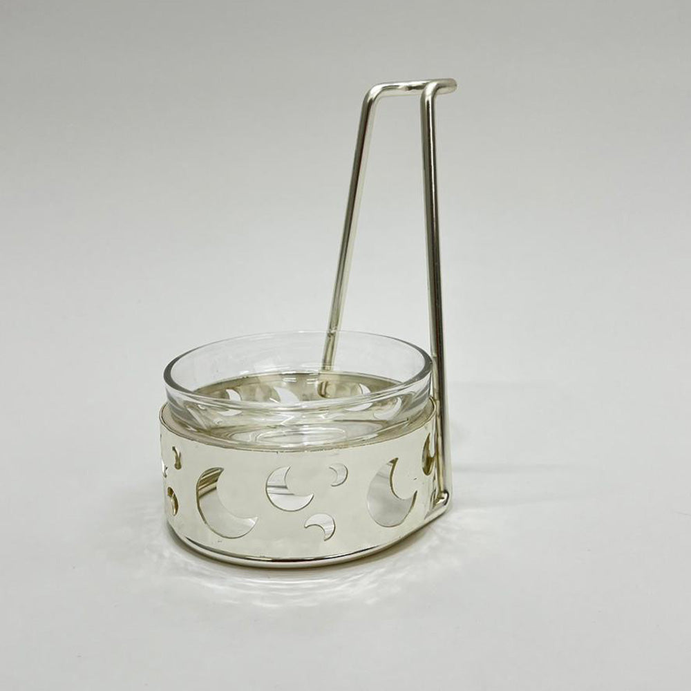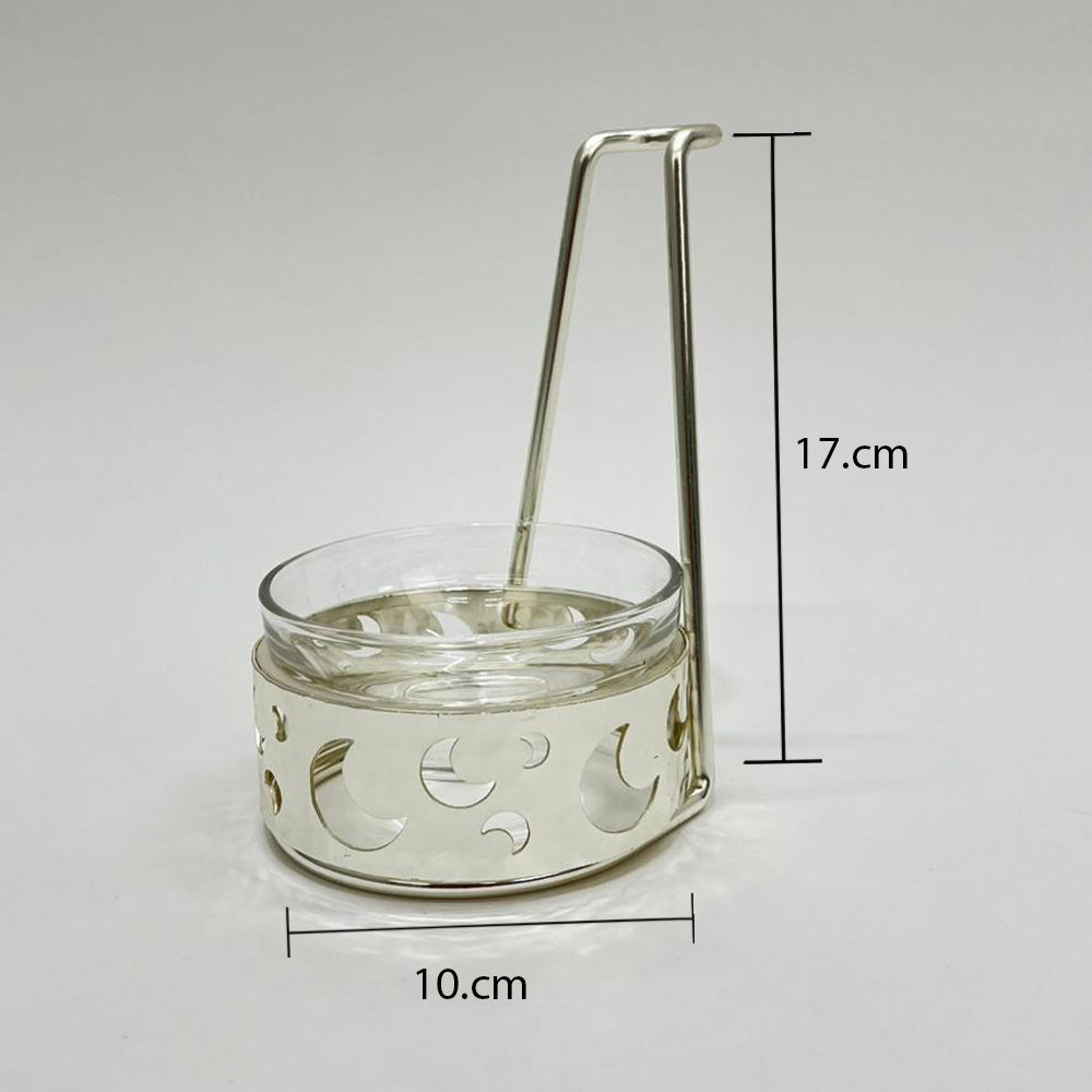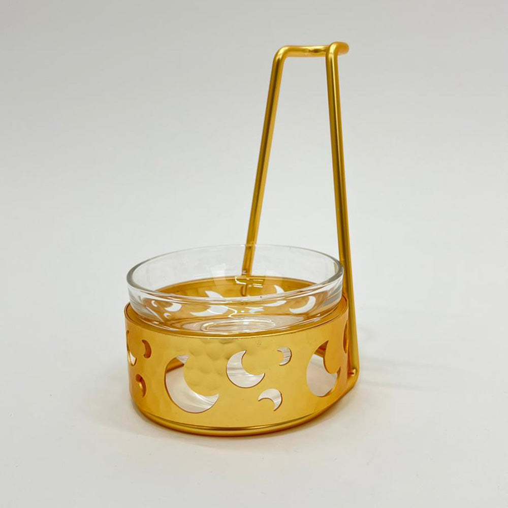 القاعدة والإطار: مصنوعة من معدن باللون الذهبي اللامع والفضي، وتتميز بتصميم زخرفي على شكل هلالات ونجوم مقطوعة.
