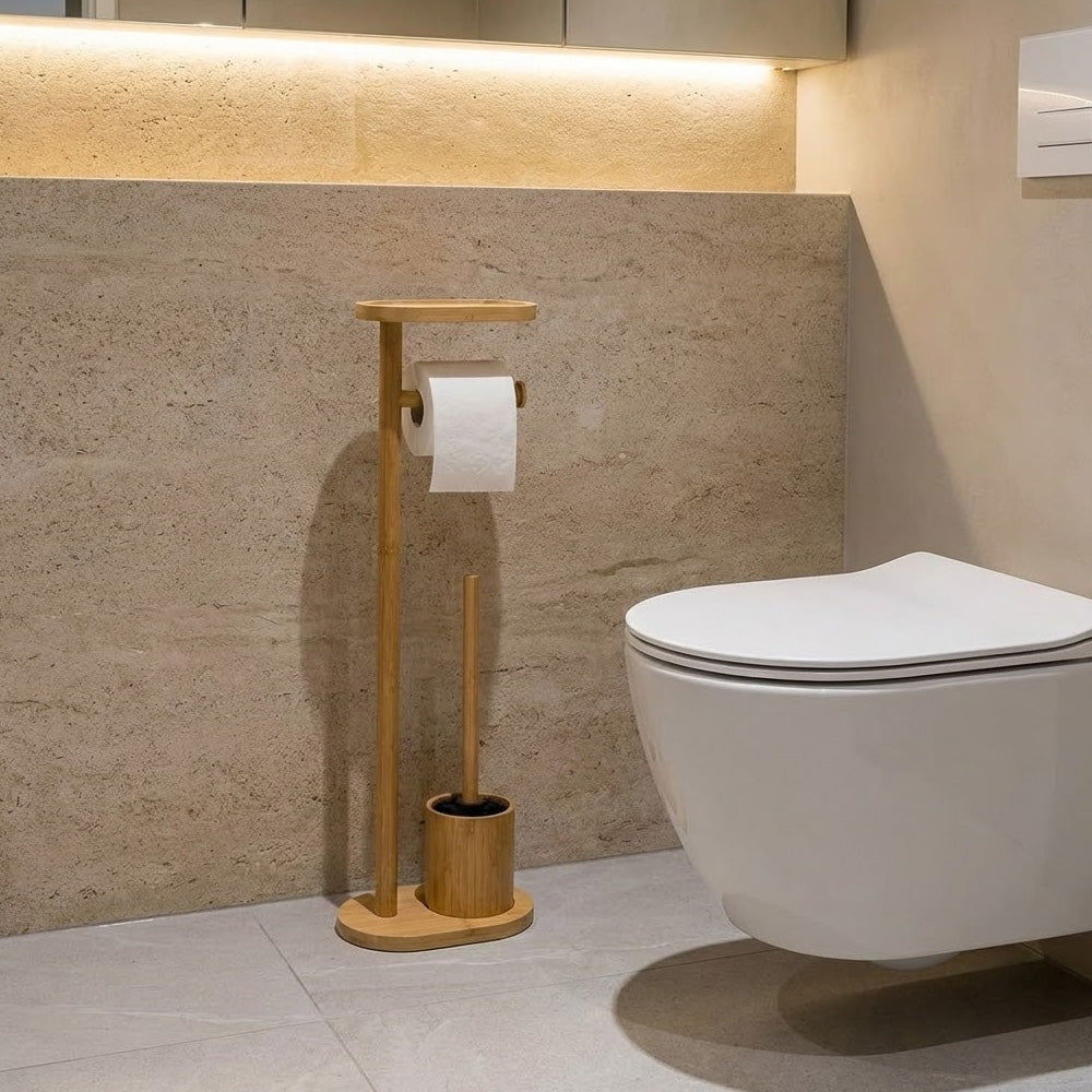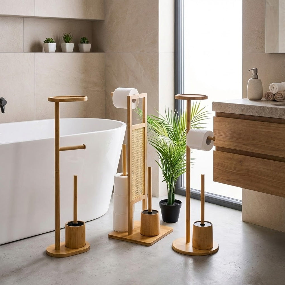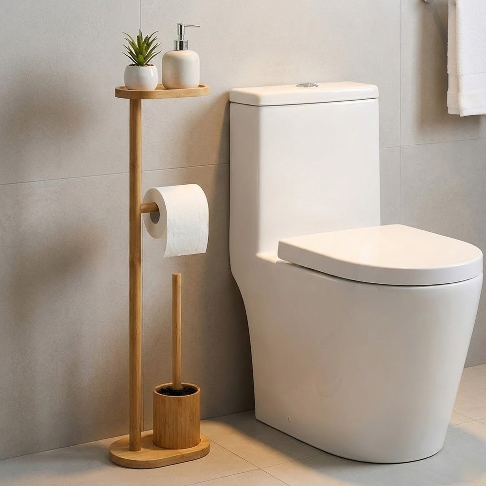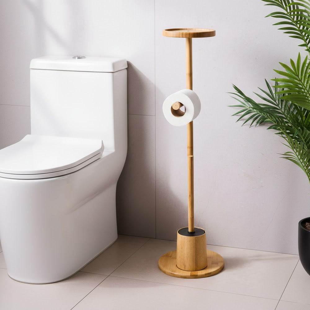 يتضمن الحامل قاعدة دائرية ثابتة، وحاملًا مدمجًا لفرشاة المرحاض، وحاملًا لورق التواليت، ورفًا علويًا مثاليًا لوضع الهاتف أو المناديل المبللة أو الإكسسوارات الصغيرة. يُضفي لونه الطبيعي الأنيق لمسة جمالية على الديكورات الداخلية العصرية والإسكندنافية والبسيطة.