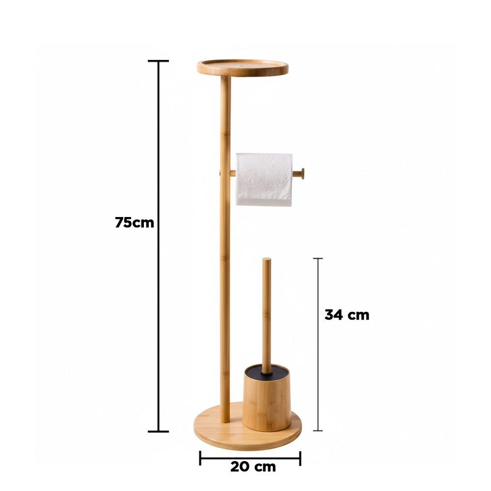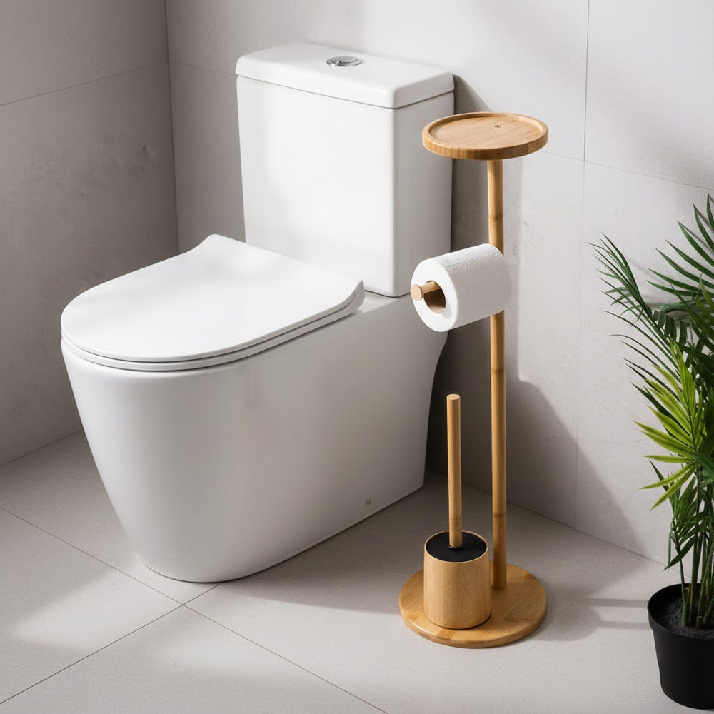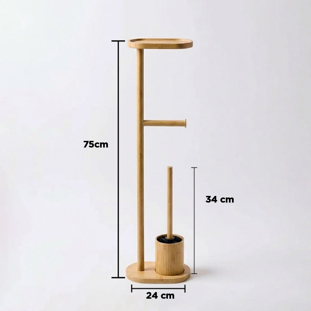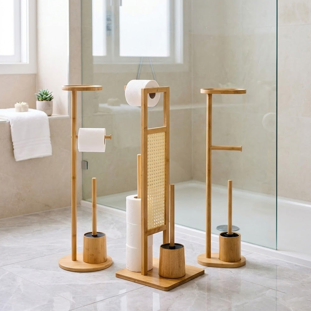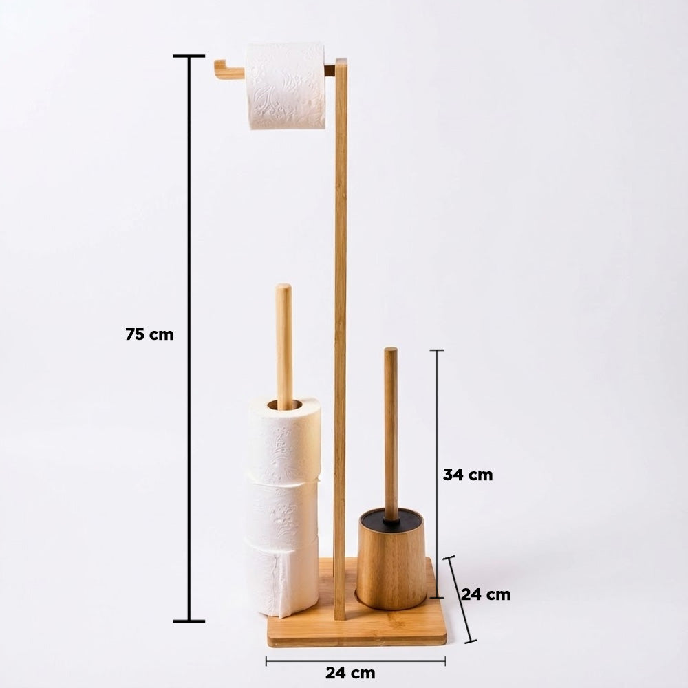 يتضمن الحامل قاعدة دائرية ثابتة، وحاملًا مدمجًا لفرشاة المرحاض، وحاملًا لورق التواليت، ورفًا علويًا مثاليًا لوضع الهاتف أو المناديل المبللة أو الإكسسوارات الصغيرة. يُضفي لونه الطبيعي الأنيق لمسة جمالية على الديكورات الداخلية العصرية والإسكندنافية والبسيطة.