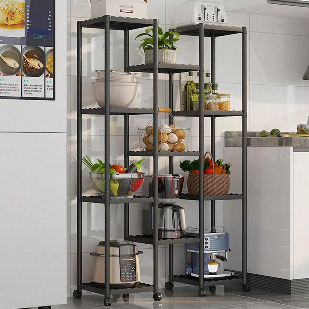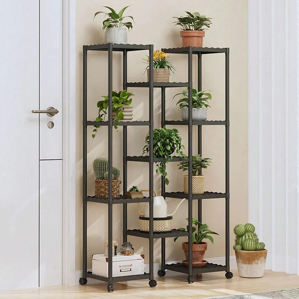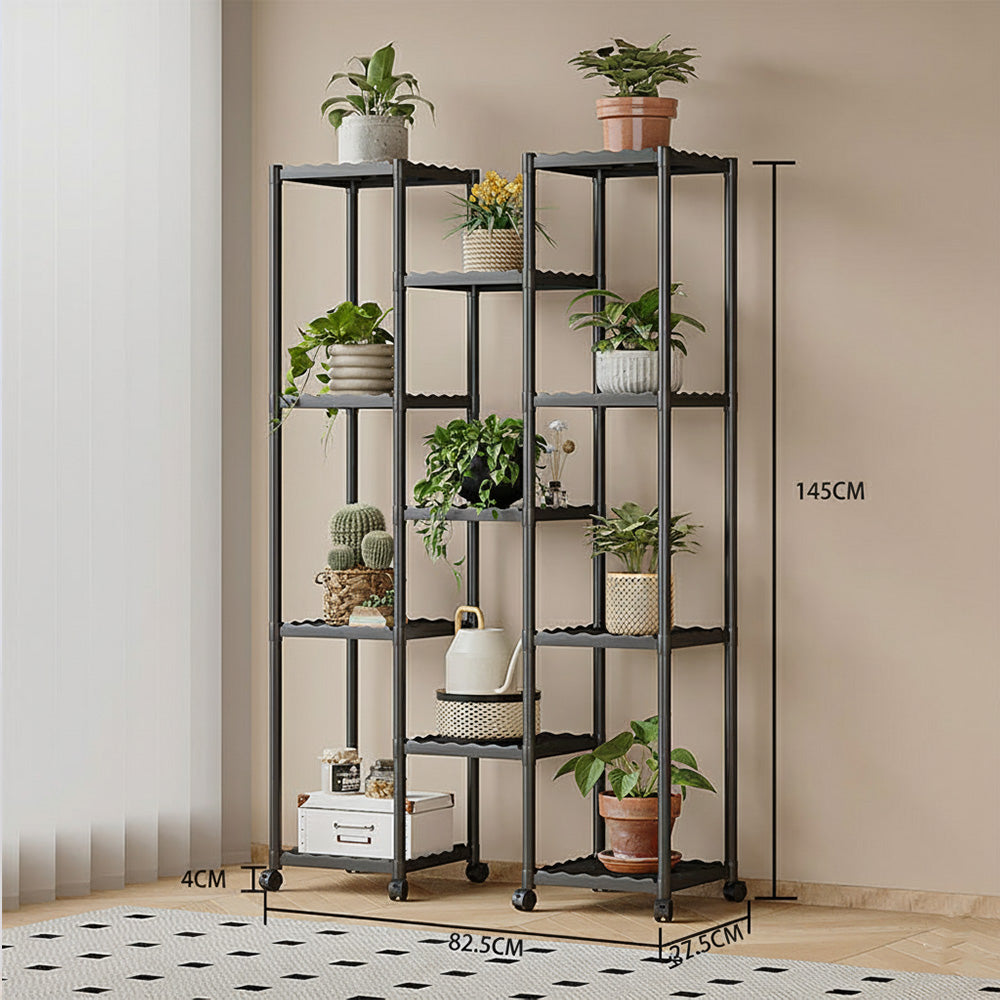 حامل نباتات أنيق ومتين متعدد الطبقات، بارتفاع ١٤٥ سم، مصمم بعجلات متحركة وأرفف متعددة الطبقات لتنظيم نباتاتك الداخلية بشكل أنيق. مثالي لغرف المعيشة والشرفات وزوايا الحدائق.