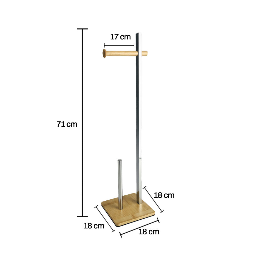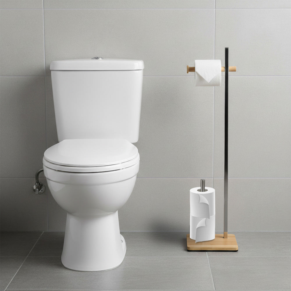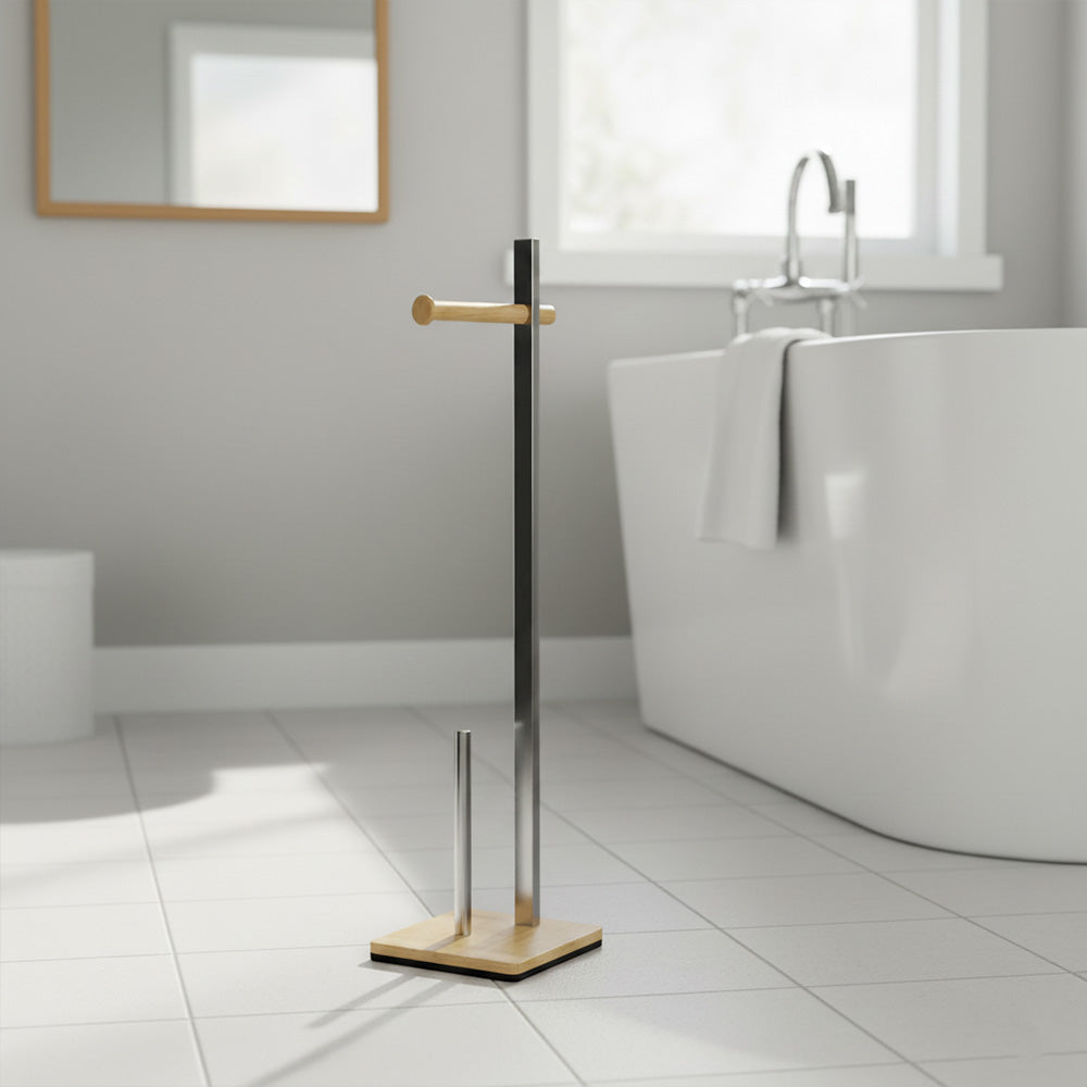 ارتقِ بحمامك مع حامل ورق التواليت العصري والأنيق هذا، الذي يجمع بين دفء الخيزران الطبيعي ومتانة الفولاذ المقاوم للصدأ الأنيقة. صُمم ليكون صغير الحجم وعمليًا في آنٍ واحد، ويتضمن ذراع توزيع رئيسي وعمود تخزين سفلي للحفاظ على لفائف ورق التواليت الإضافية في متناول اليد. تضمن قاعدة الخيزران المتينة ثباتًا مثاليًا، بينما يُكمل تصميمه البسيط ديكور أي حمام.