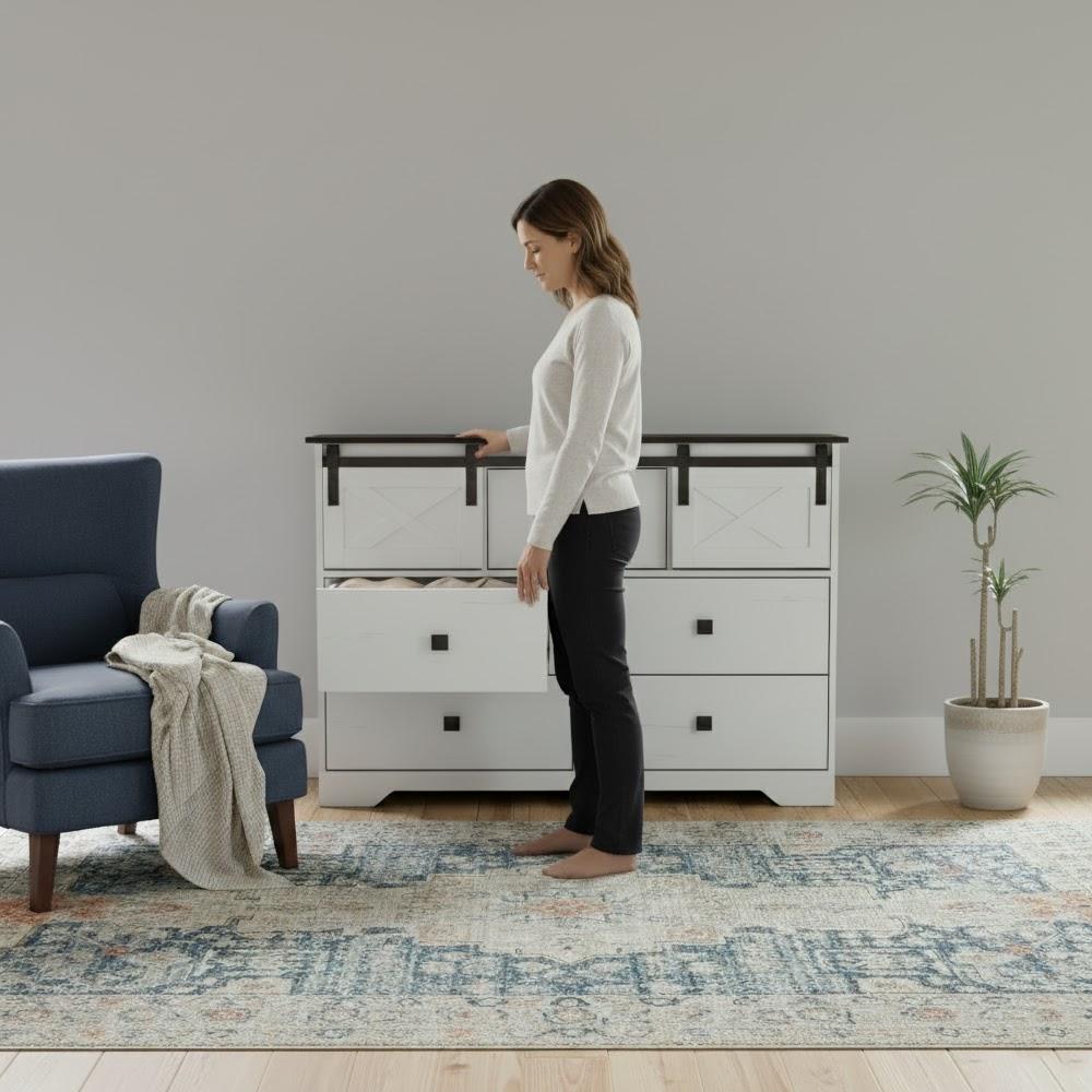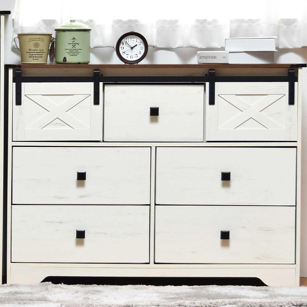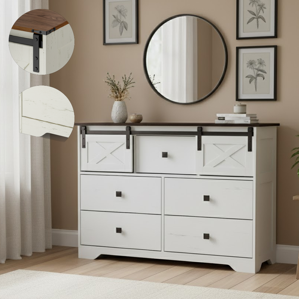 تتميز الخزانة بسطح علوي بلون خشبي طبيعي يمكن استخدامه لوضع الديكورات أو أدواتك اليومية، إضافة إلى أبواب منزلقة عملية توفر سهولة في الوصول للمحتويات الداخلية، وستة أدراج واسعة لتخزين الملابس، الأدوات، أو المستلزمات المنزلية.