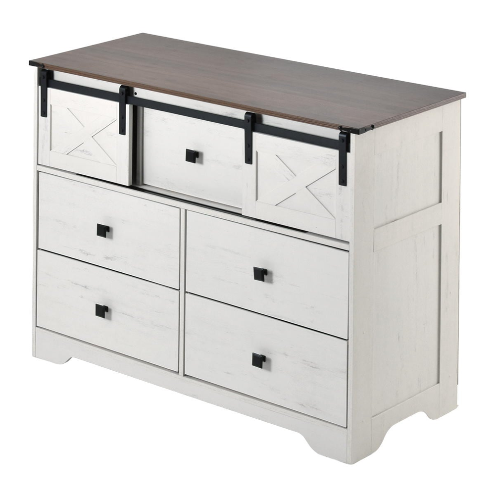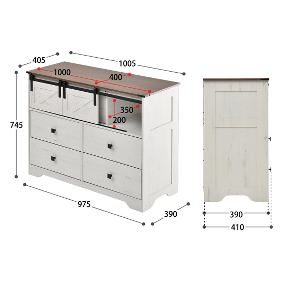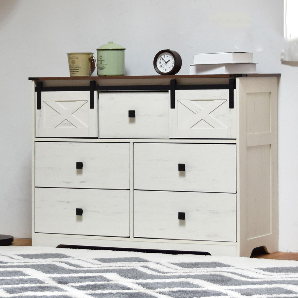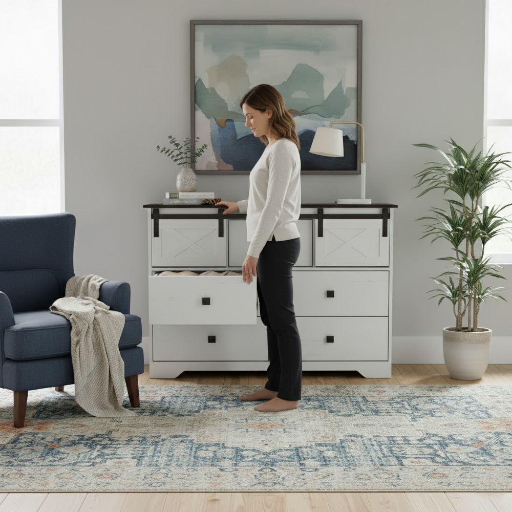 تتميز الخزانة بسطح علوي بلون خشبي طبيعي يمكن استخدامه لوضع الديكورات أو أدواتك اليومية، إضافة إلى أبواب منزلقة عملية توفر سهولة في الوصول للمحتويات الداخلية، وستة أدراج واسعة لتخزين الملابس، الأدوات، أو المستلزمات المنزلية.