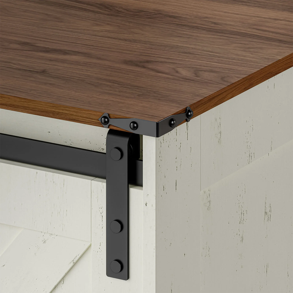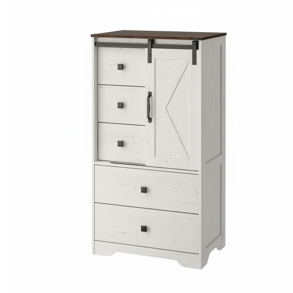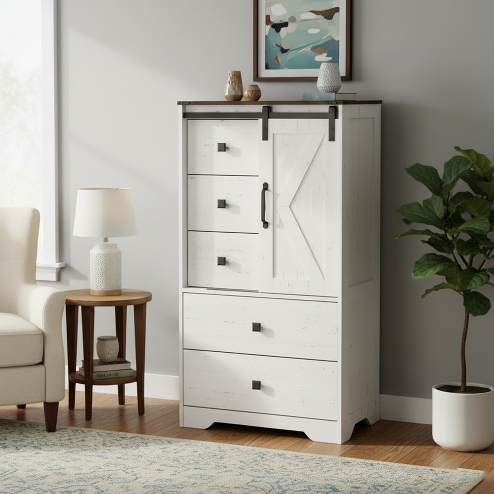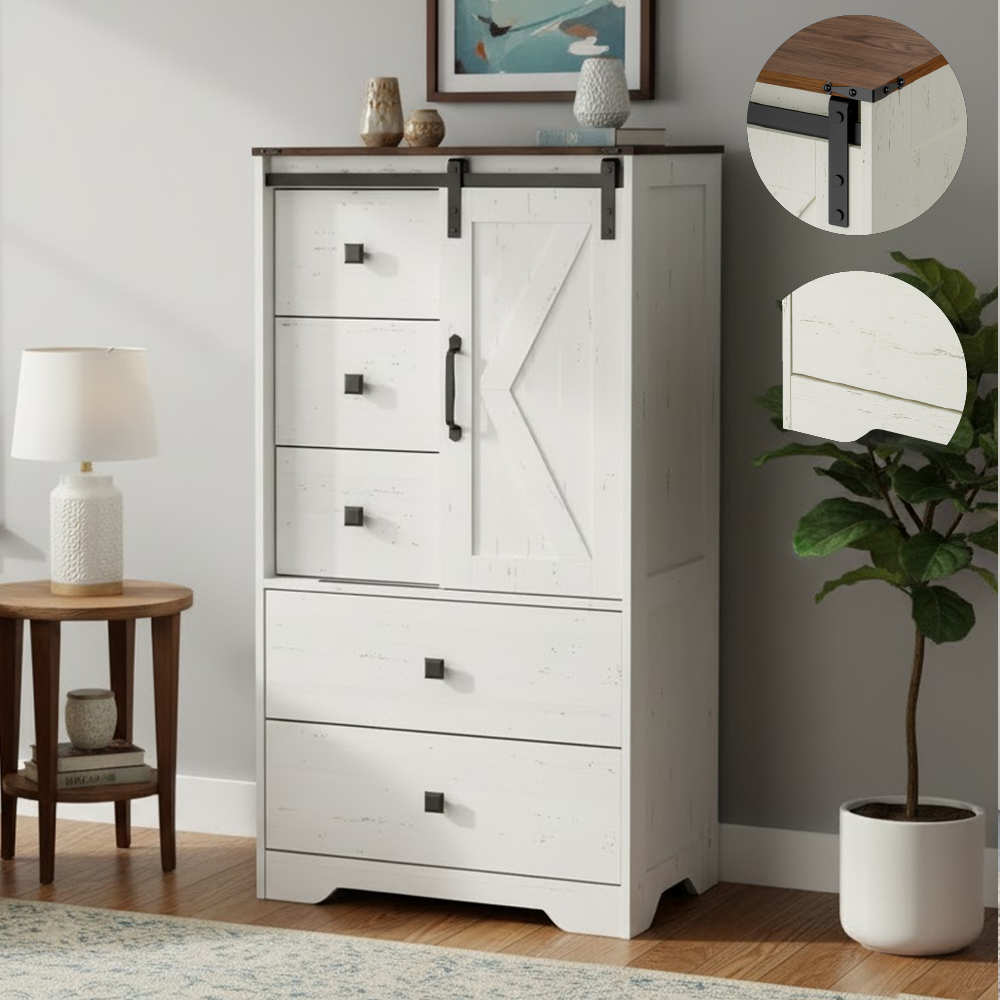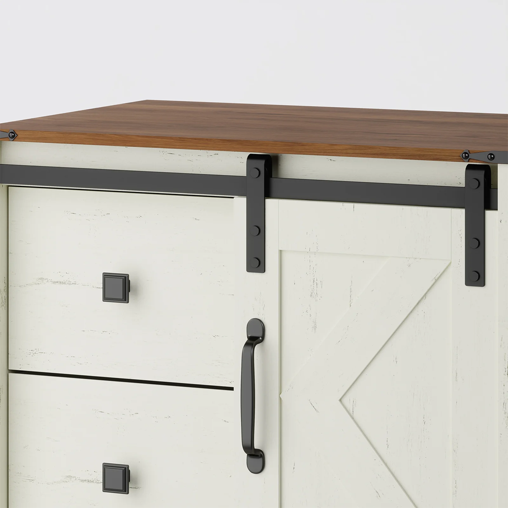 تصميم فريد مع مساحة تخزين متنوعة - مزيج من أحجام أدراج مختلفة يُسهّل تخزين الملابس، والإكسسوارات، والأجهزة الإلكترونية، أو الأدوات المنزلية. يكشف باب الحظيرة المنزلق عن مساحات تخزين مخفية، مما يمنحك الأناقة والراحة.