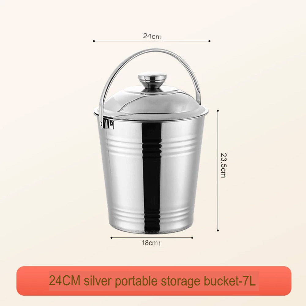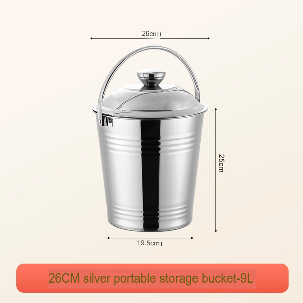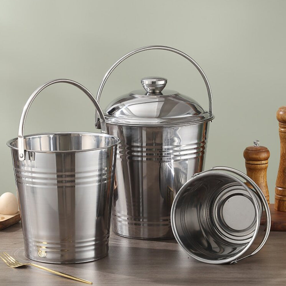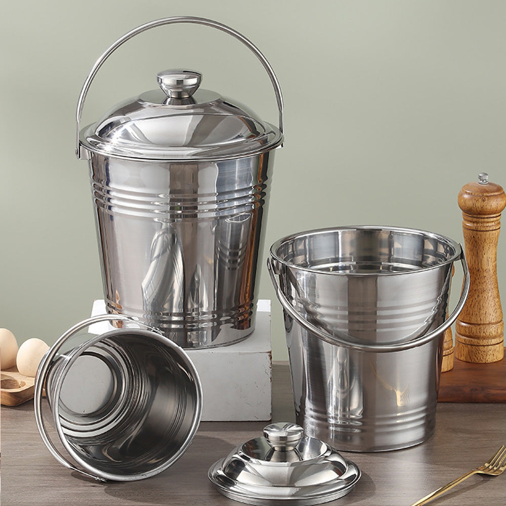 يتميز الدلو بغطاء محكم لحماية محتوياته من الغبار والرطوبة، ومقبض قوي لسهولة النقل. بفضل لونه الفضي الأنيق، يُناسب المطابخ، والمنازل، والمطاعم، والاستخدام الخارجي.