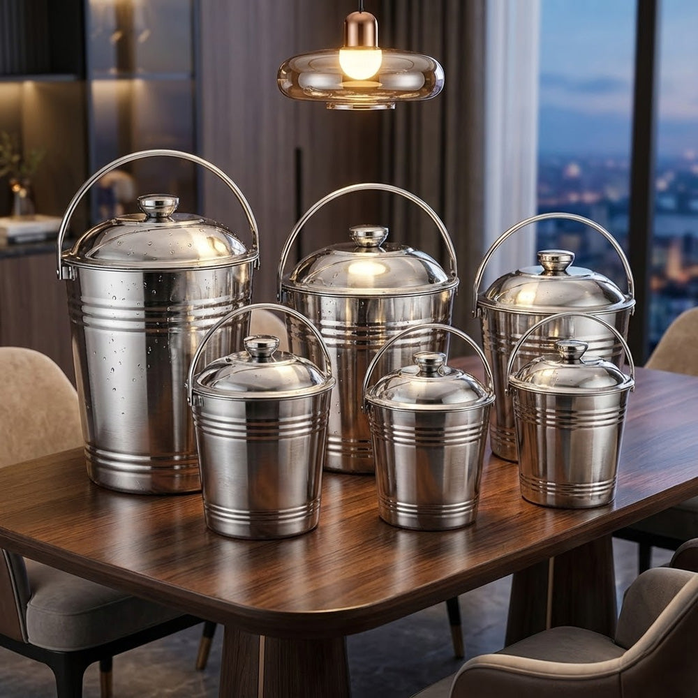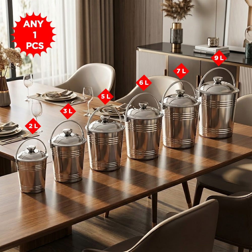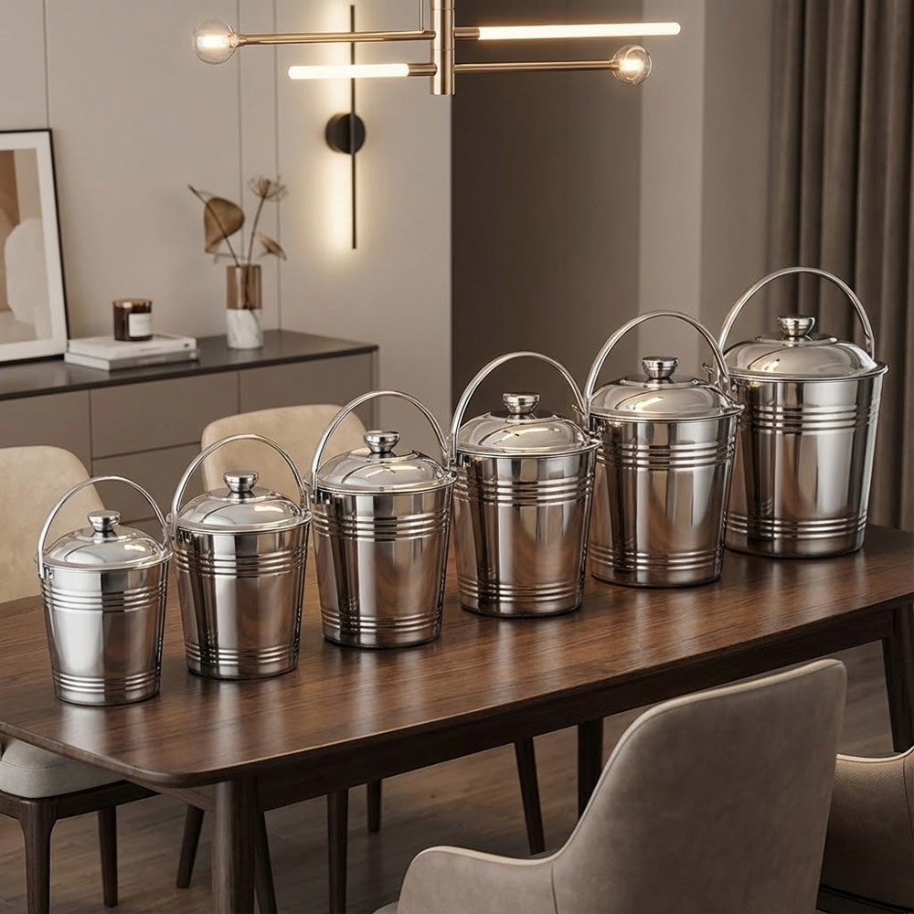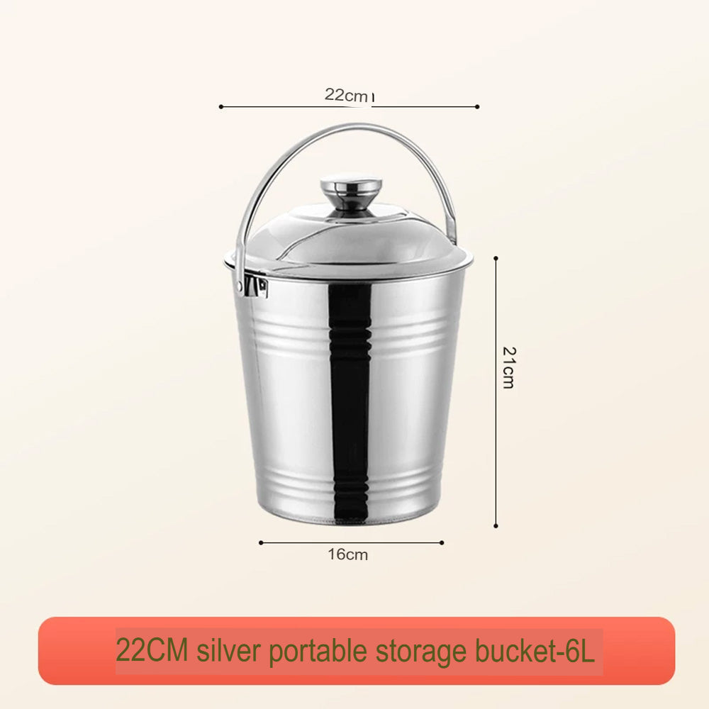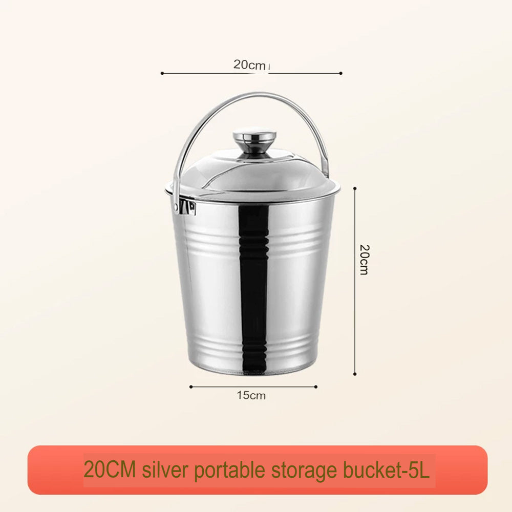 يتميز الدلو بغطاء محكم لحماية محتوياته من الغبار والرطوبة، ومقبض قوي لسهولة النقل. بفضل لونه الفضي الأنيق، يُناسب المطابخ، والمنازل، والمطاعم، والاستخدام الخارجي.