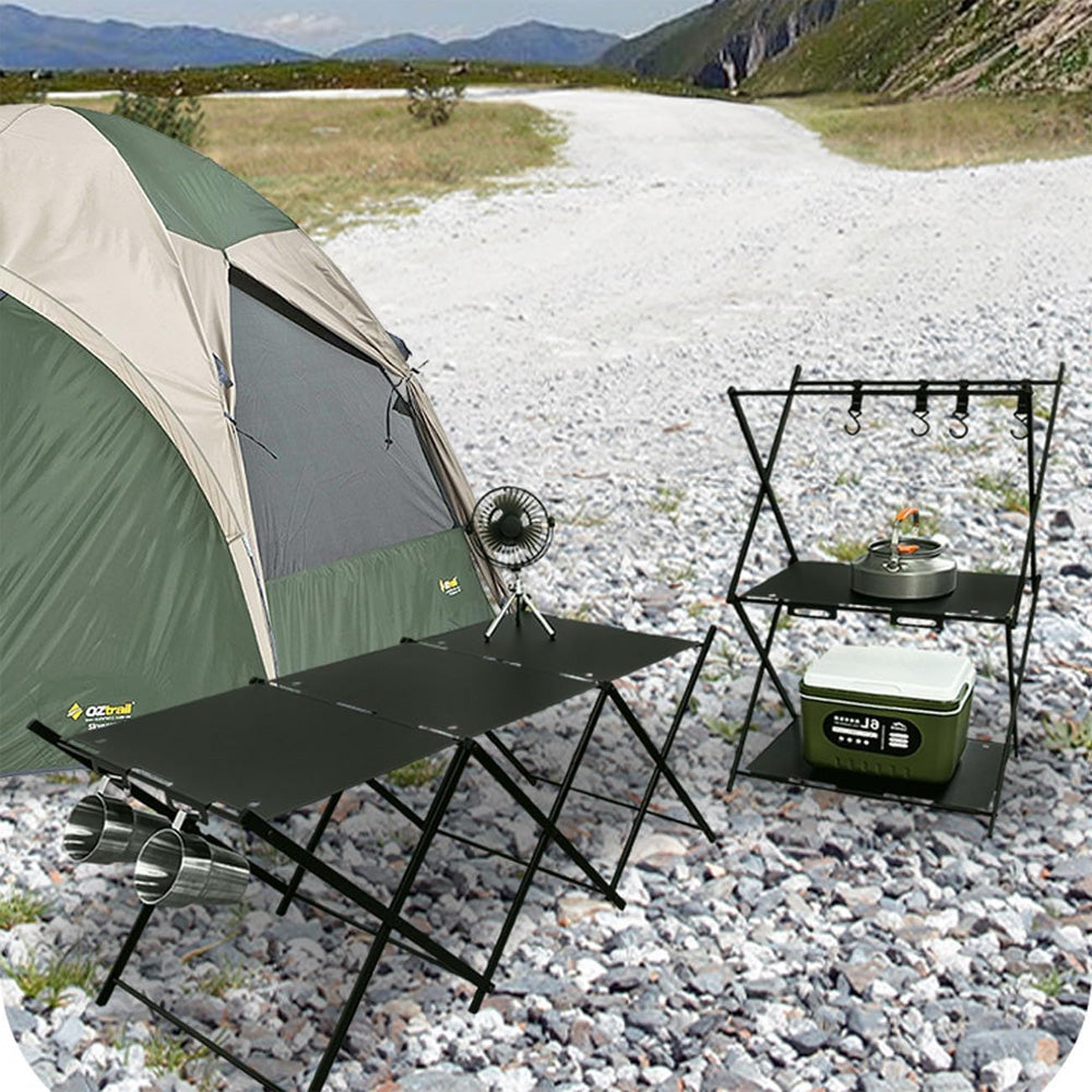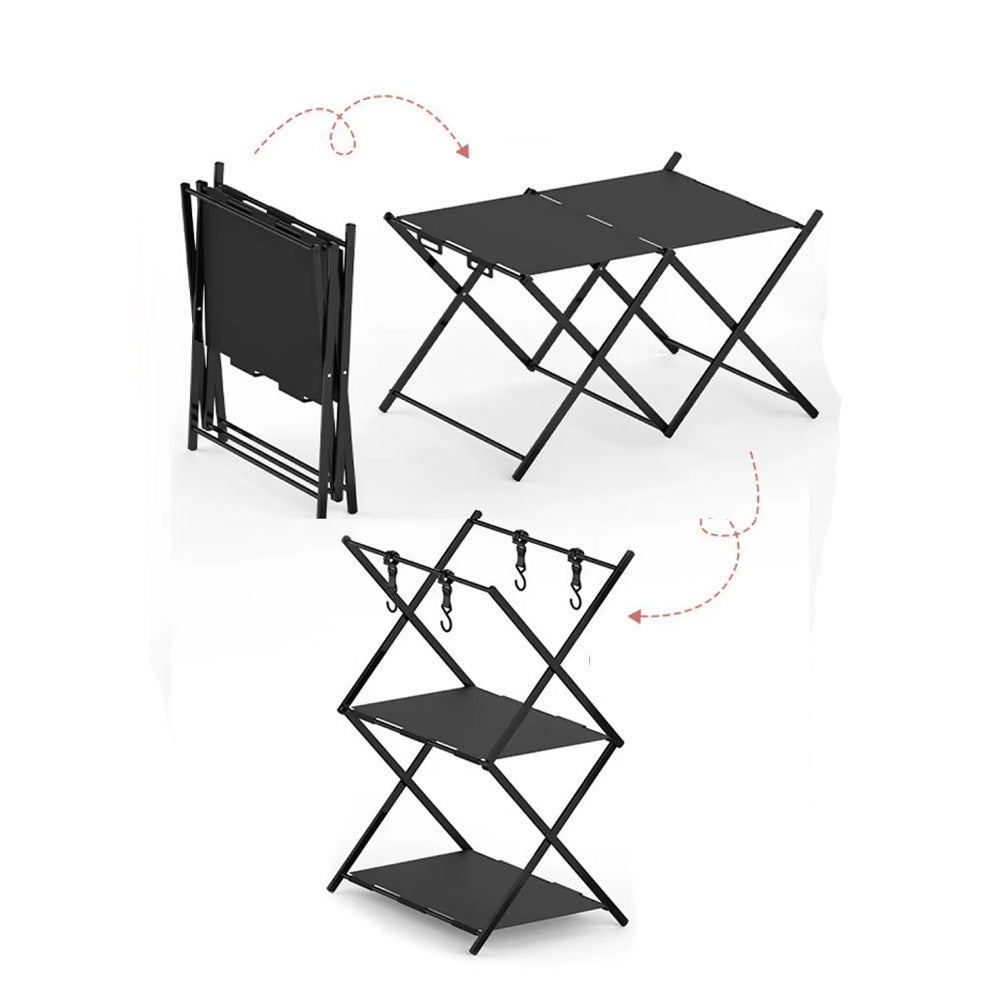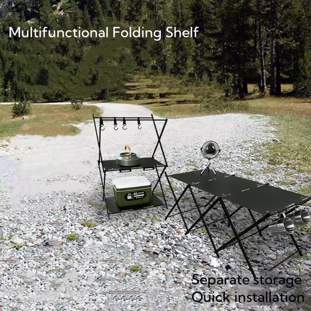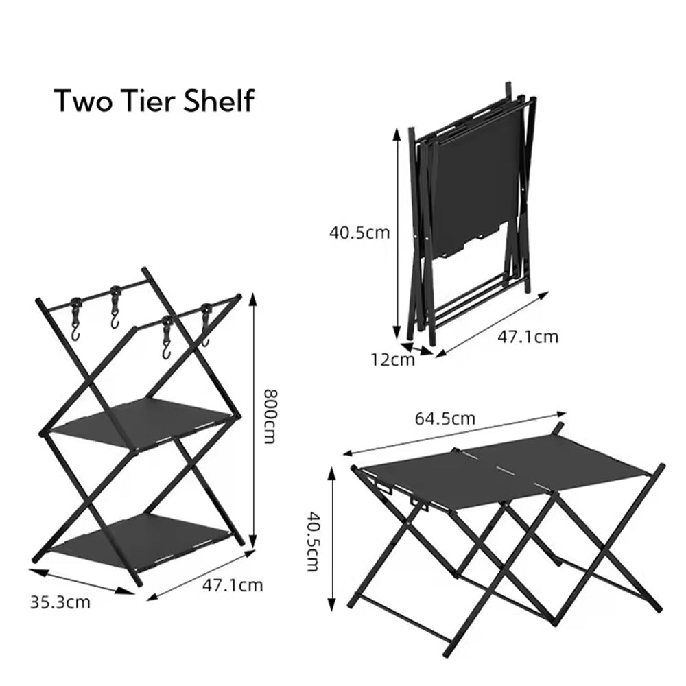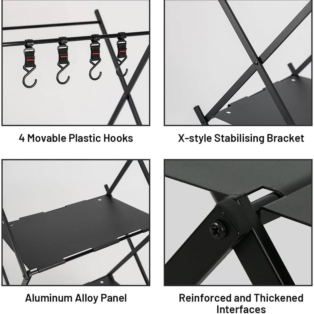 وظائف متعددة: تنوع في أفضل حالاته! يمكن أن تعمل أرفف المنظم هذه كرف من طبقتين أو تتحول بسهولة إلى طاولة جانبية مريحة للتخييم. مناسبة تمامًا لمجموعة واسعة من الأنشطة الخارجية. يأتي كل رف مع 4 خطافات بلاستيكية فولاذية متحركة، والتي يمكن استخدامها لضبط موضع العناصر في أي وقت لسهولة الوصول إليها.