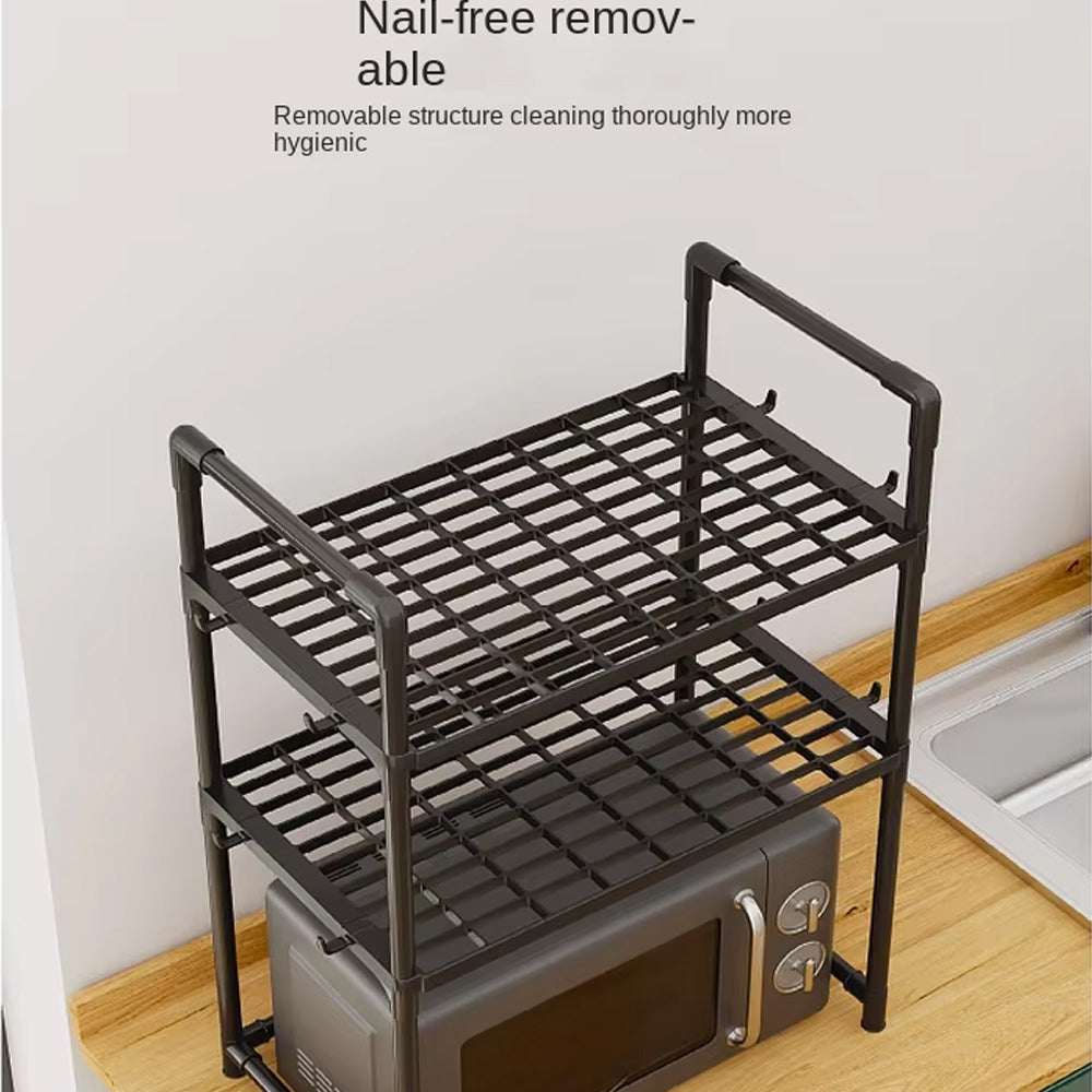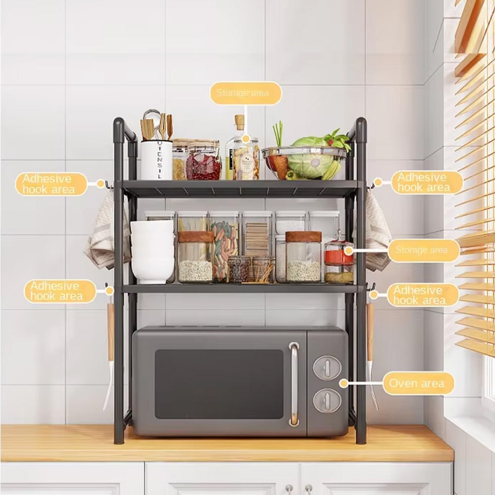 رف تخزين موفر للمساحة للميكروويف، مزود بأرفف متينة وخطافات جانبية للأواني. متوفر بتصميمين من طابق واحد وطابقين، يُساعد على تنظيم التوابل والبرطمانات وأدوات المطبخ، مع توفير مساحة على سطح العمل.
