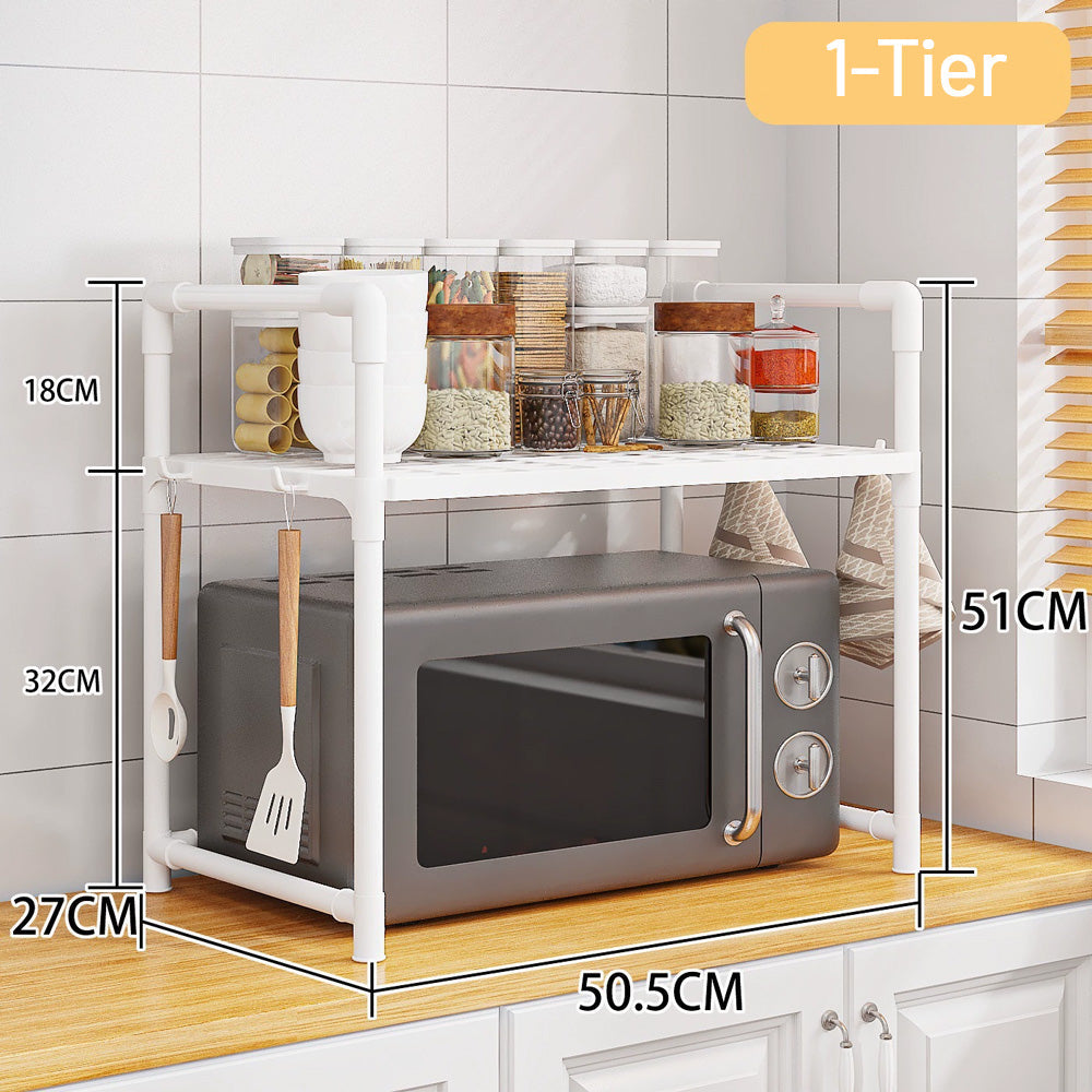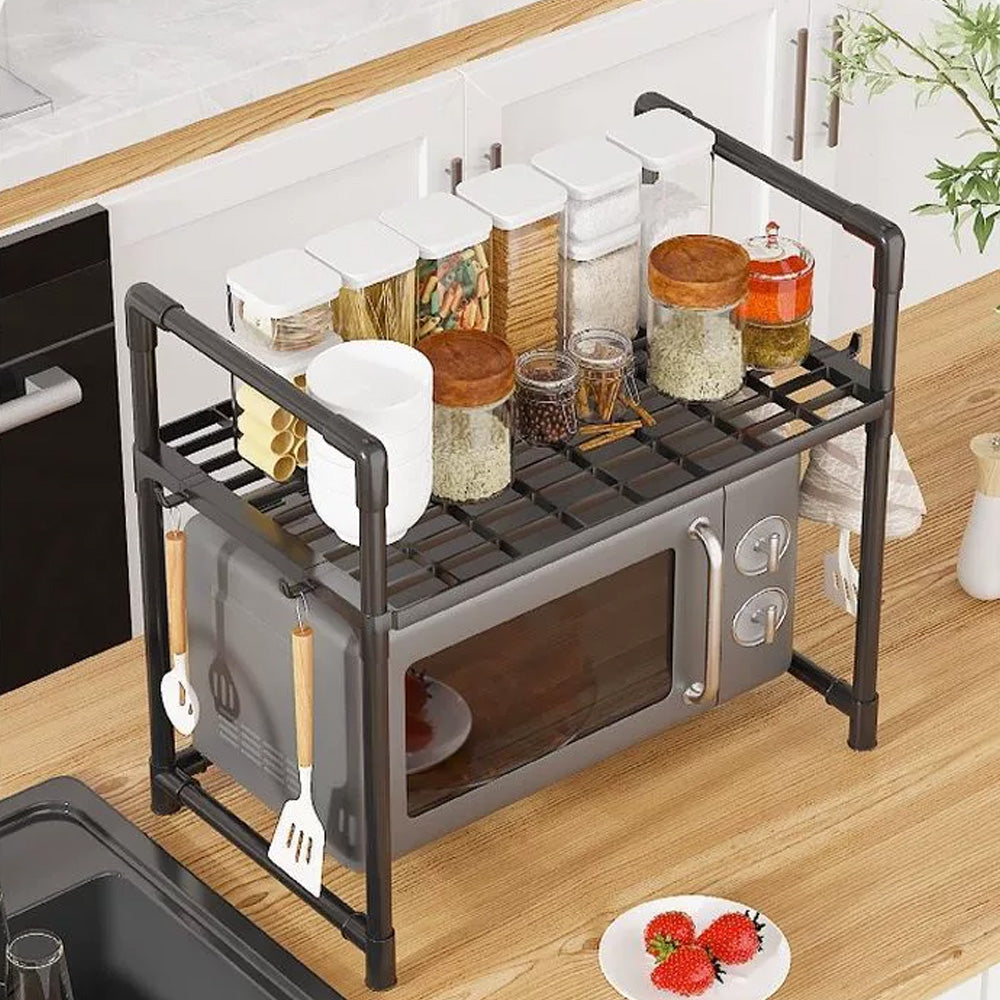 رف تخزين موفر للمساحة للميكروويف، مزود بأرفف متينة وخطافات جانبية للأواني. متوفر بتصميمين من طابق واحد وطابقين، يُساعد على تنظيم التوابل والبرطمانات وأدوات المطبخ، مع توفير مساحة على سطح العمل.