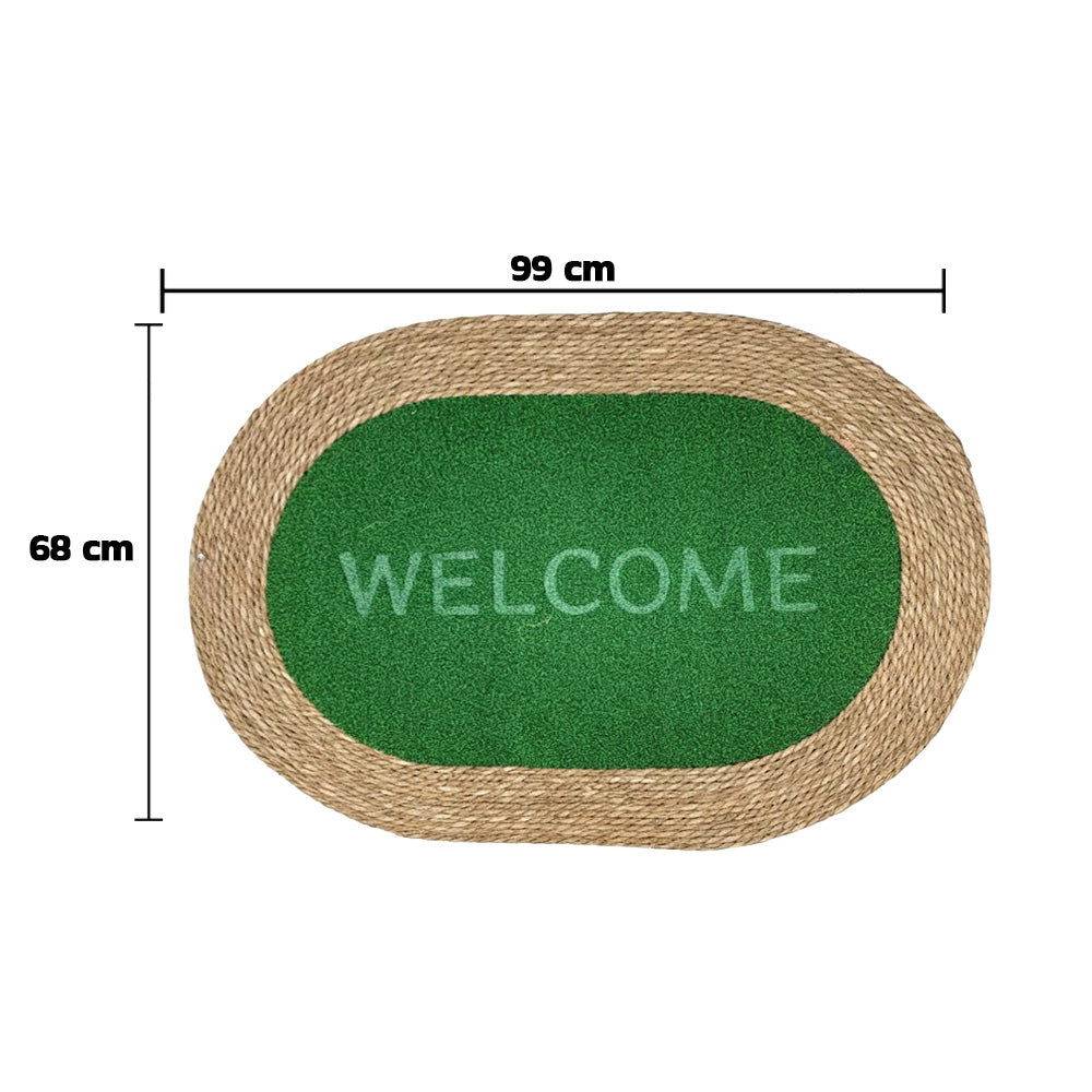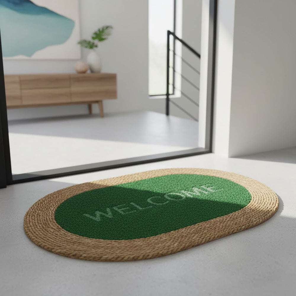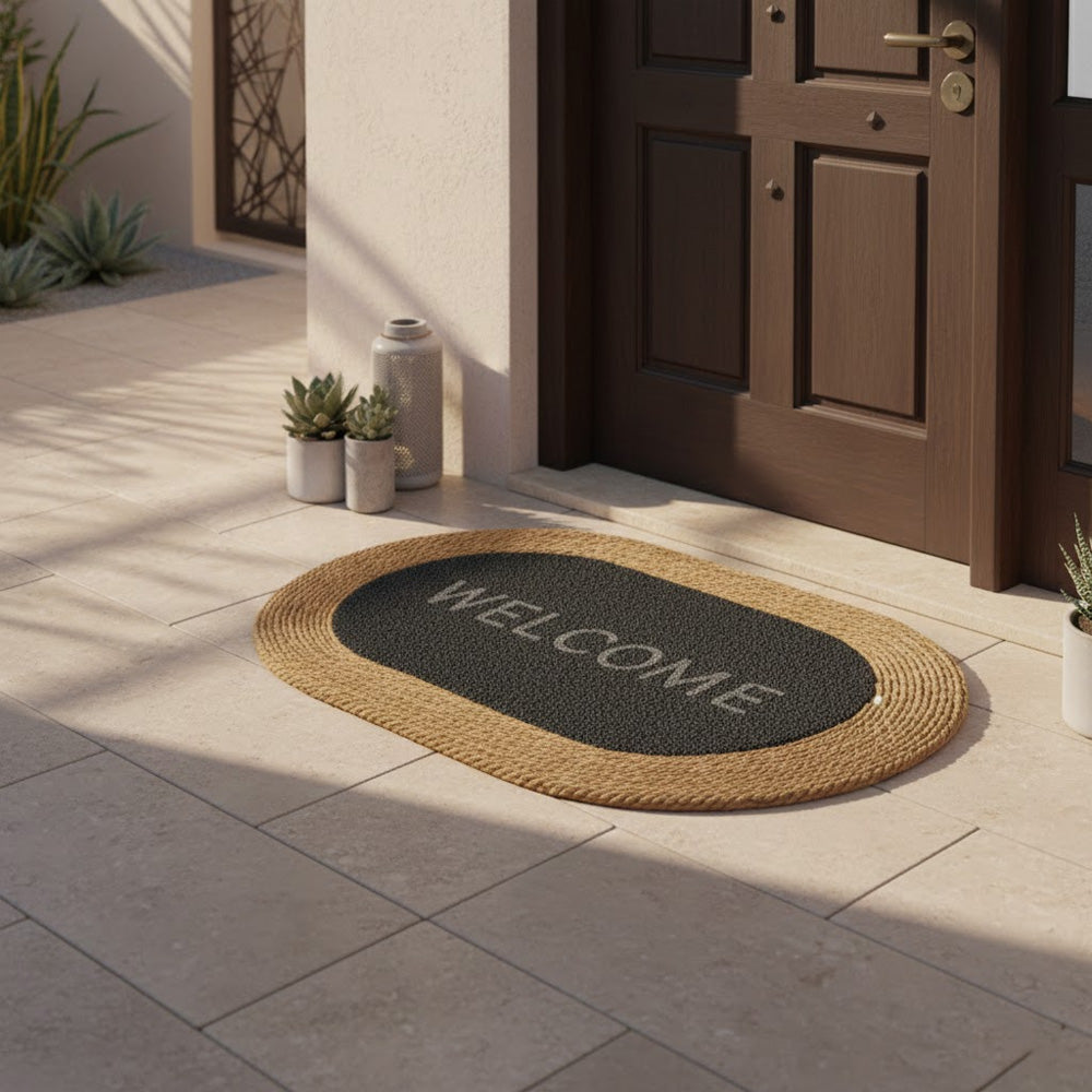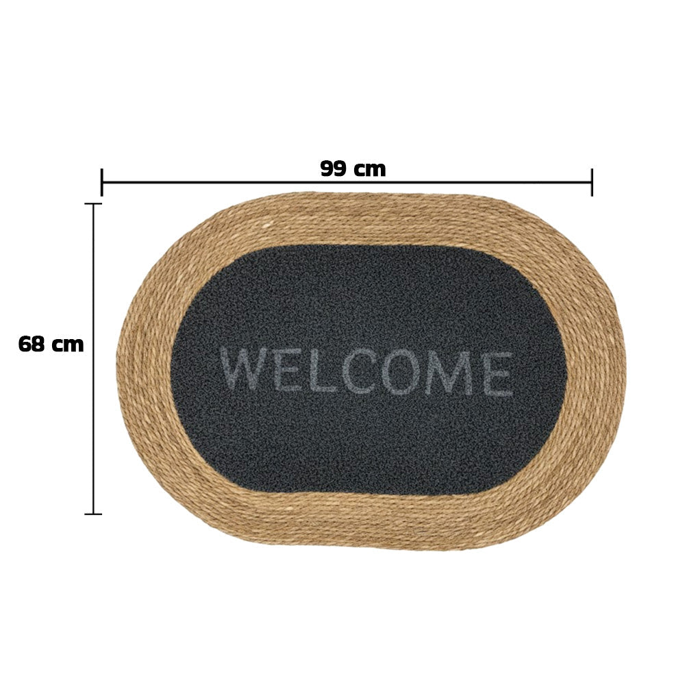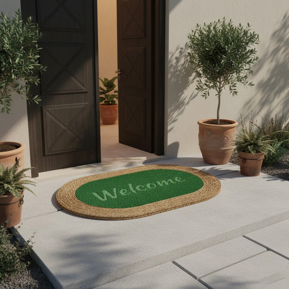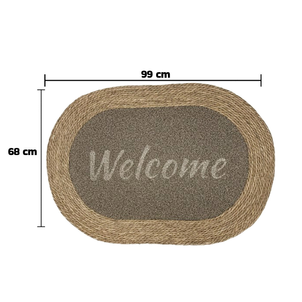 سجادة باب مستطيلة الشكل، ذات حافة مضفرة من الجوت الطبيعي ومركز مزخرف بنقشة "مرحباً". مصممة لحجز الأوساخ والغبار، وتضفي لمسة دافئة وجذابة على مدخل منزلك. متينة ومناسبة للاستخدام اليومي عند المداخل، في الداخل أو في الأماكن شبه الخارجية. المقاس: 99 × 68 سم.