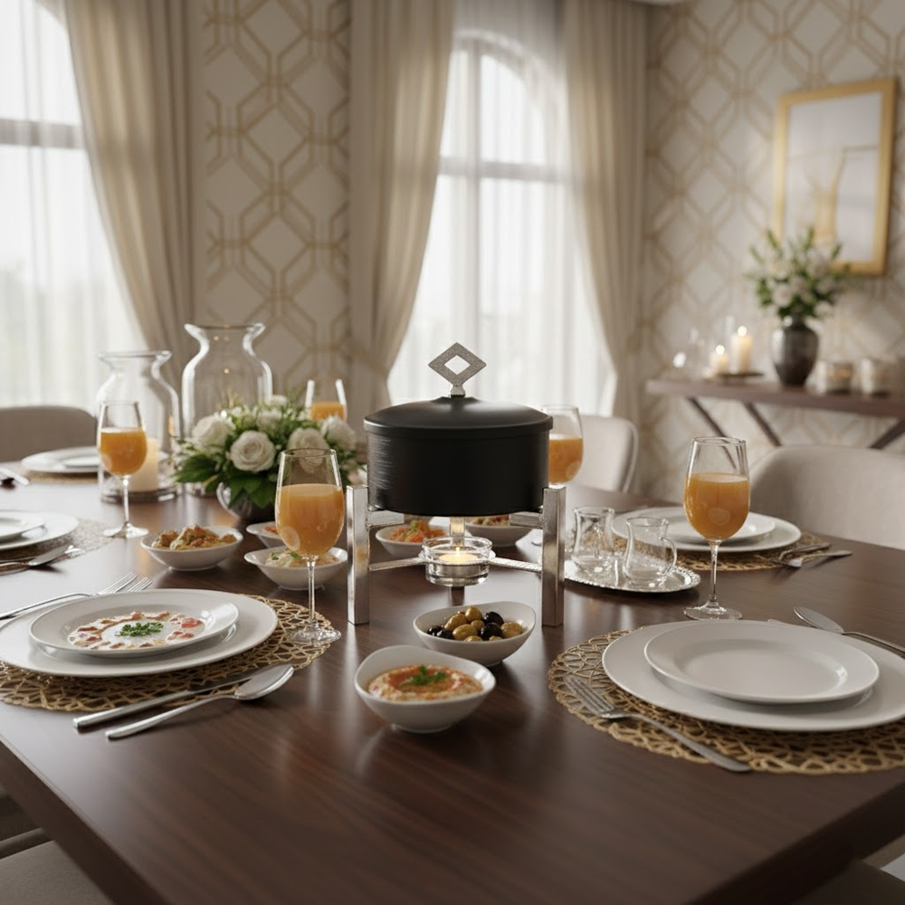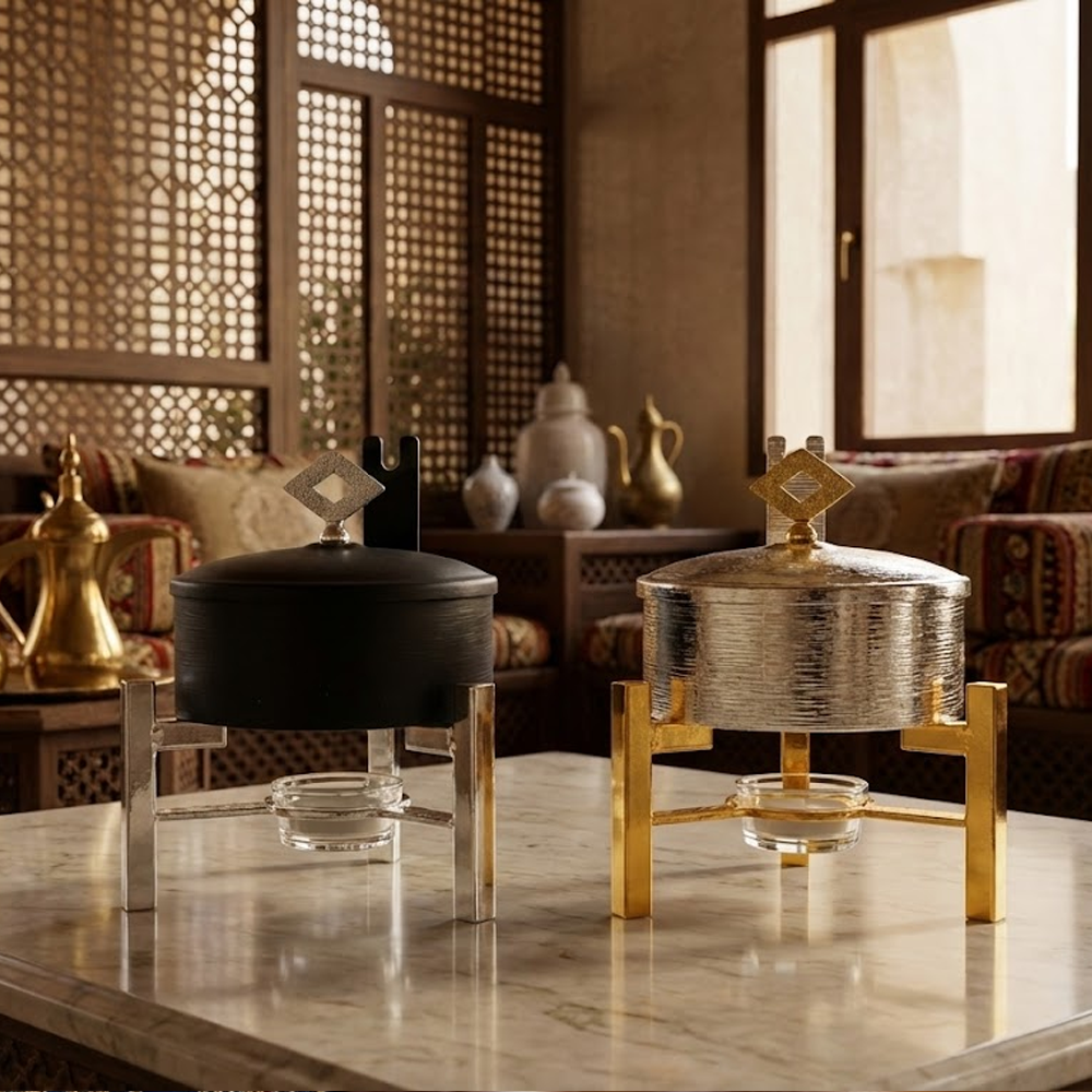 أضيفي لمسة من الفخامة والدفء إلى مائدتك! استمتعي بتقديم أشهى الأطباق والمقبلات وهي ساخنة وبأرقى صورة مع سخان الضيافة الميني ذو التصميم العصري. هذا السخان ليس مجرد وعاء تقديم، بل هو قطعة ديكور فنية تزيد من جمال سفرتك، مثالي للعزائم، البوفيهات المنزلية، وتقديمات شهر رمضان المبارك.