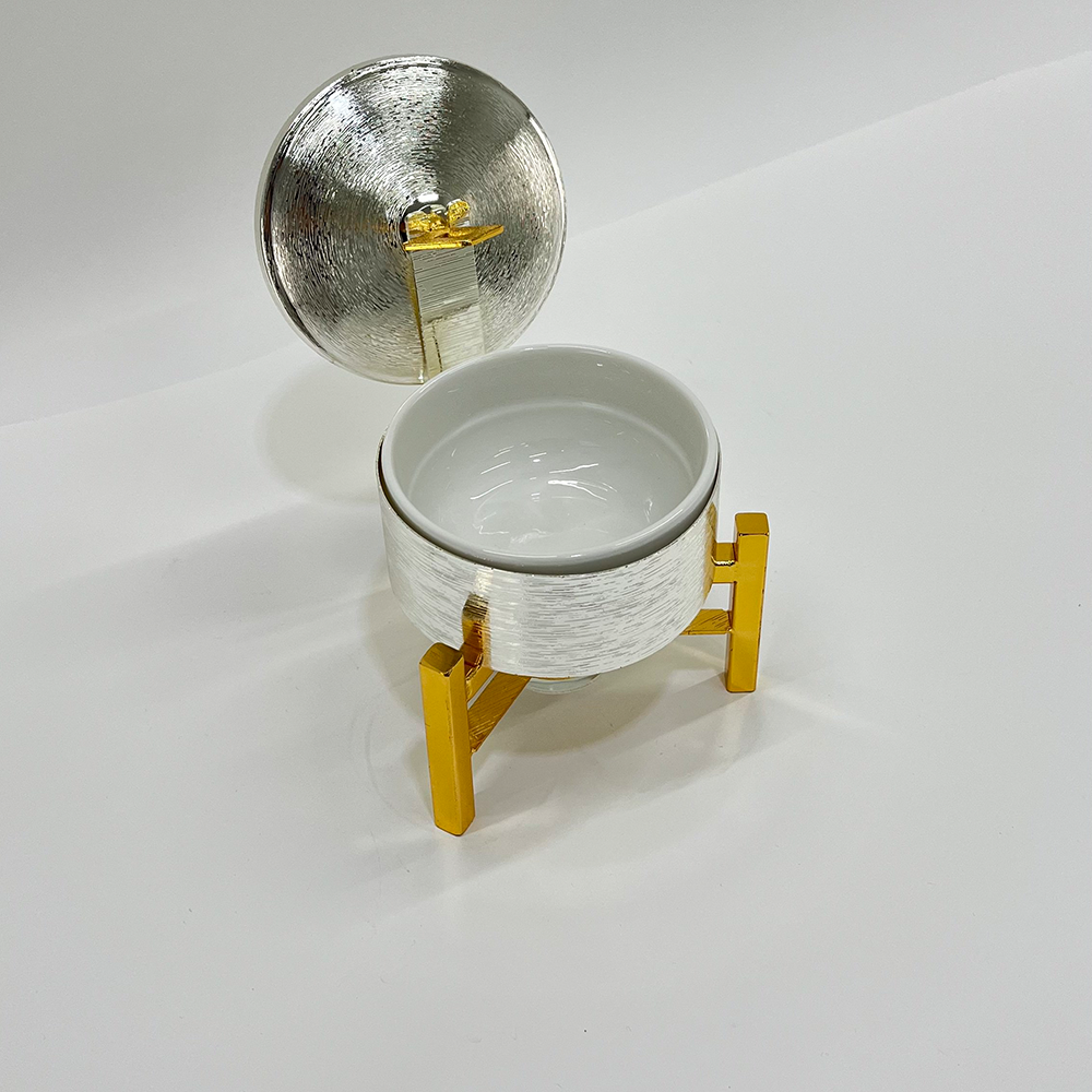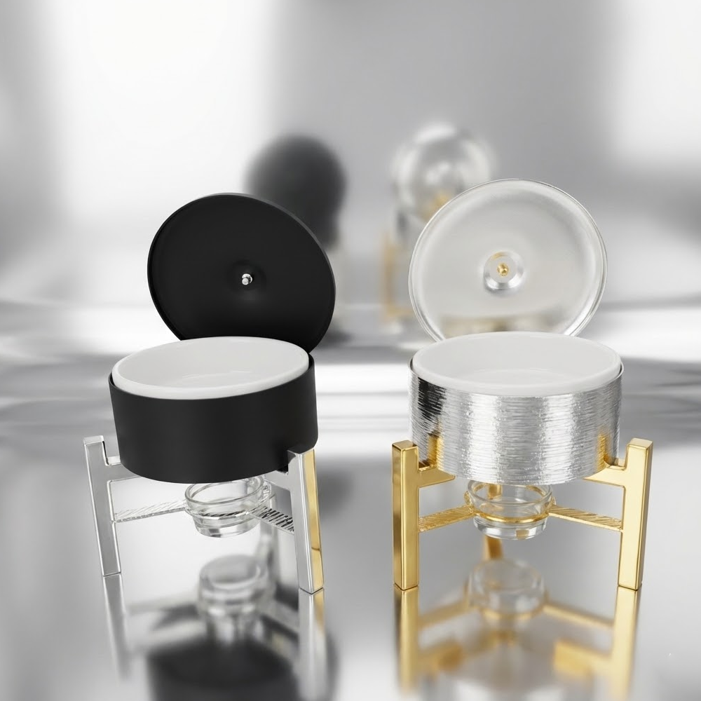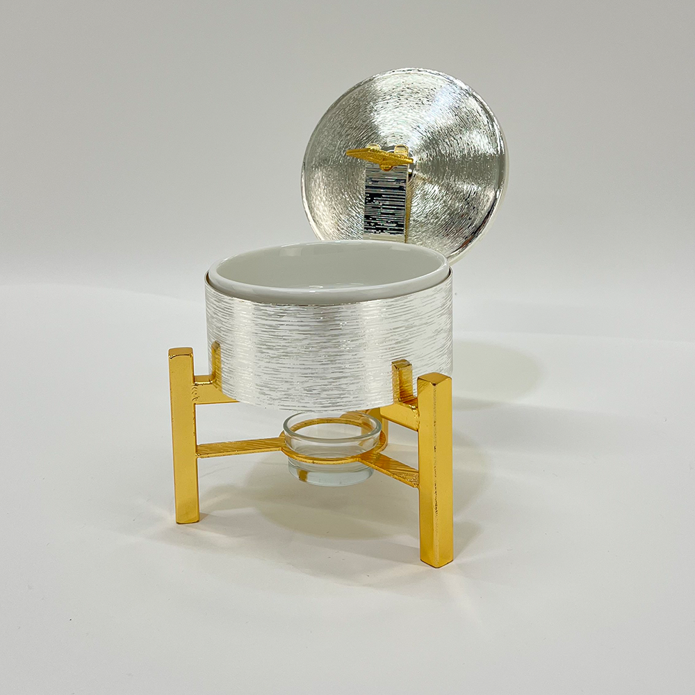 سخان ضيافة "ميني" فاخر بغطاء وقاعدة معدنية | وعاء تقديم بورسلان مع تسخين بالشمع | (متوفر باللونين الأسود والفضي)