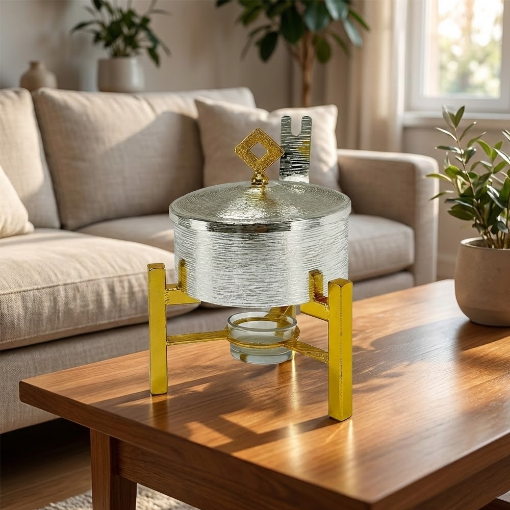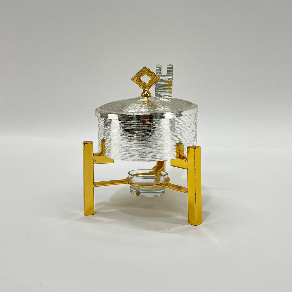 الفضي المنسوج: وعاء فضي بتشطيب بارز ومميز مع قاعدة ذهبية فاخرة (للمظهر الكلاسيكي).