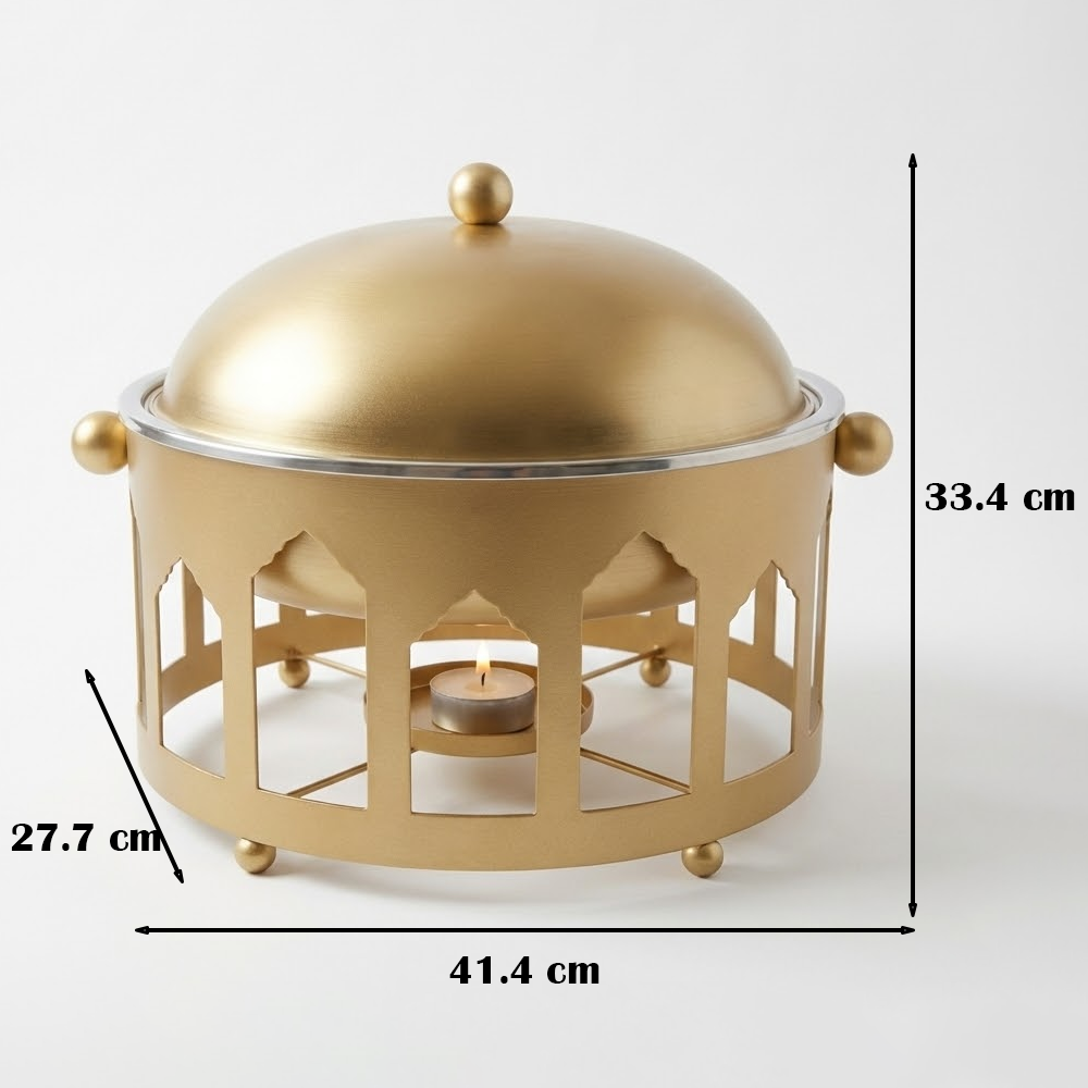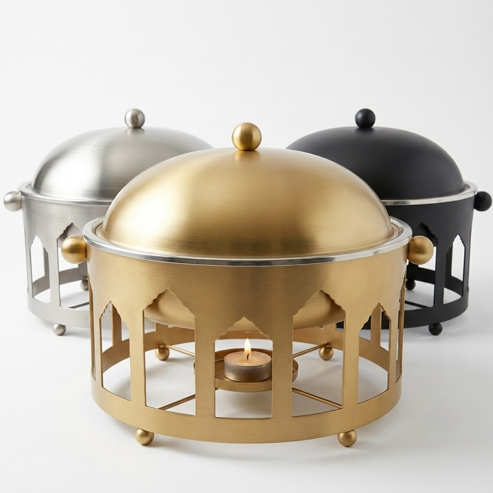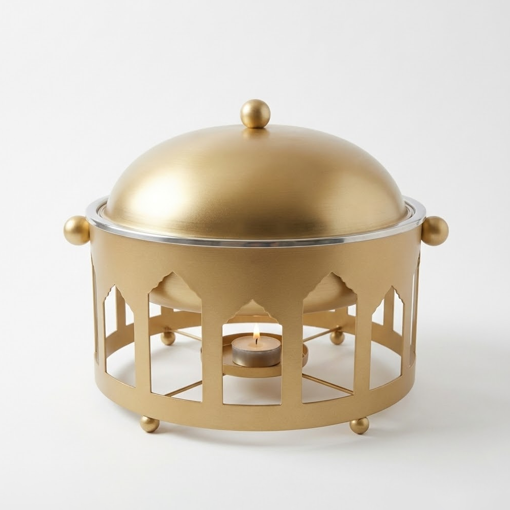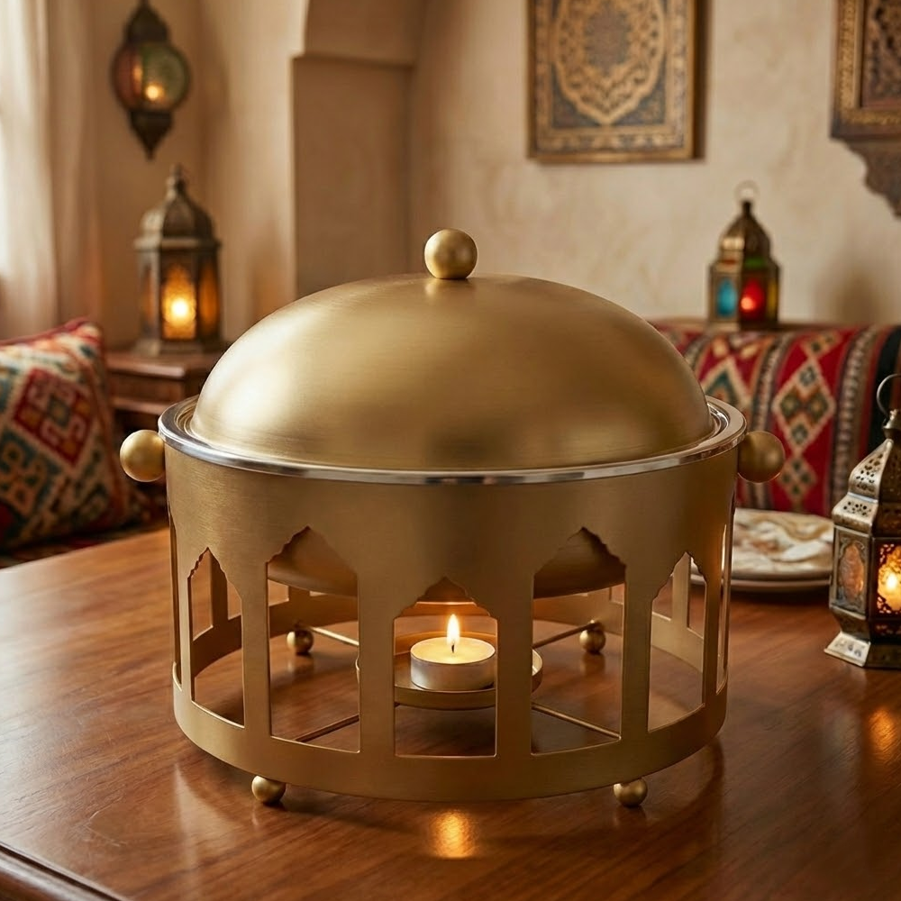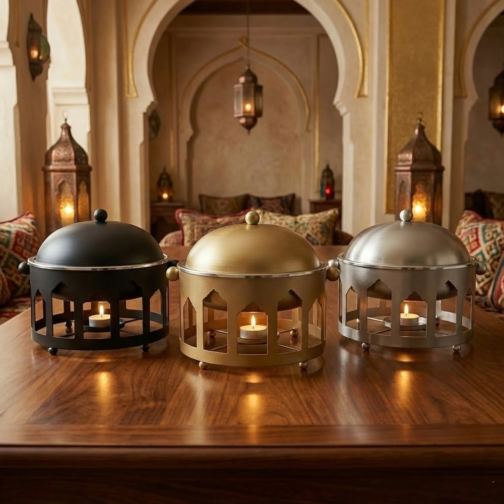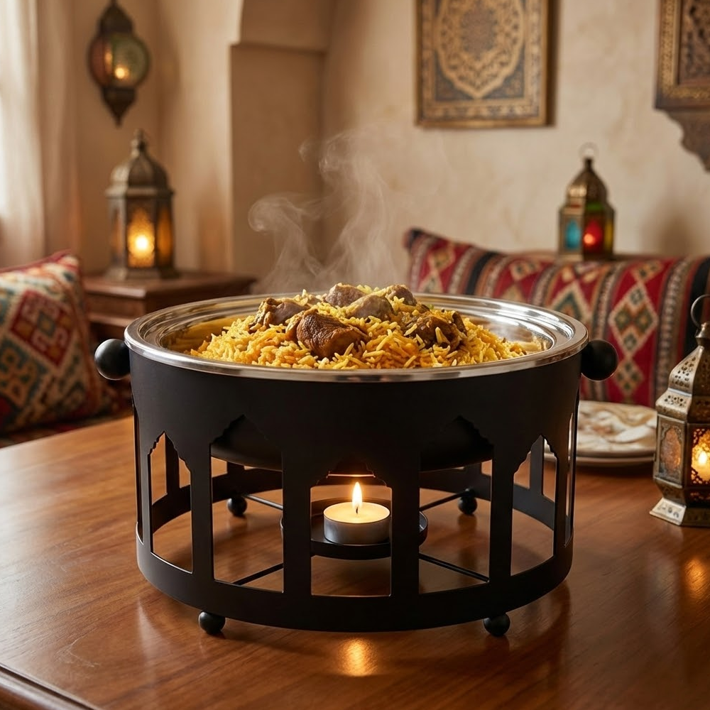 يتميز التصميم بهيكل معدني متين مع فتحات هندسية أنيقة مستوحاة من الطراز الشرقي، تسمح بتوزيع الحرارة بشكل متوازن مع إضاءة دافئة تضفي أجواء راقية أثناء التقديم.