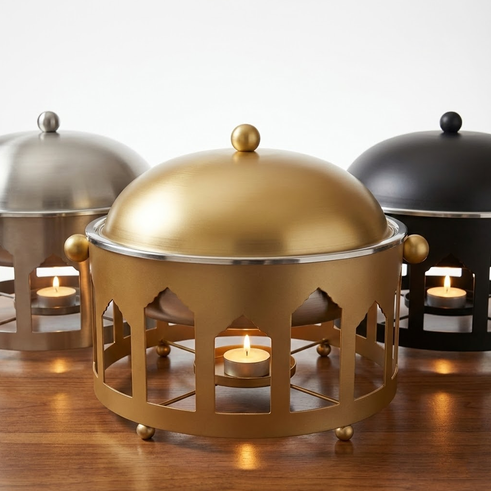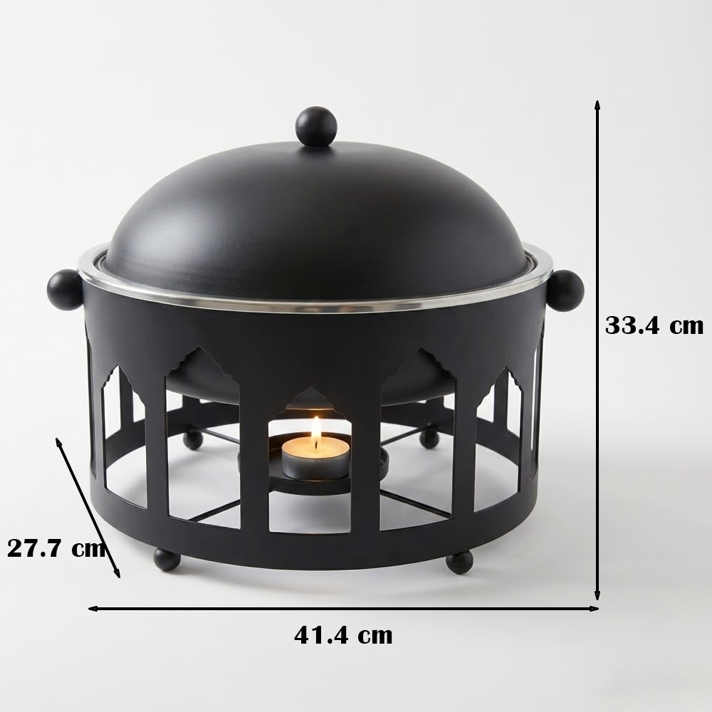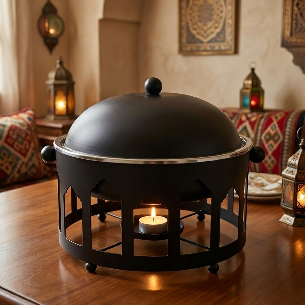 الغطاء المعدني نصف الكروي يساعد على الحفاظ على سخونة الطعام ونكهته لفترة أطول، بينما يعمل نظام التسخين بالشمعة السفلية (Tea Light) على توفير حرارة ثابتة وآمنة دون الحاجة للكهرباء.