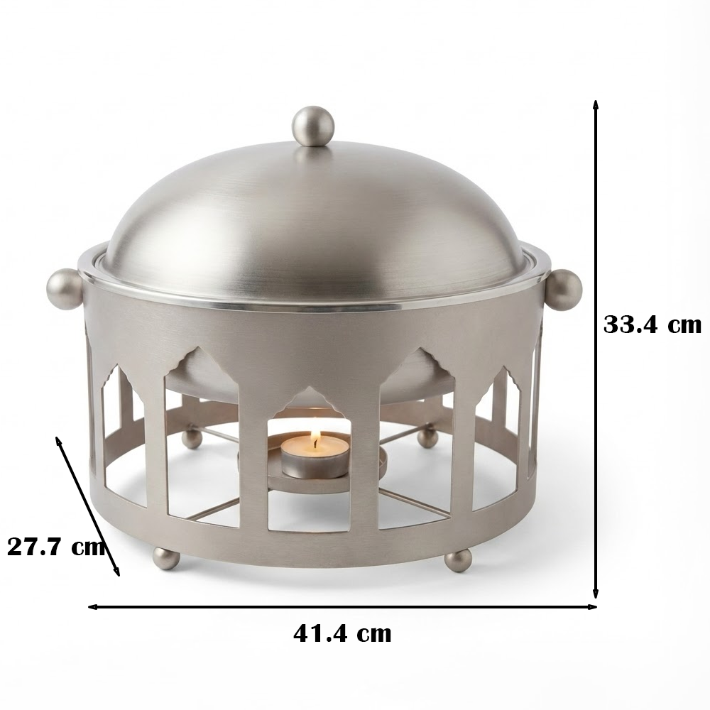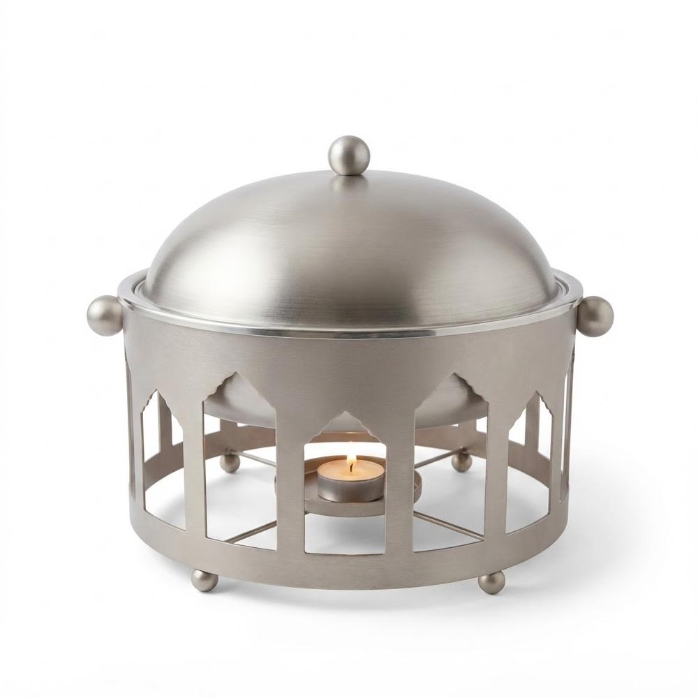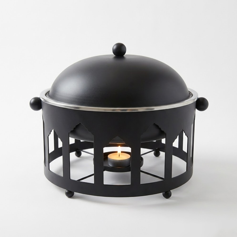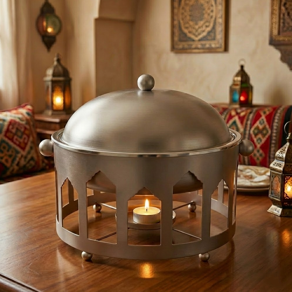 الغطاء المعدني نصف الكروي يساعد على الحفاظ على سخونة الطعام ونكهته لفترة أطول، بينما يعمل نظام التسخين بالشمعة السفلية (Tea Light) على توفير حرارة ثابتة وآمنة دون الحاجة للكهرباء.