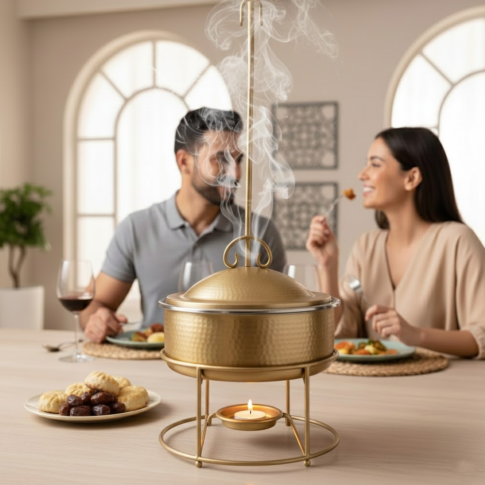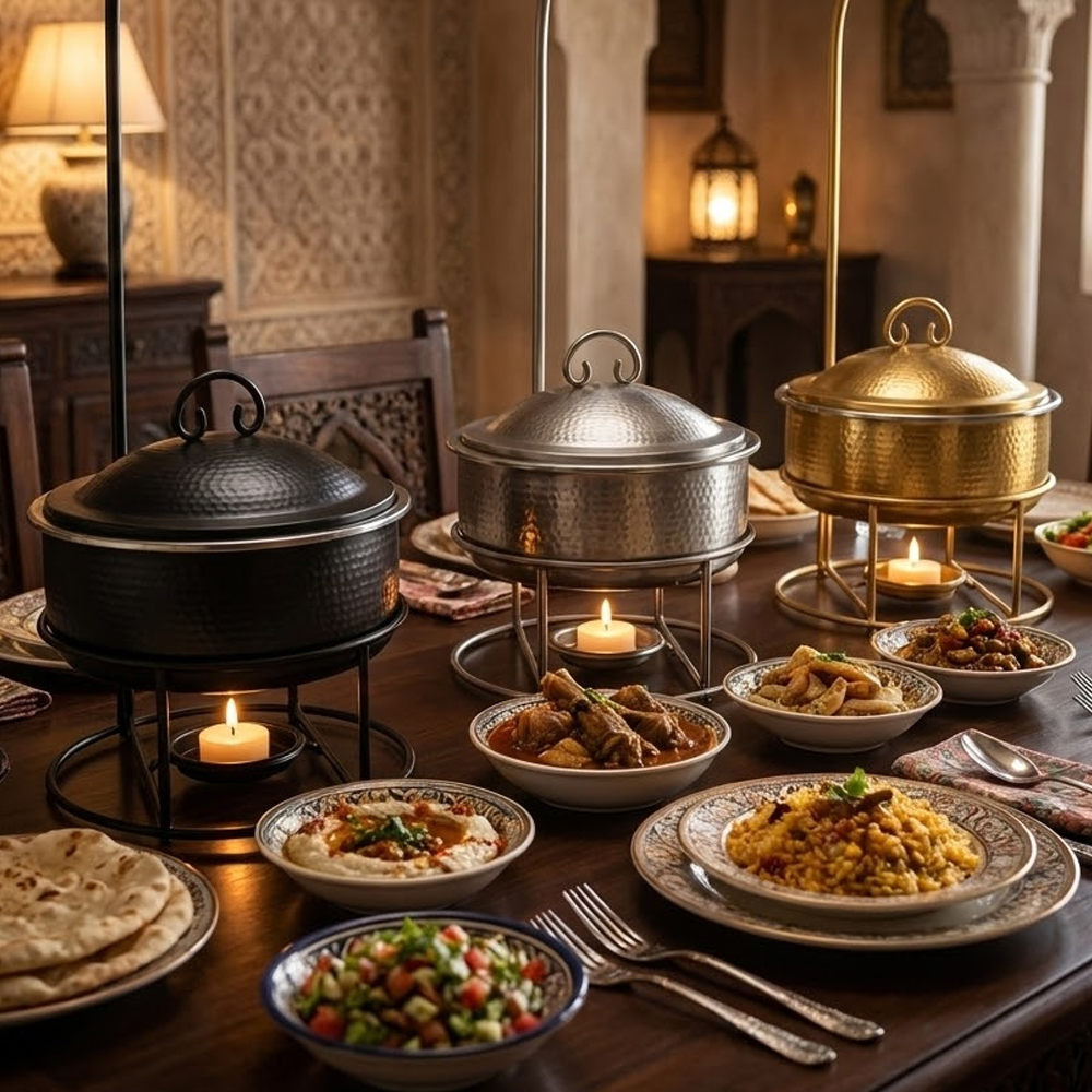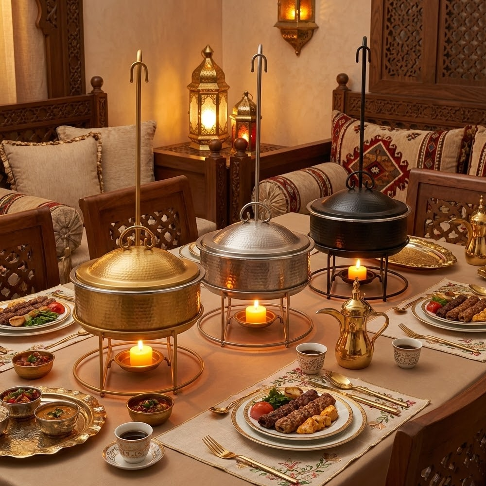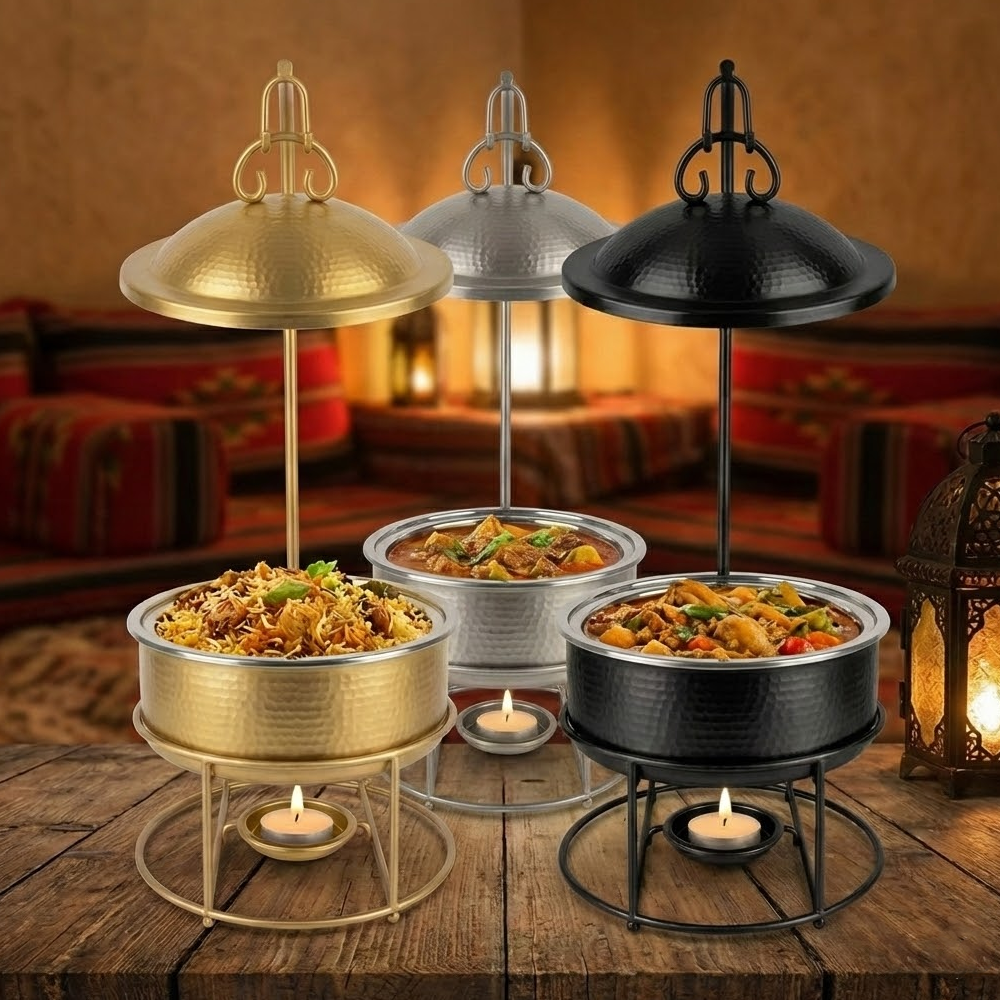 نظام التسخين بالشمعة السفلية يمنح حرارة متوازنة وآمنة، مثالي لتقديم الأرز، اليخنات، الكبسة، الشوربة، والأطباق الساخنة.