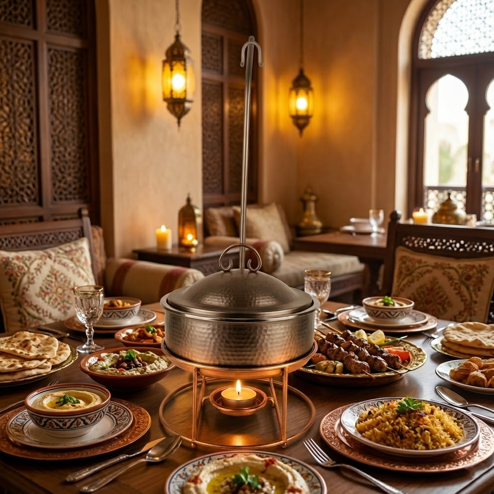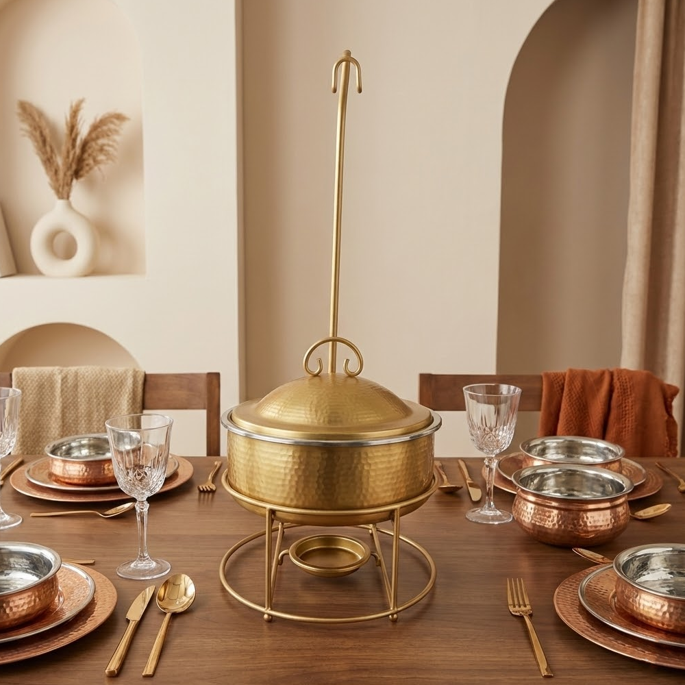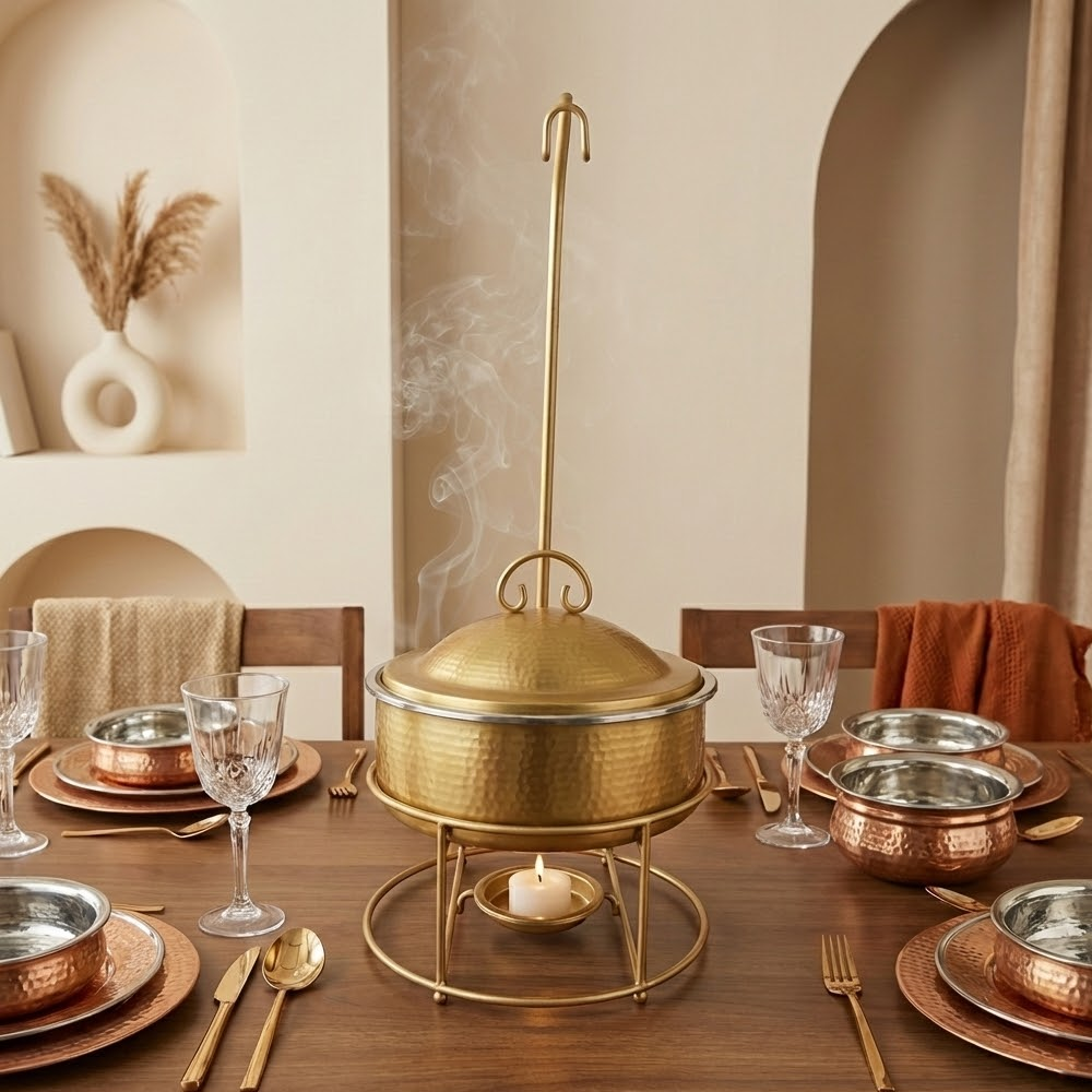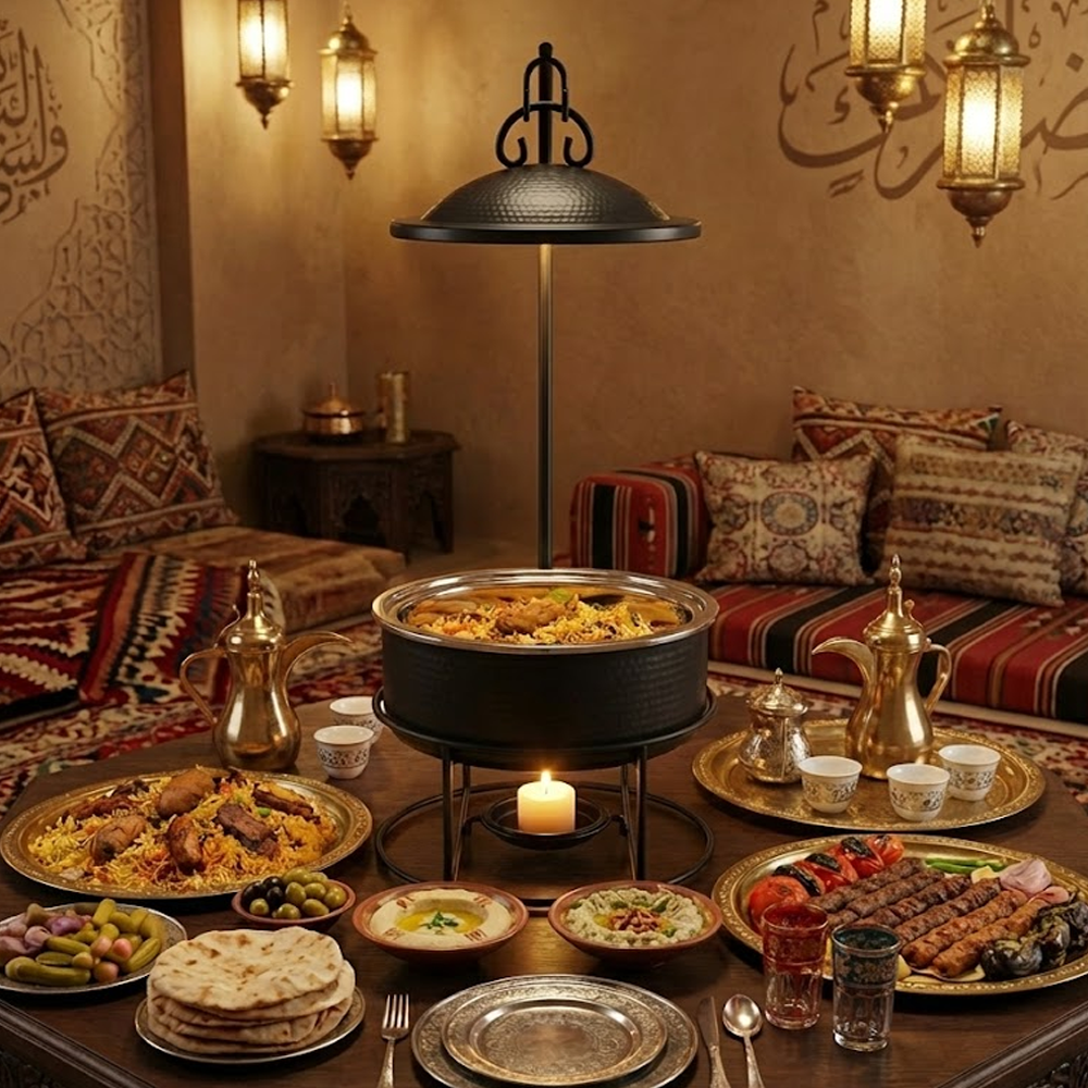نظام التسخين بالشمعة السفلية يمنح حرارة متوازنة وآمنة، مثالي لتقديم الأرز، اليخنات، الكبسة، الشوربة، والأطباق الساخنة.