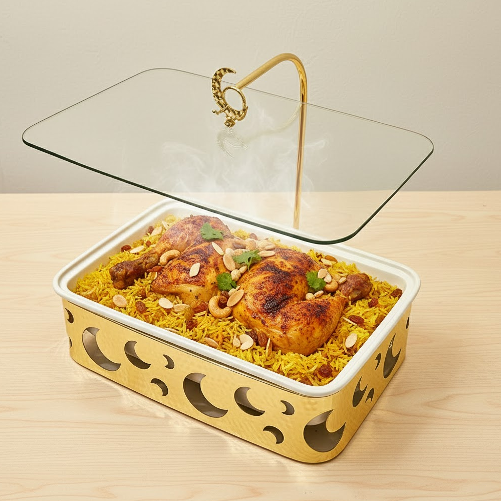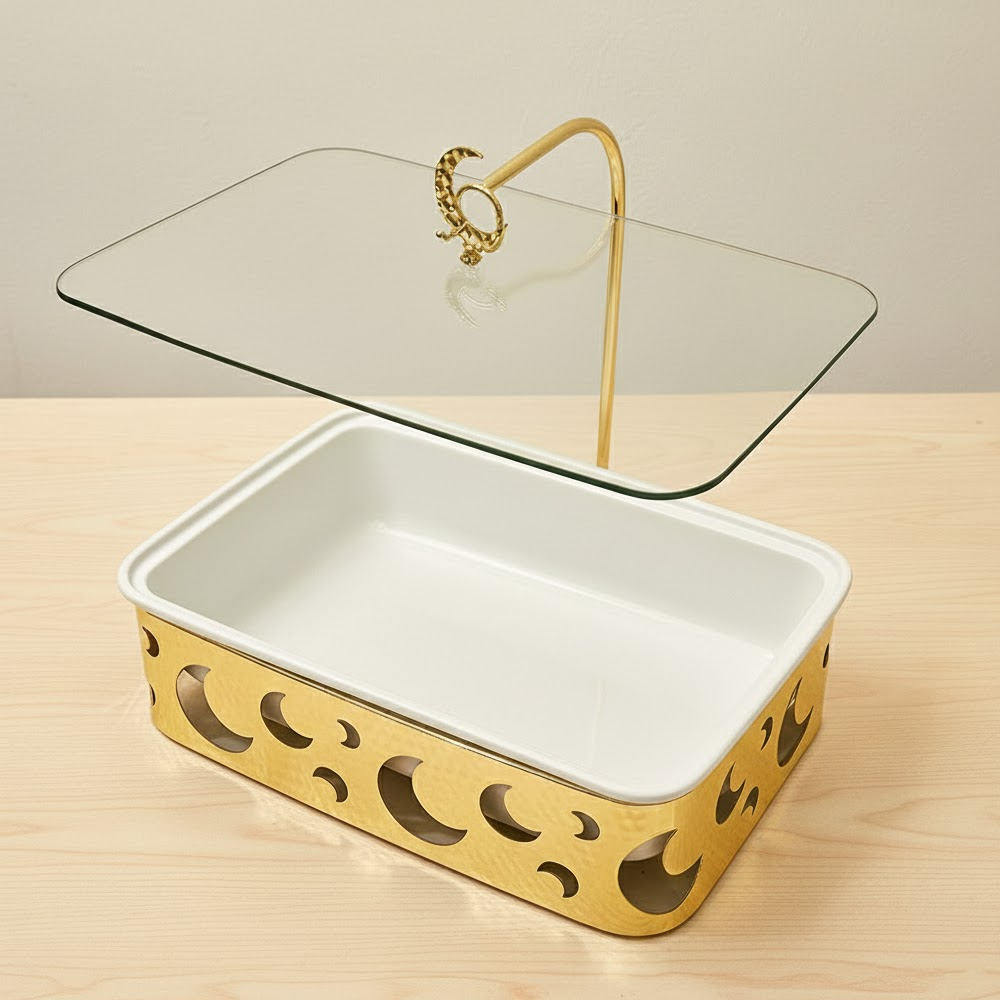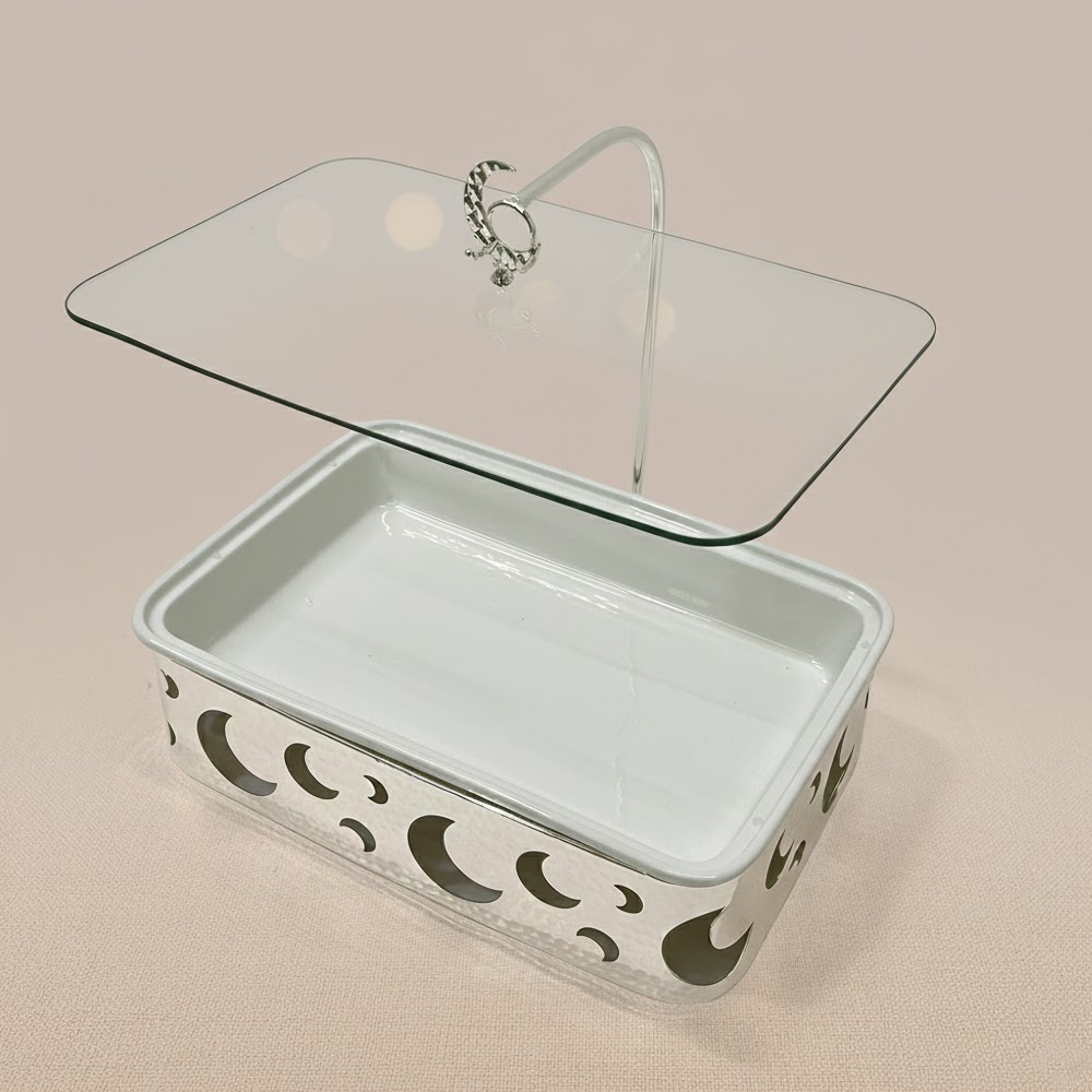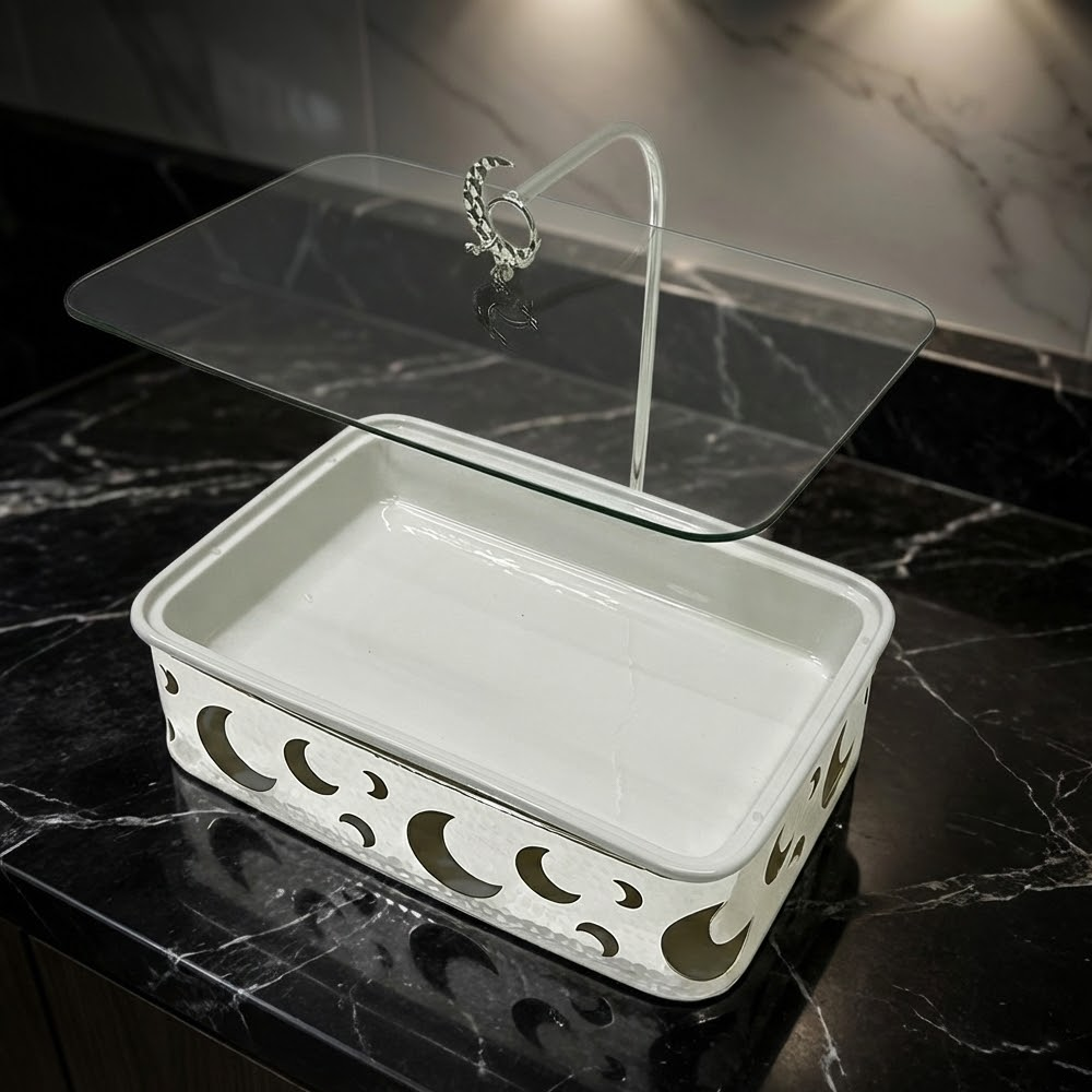الغطاء الزجاجي الشفاف يمنحك رؤية واضحة لمحتوى الوعاء مع المحافظة على الطعام دافئًا ونظيفًا، كما أن التصميم العملي يجعله مناسبًا لتقديم الأرز، اللحوم، المعجنات، والحلويات بأسلوب أنيق وجذاب. مثالي للاستخدام اليومي أو في العزائم والولائم الرسمية.