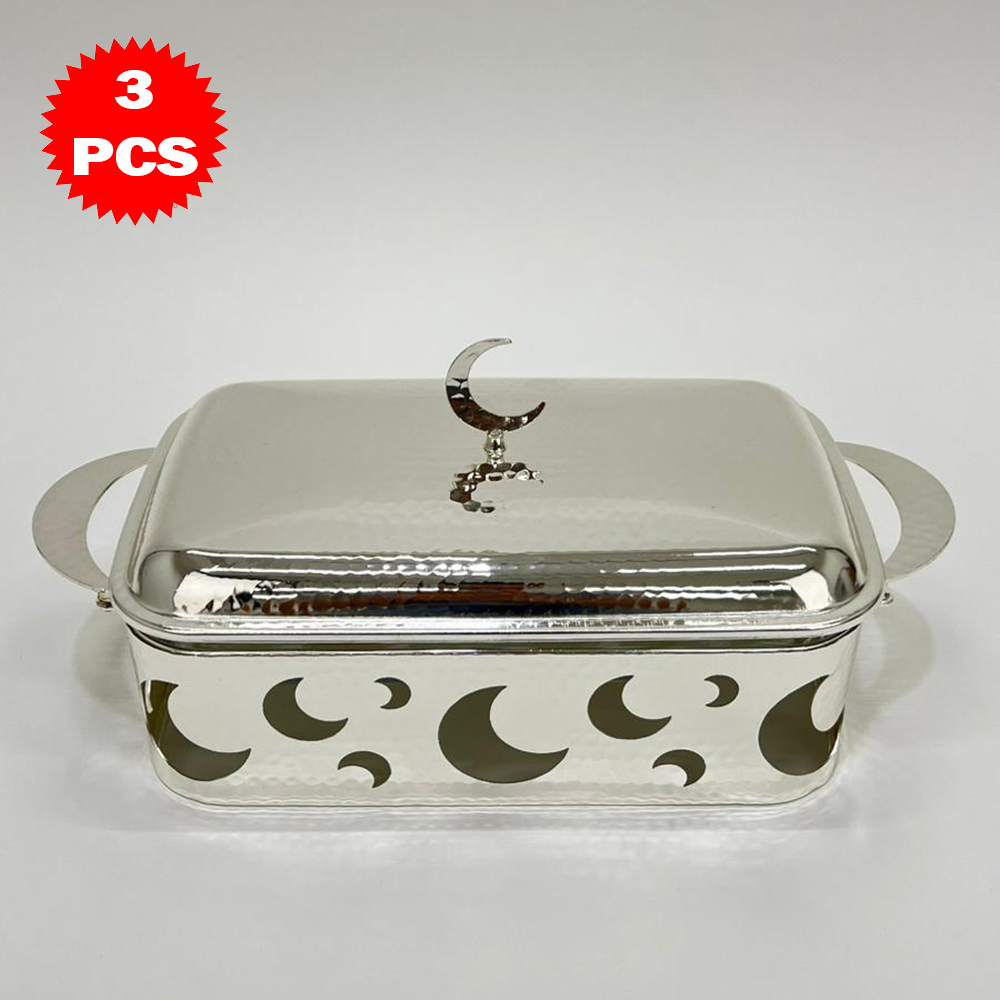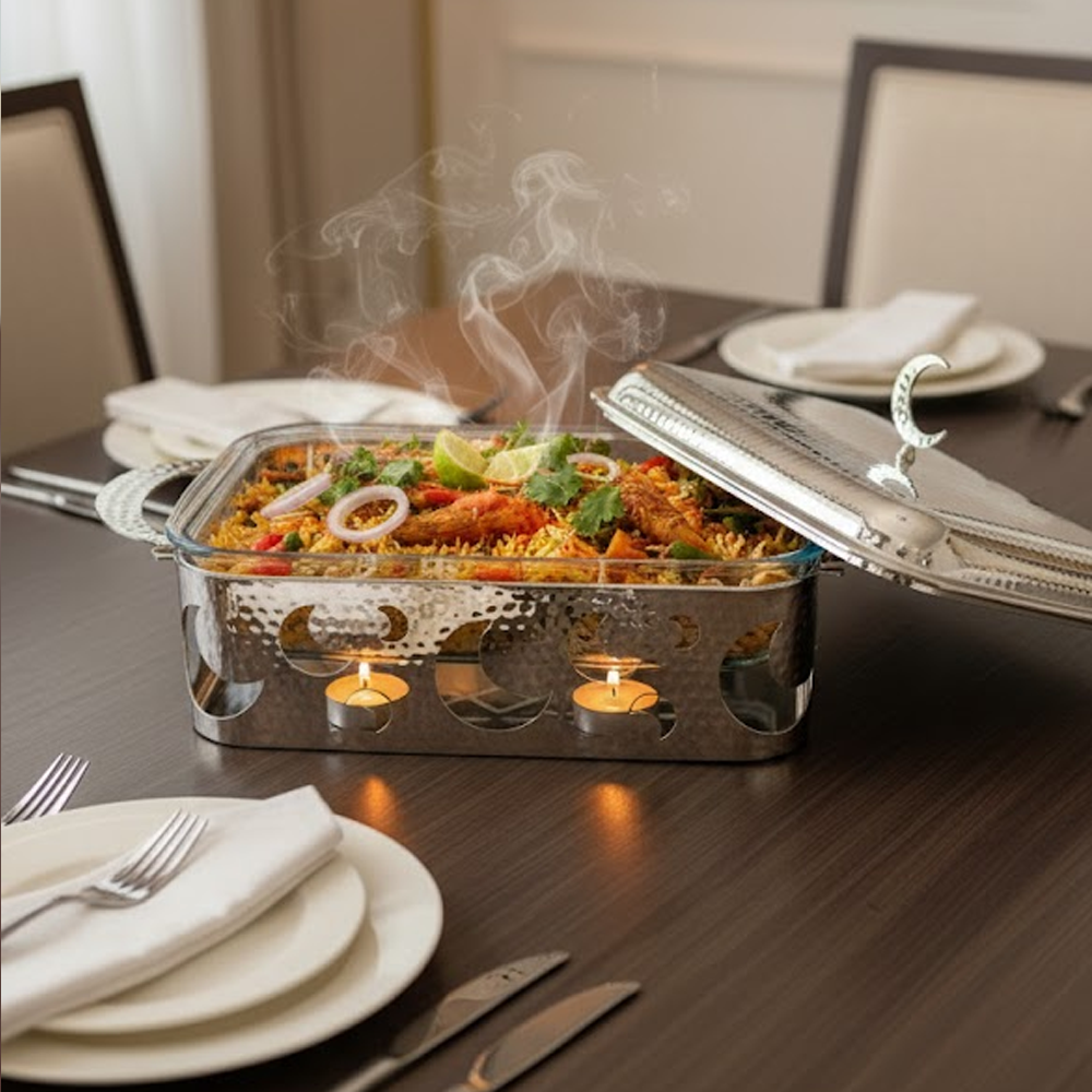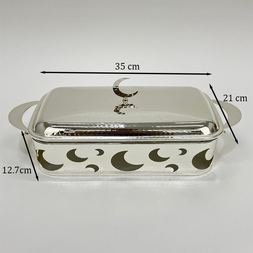 أبهِر ضيوفك بتقديم الطعام بطريقة أنيقة ومميزة مع حافظة التقديم المصنوعة من الستانلس ستيل بنقش الهلال الجذاب. تأتي مزودة بصينية زجاجية (بايركس) مقاومة للحرارة، ويمكن إبقاؤها ساخنة باستخدام الشموع المخصصة أسفل الحافظة.