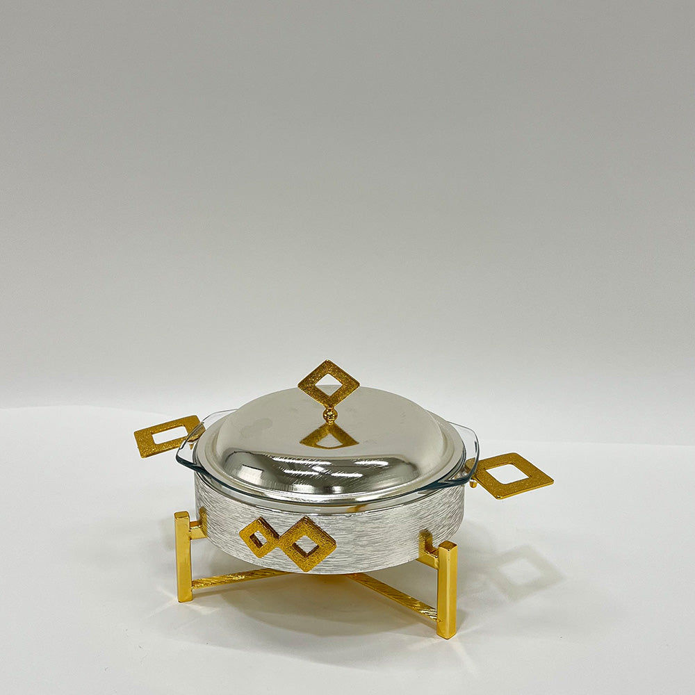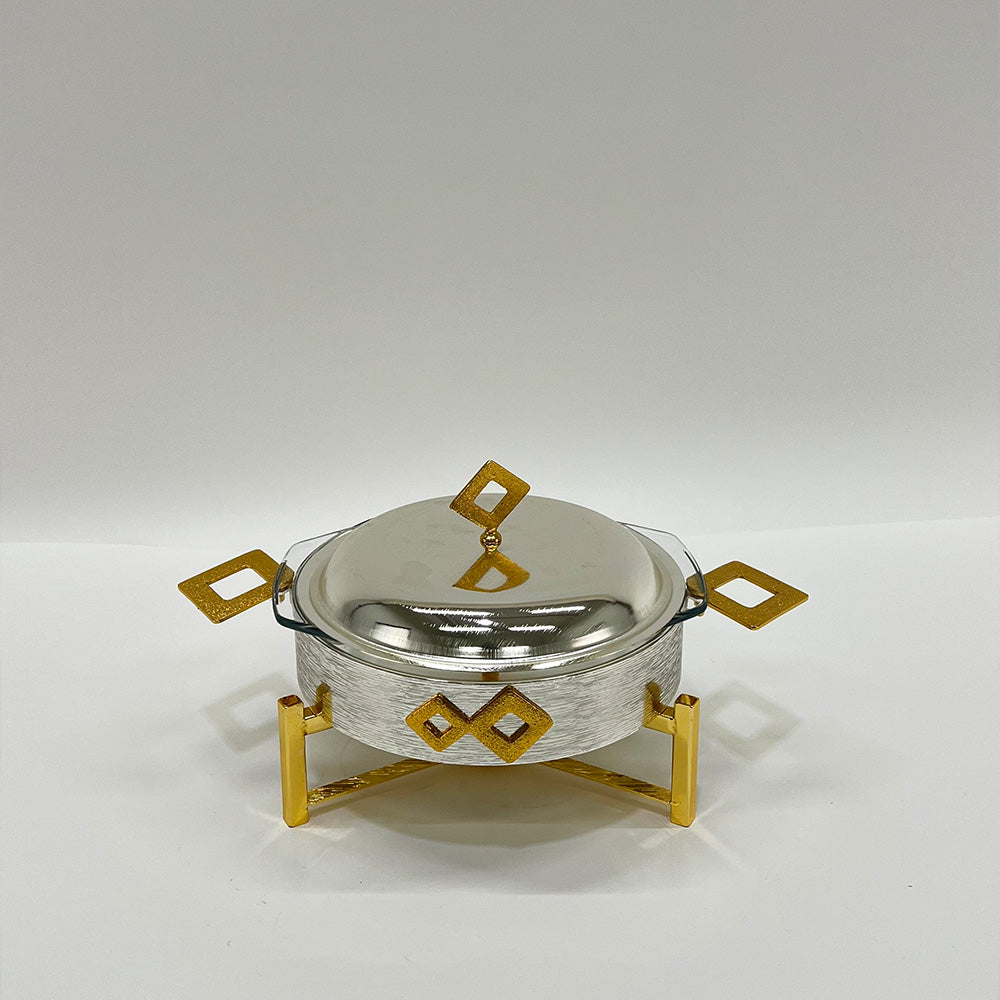 الفضي اللامع والذهبي: وعاء خارجي من الستانلس ستيل المصقول بلمسة مرآة عاكسة، مع قاعدة ومقابض وتفاصيل ذهبية فاخرة تمنحه إشراقة كلاسيكية غنية.