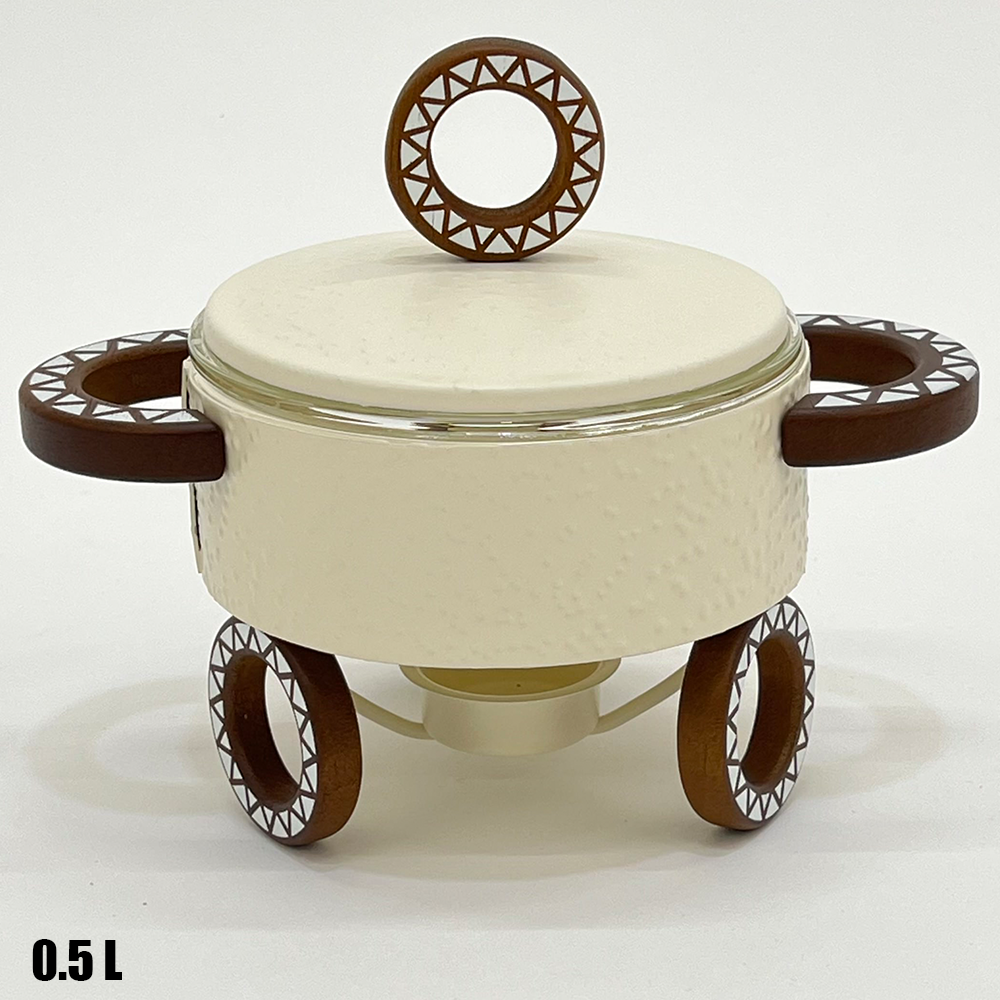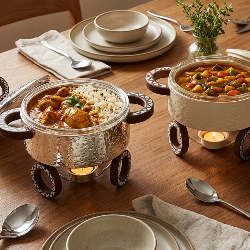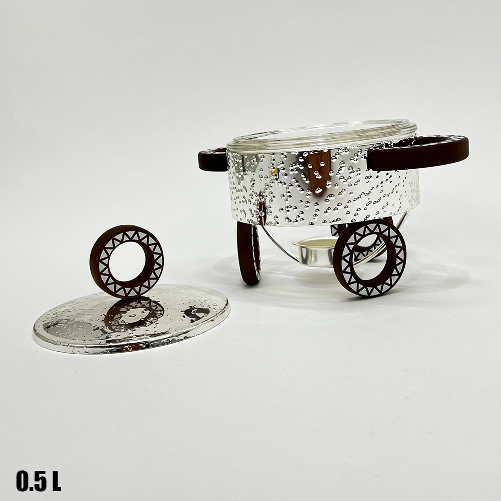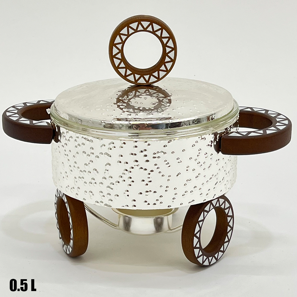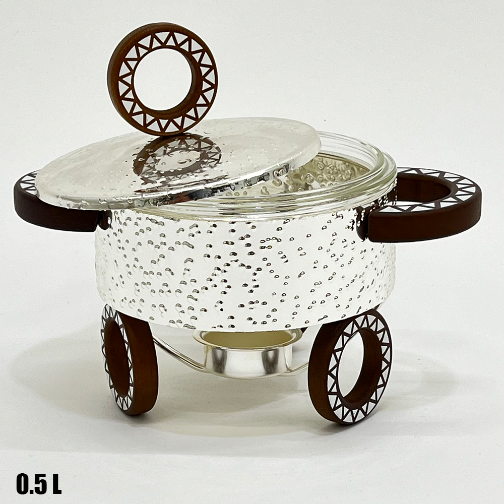 سخان طعام عملي وأنيق بحجم صغير مثالي للتقديم الفردي أو للصلصات والمقبلات. مصنوع من زجاج حراري عالي الجودة مع حامل معدني مزخرف يمنح طاولة التقديم مظهرًا راقيًا.