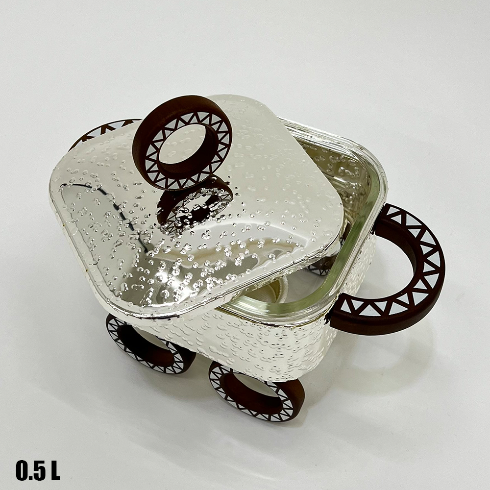 سخان طعام زجاجي صغير 0.5 لتر بتصميم فاخر – غطاء معدني وحامل بقاعدة شمعة