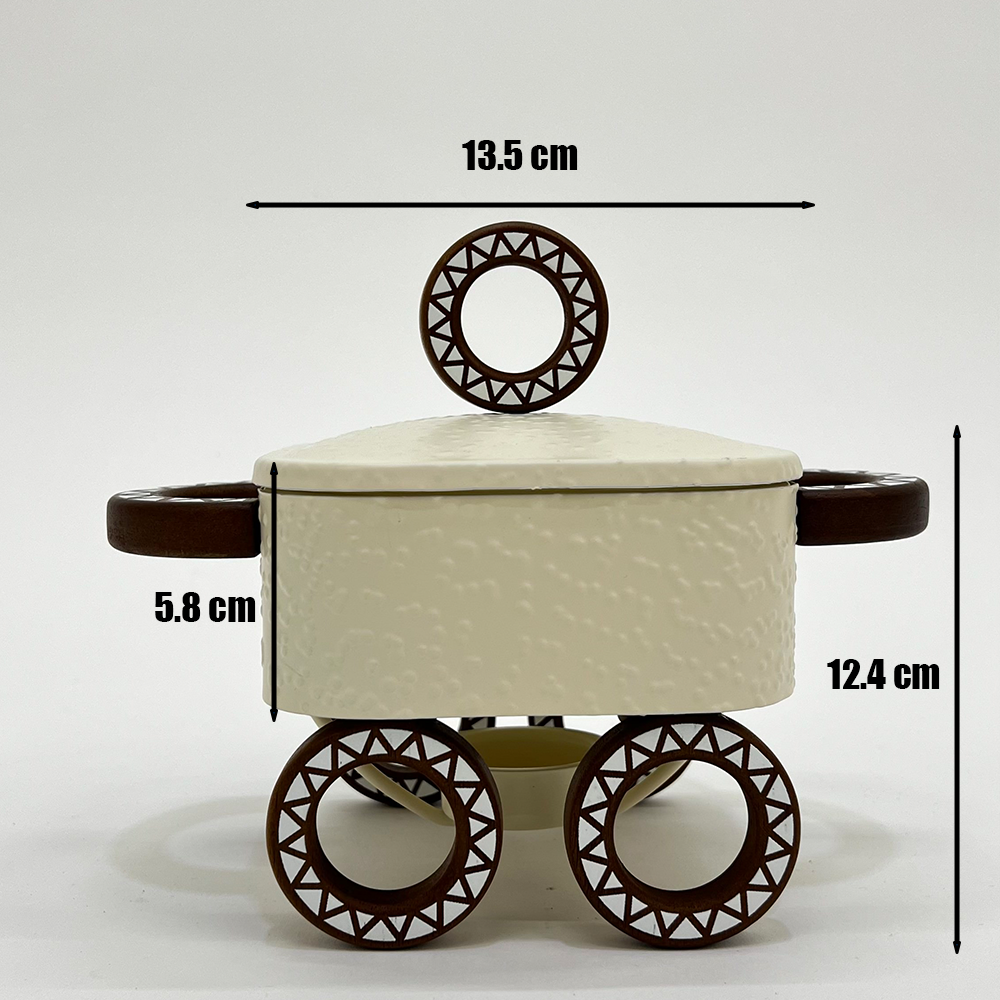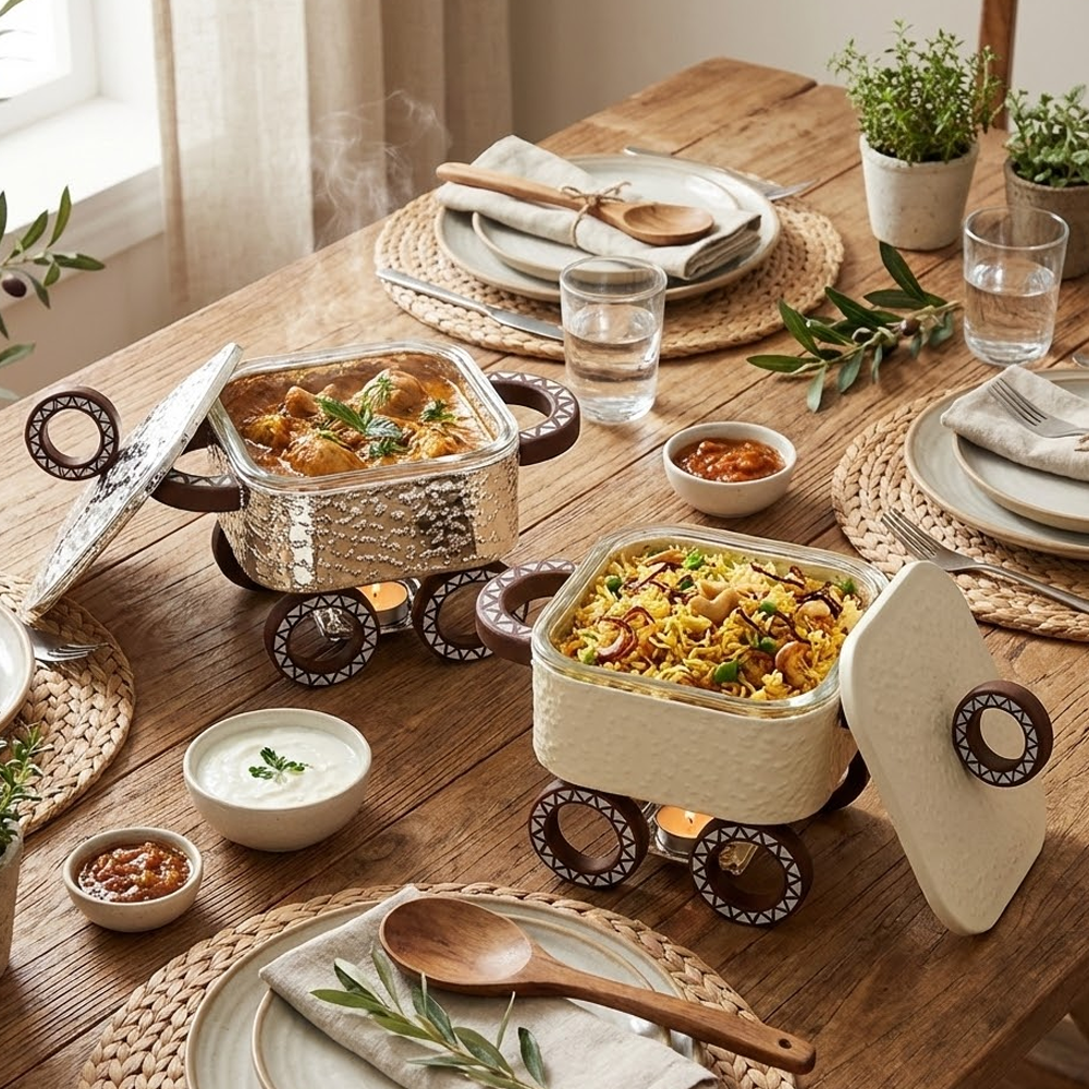 ✔ حامل معدني قوي بتصميم زخرفي أنيق مع قاعدة مخصصة لوضع شمعة التسخين للحفاظ على حرارة الطعام طوال وقت التقديم.