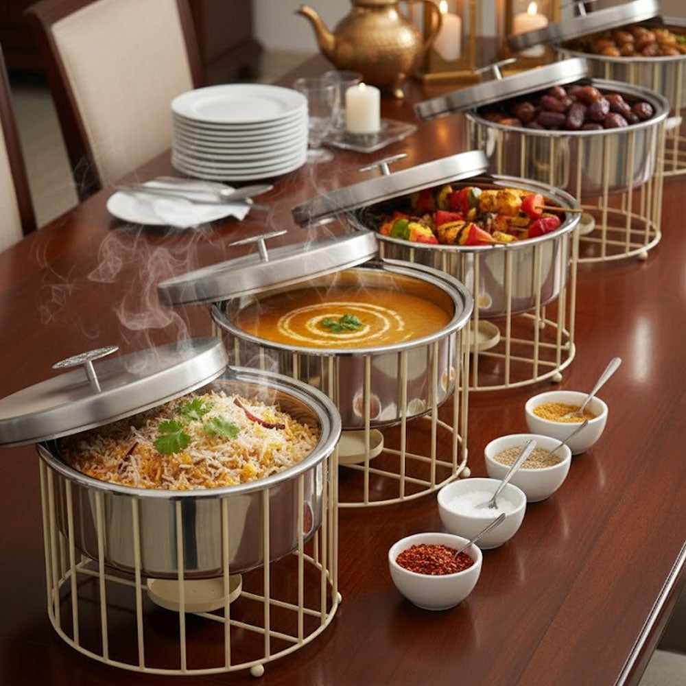يأتي الغطاء بشكل قبة أنيق يحافظ على حرارة الطعام ونكهته الطازجة لفترة طويلة، مما يجعله مثاليًا لتقديم الأطعمة في الولائم، والمناسبات، والبوفيهات المفتوحة.