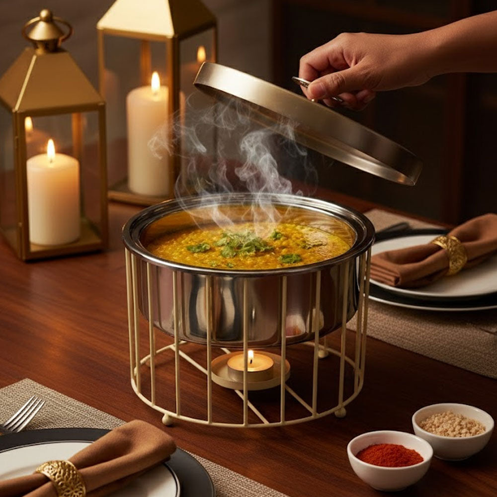 سخان طعام فاخر بتصميم عصري يجمع بين الأناقة والعملية. مصنوع من الستانلس ستيل عالي الجودة المقاوم للصدأ من ديفا ليدي ، مع قاعدة معدنية متينة تمنح ثباتًا وأناقة على طاولة الطعام.