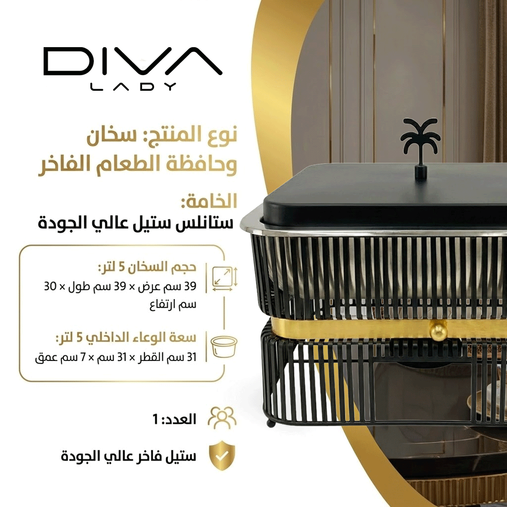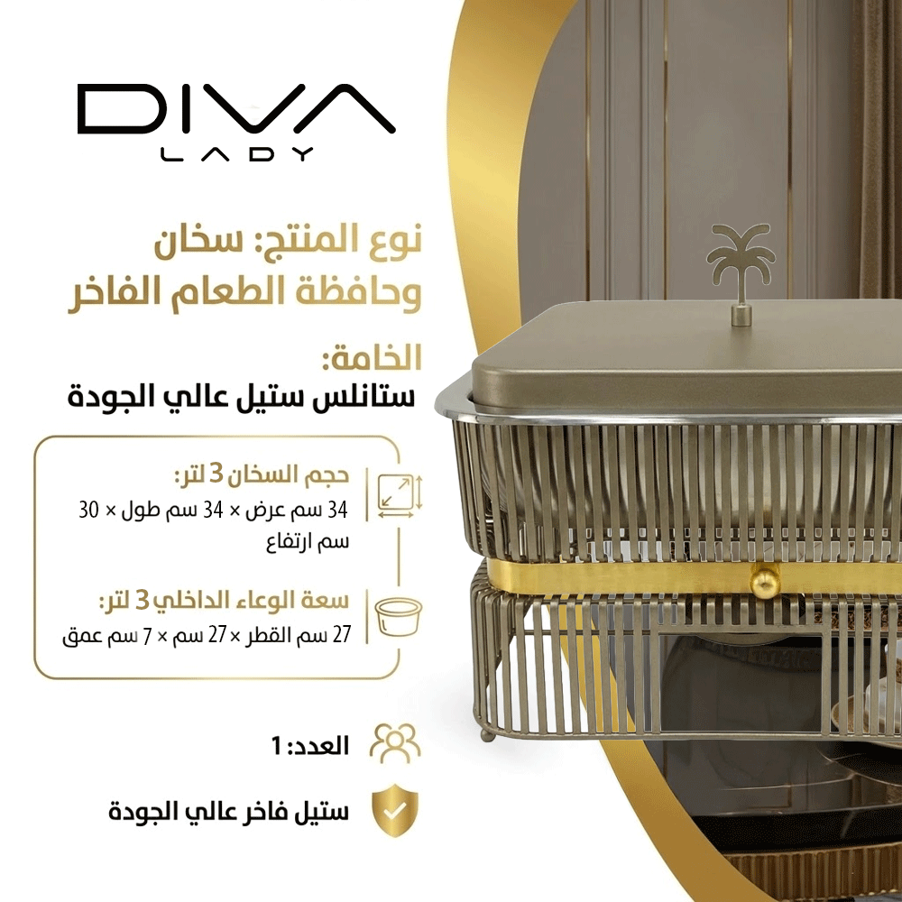 ارتقِ بتجربة الضيافة مع سخان وحافظة الطعام الفاخرة من ديفا ليدي، قطعة مصممة بعناية لتجمع بين الفخامة العملية والتصميم العصري الراقي، وتُعد إضافة مميزة لأي مائدة تقديم أو مجلس ضيافة.