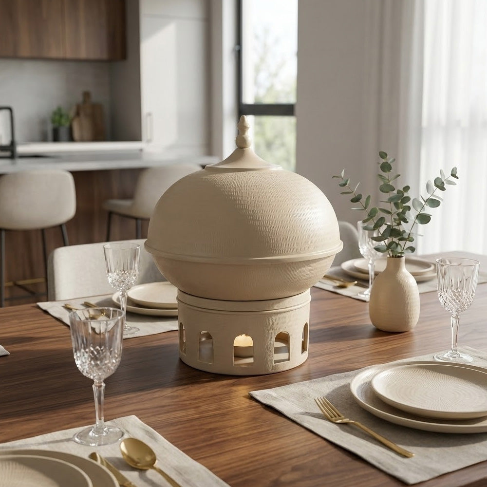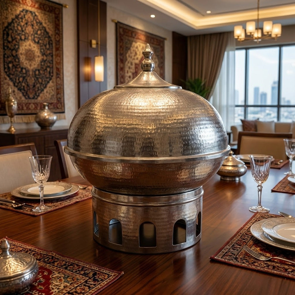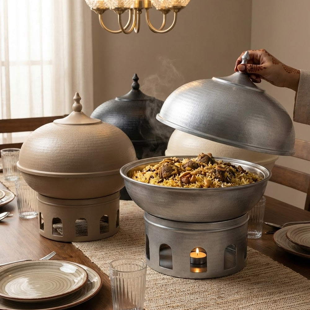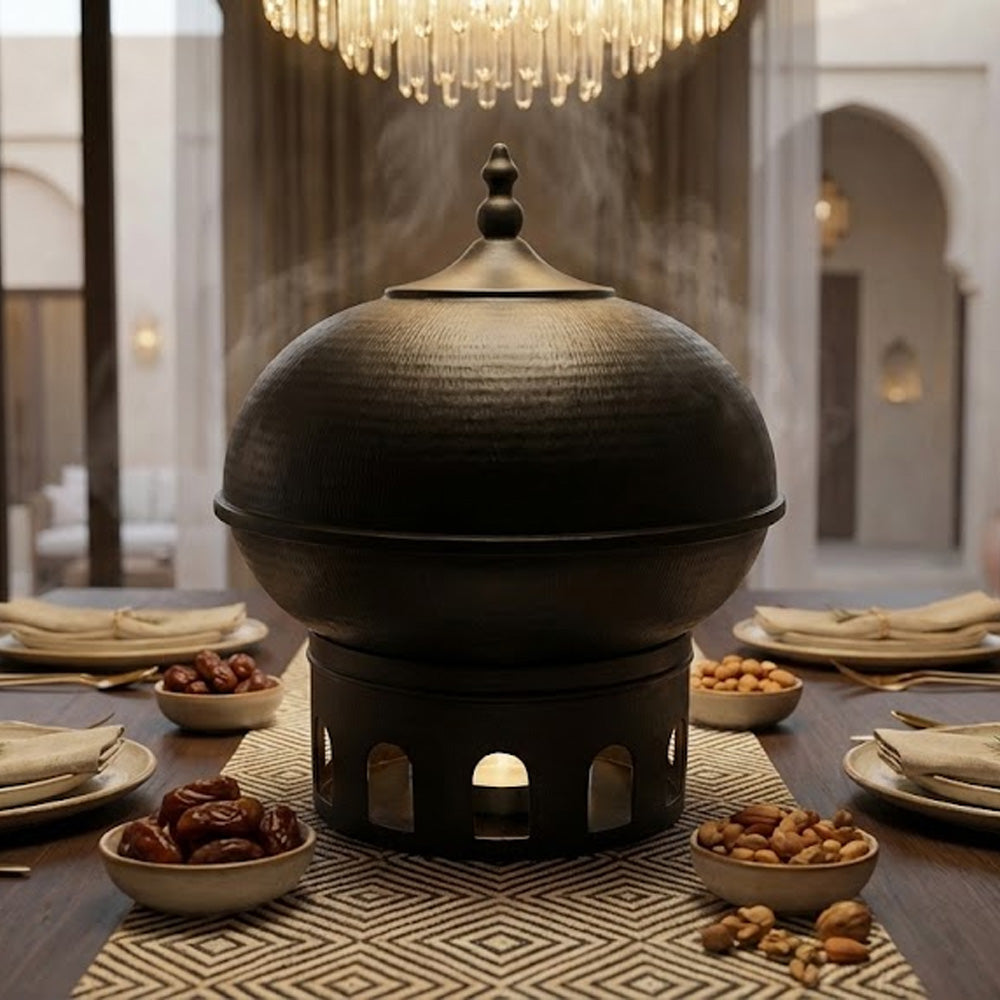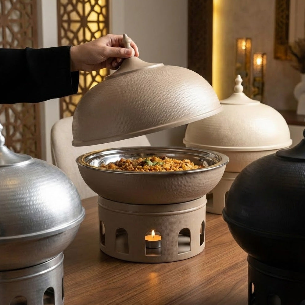 صُممت هذه المدفأة الحرارية للطعام، بسعة 7 لترات، على شكل قبة، لتقديم كميات كبيرة من الطعام بأناقة، مع الحفاظ على دفئه لفترات طويلة. تتميز بغطاء قبة دائري واسع مزين بقطعة زخرفية، وقاعدة تسخين جيدة التهوية، مما يجمع بين العملية والجمال.