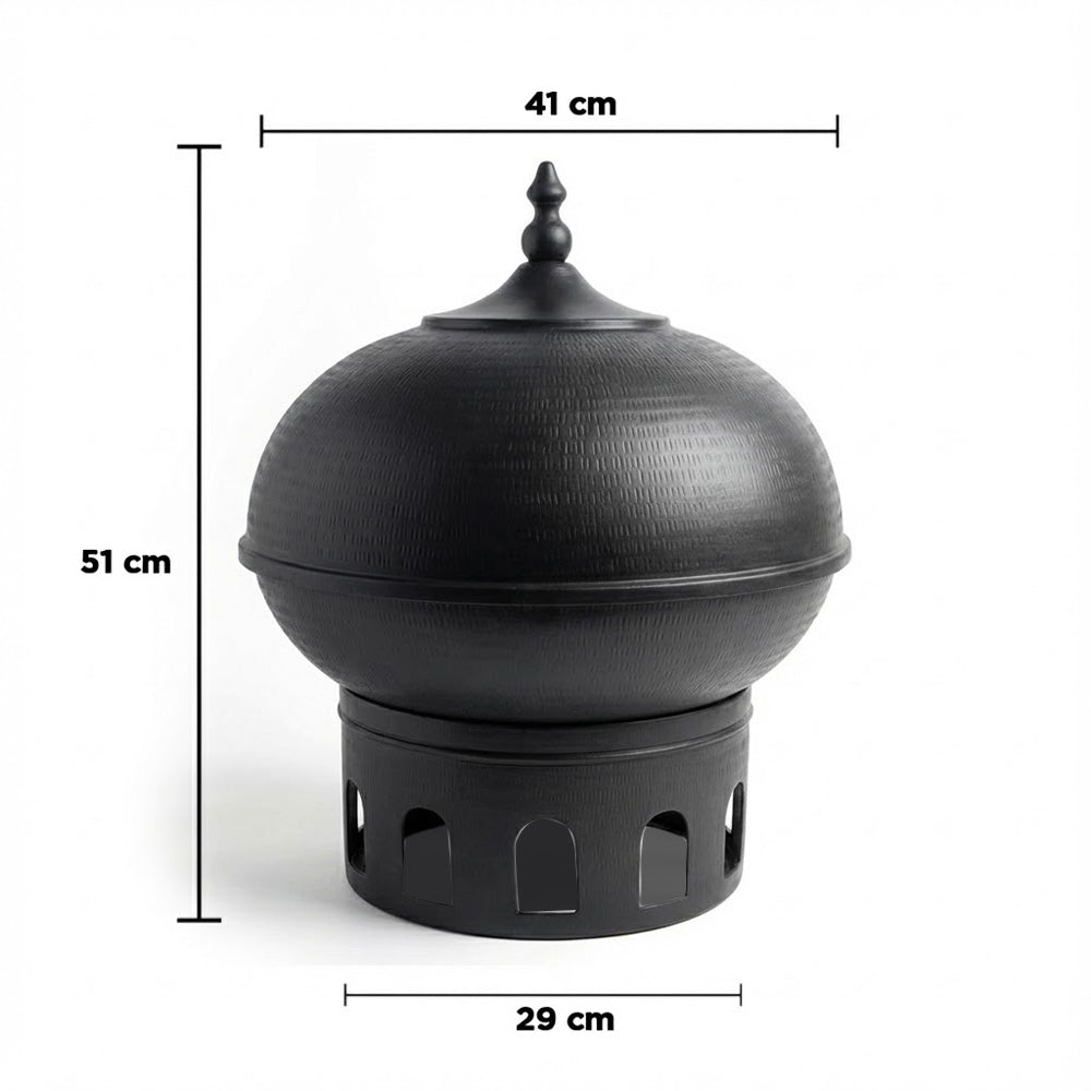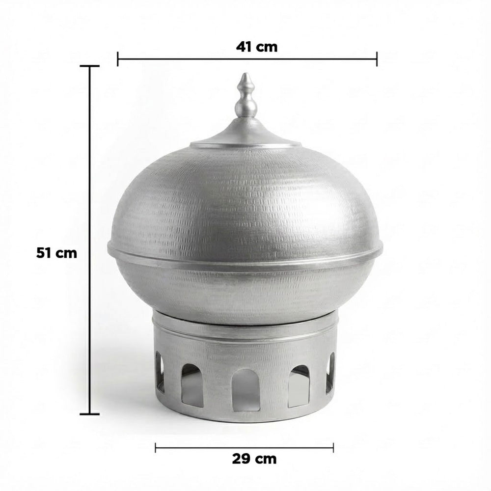 بأبعاد إجمالية تبلغ 51 سم ارتفاعًا، و41 سم قطرًا من الأعلى، و29 سم قطرًا من القاعدة، تُعد هذه المدفأة الحرارية مثالية لتقديم الأرز، والبرياني، والكاري، والشوربات، واليخنات، والأطباق الرئيسية في التجمعات. يضمن الوعاء الداخلي القابل للإزالة المصنوع من الفولاذ المقاوم للصدأ ملامسة الطعام بشكل صحي، بينما تتسع الحجرة السفلية لشمعة أو موقد وقود لتوزيع الحرارة بشكل متساوٍ.