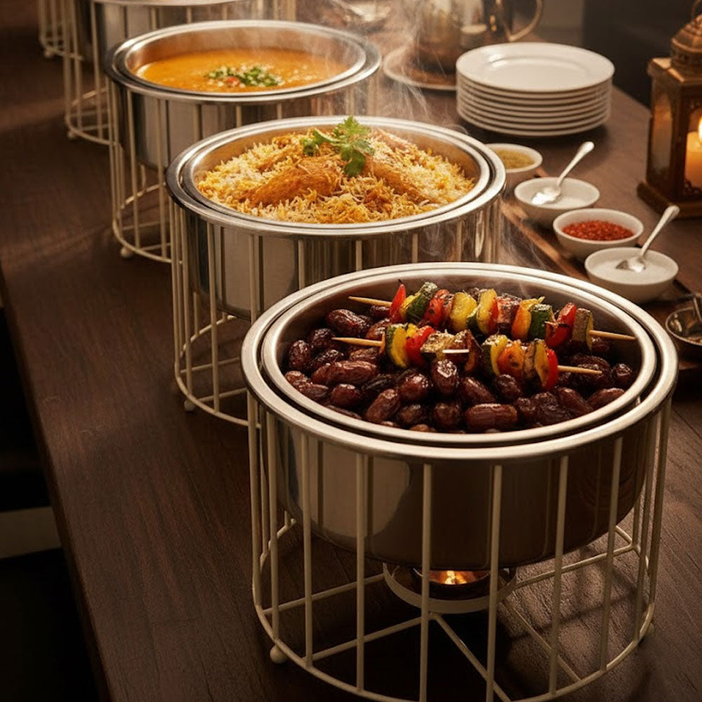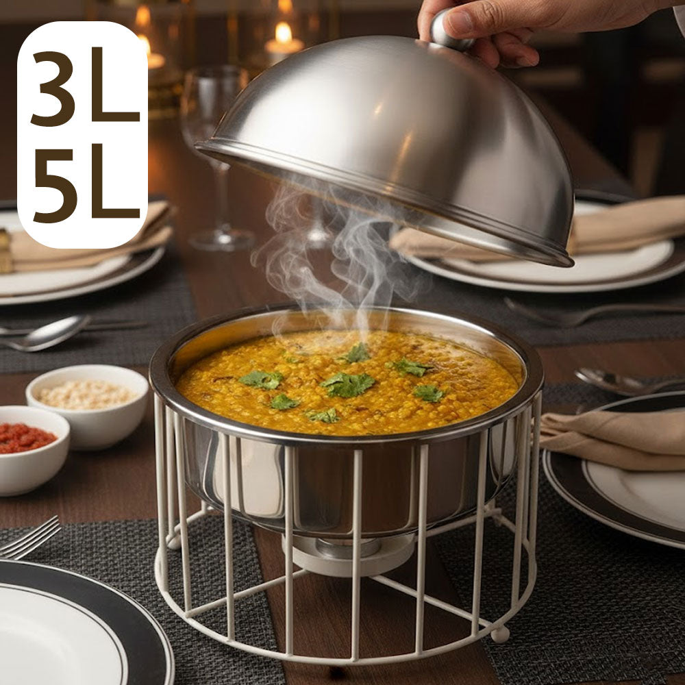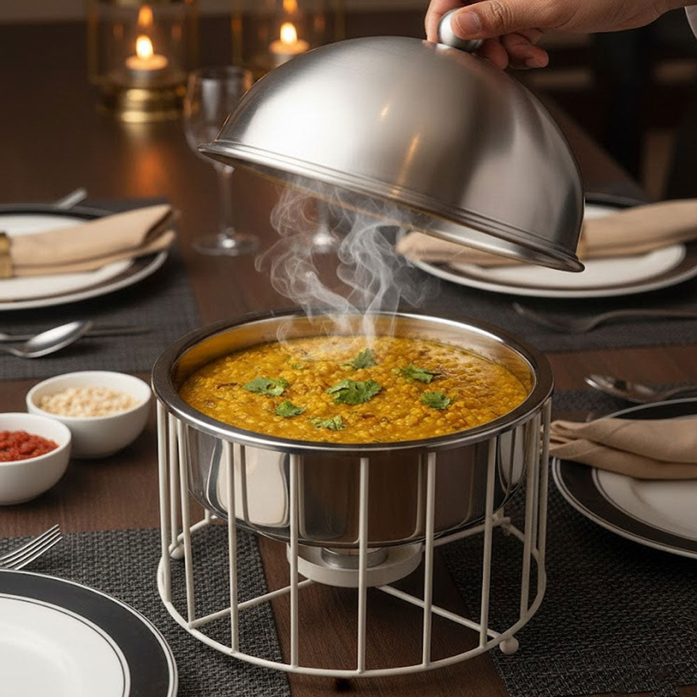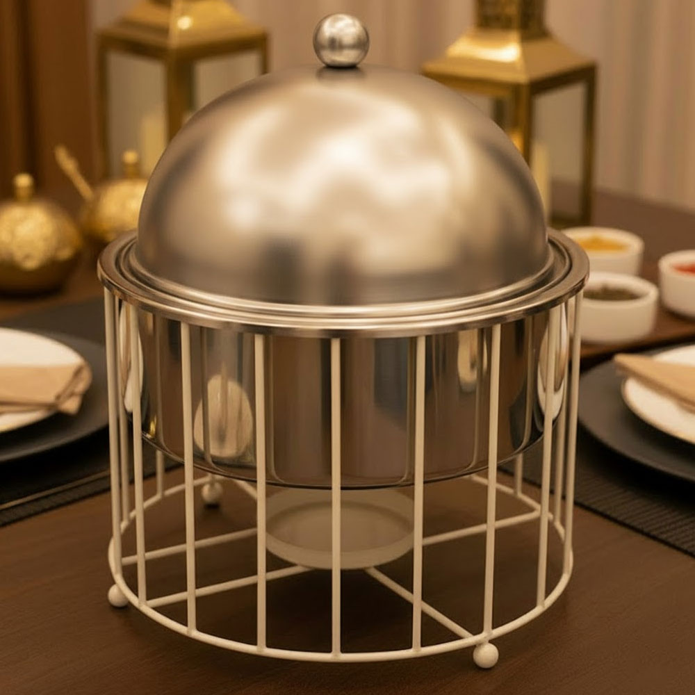 يأتي الغطاء بشكل قبة أنيق يحافظ على حرارة الطعام ونكهته الطازجة لفترة طويلة، مما يجعله مثاليًا لتقديم الأطعمة في الولائم، والمناسبات، والبوفيهات المفتوحة.