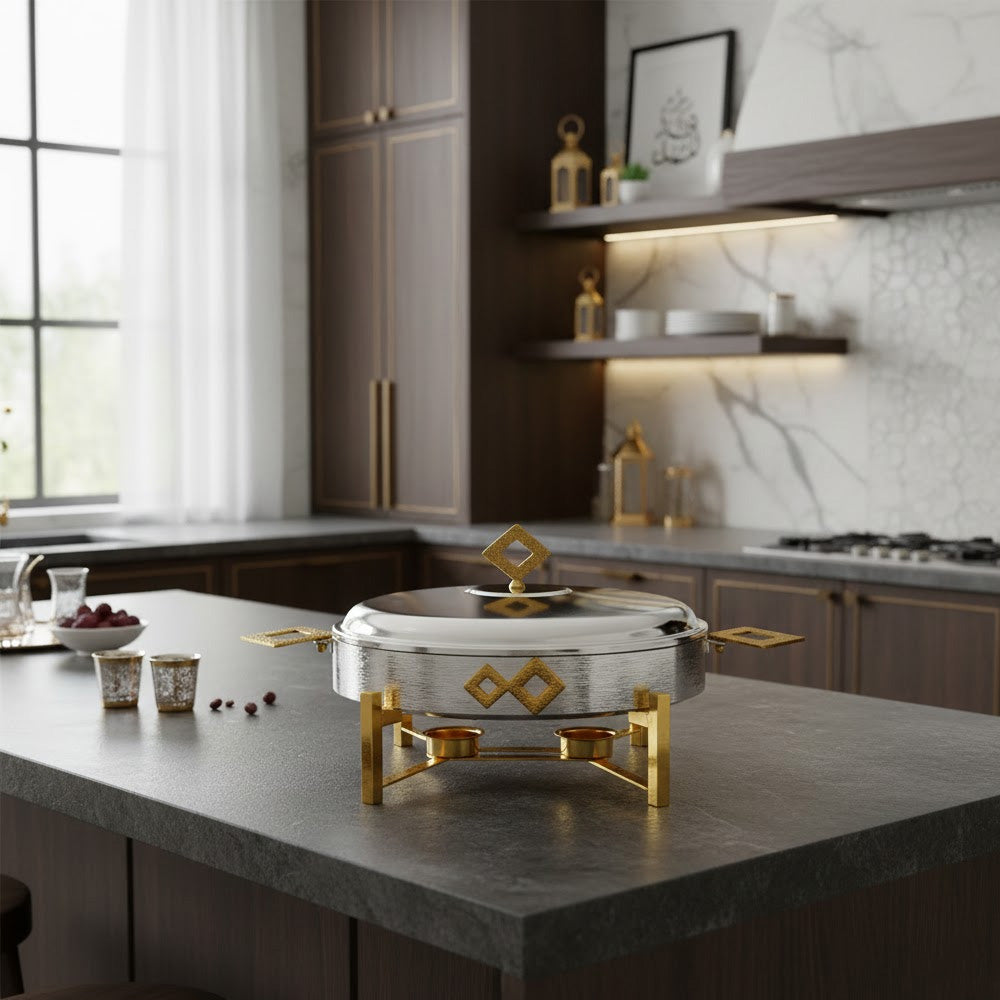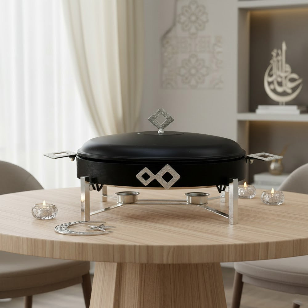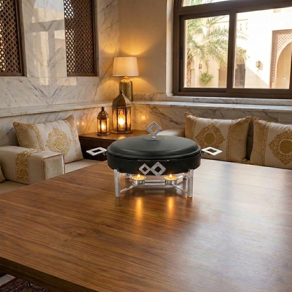 أضف لمسة من الفخامة والدفء على مائدتك مع سخان الطعام الأنيق هذا. يتميز بتصميم عصري جذاب مع تفاصيل هندسية راقية، ويعمل بالشموع للحفاظ على أطباقك الشهية دافئة وجاهزة للتقديم طوال فترة الضيافة.