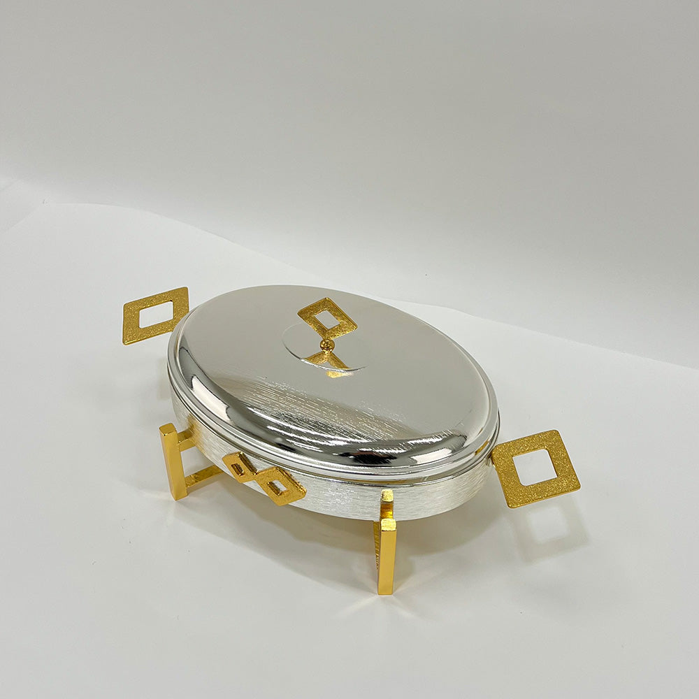 الفضي اللامع والذهبي: وعاء خارجي من الستانلس ستيل المصقول بلمسة مرآة عاكسة، مع قاعدة ومقابض وتفاصيل ذهبية فاخرة تمنحه إشراقة كلاسيكية غنية.