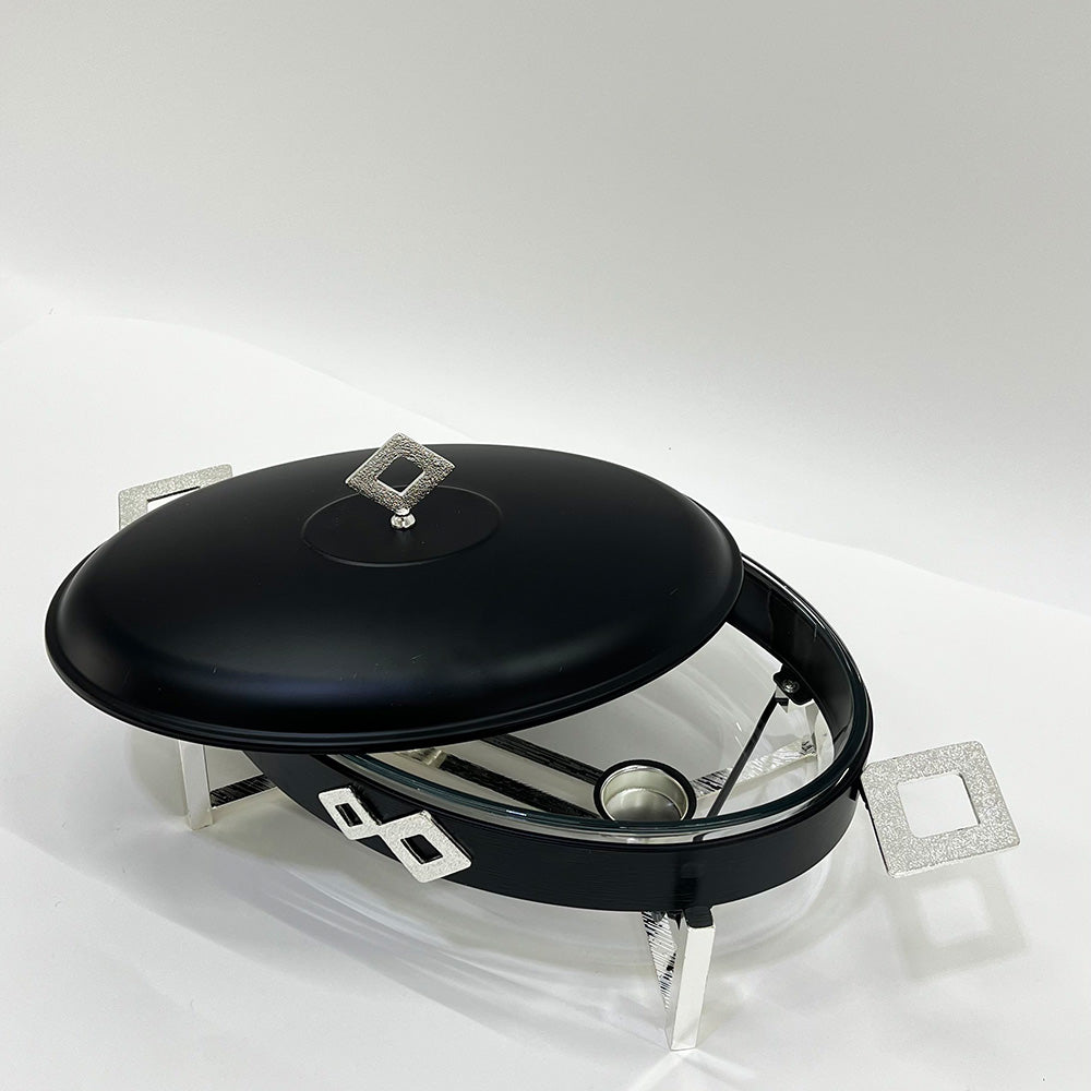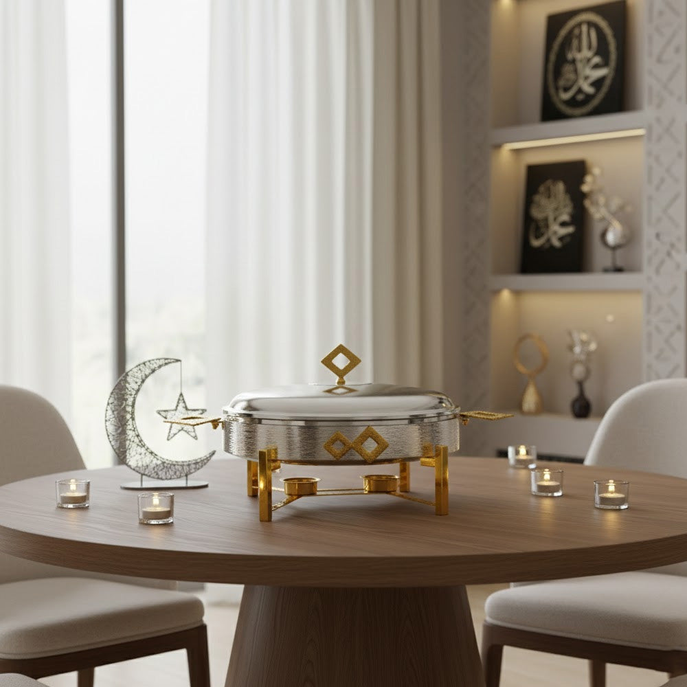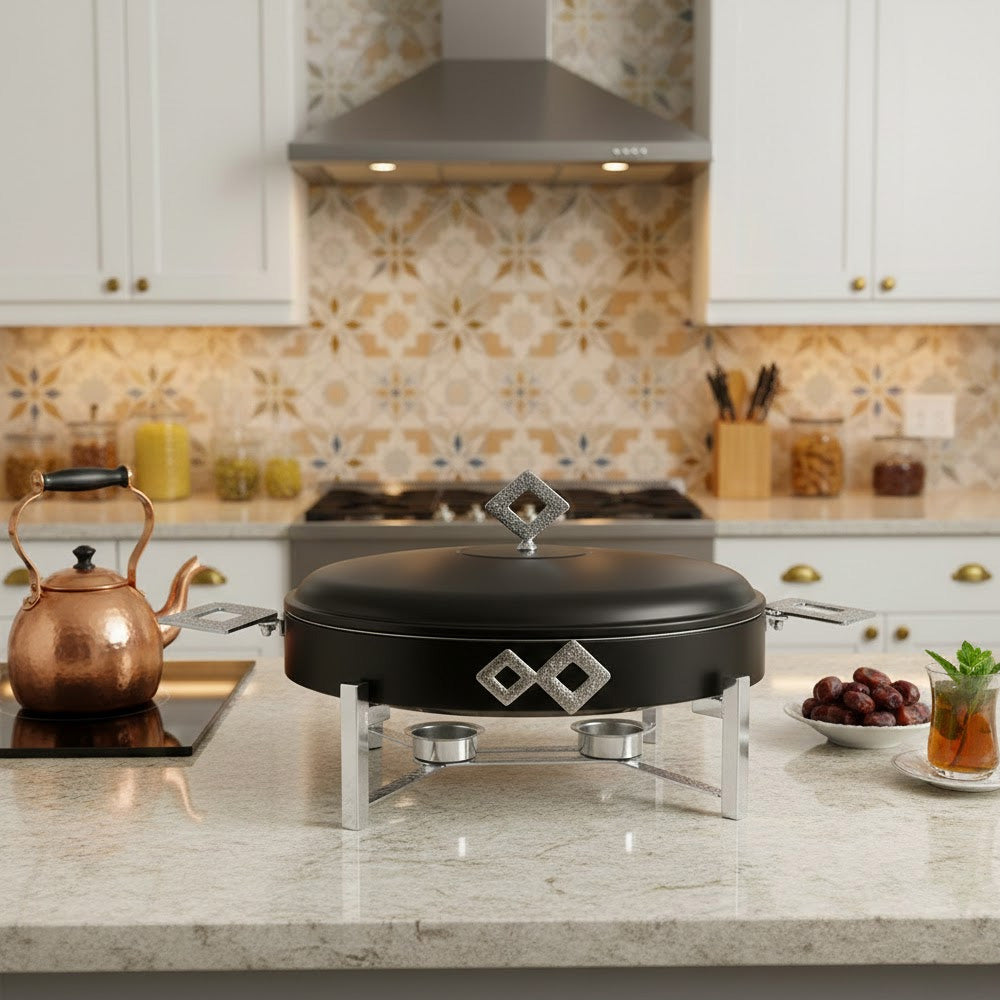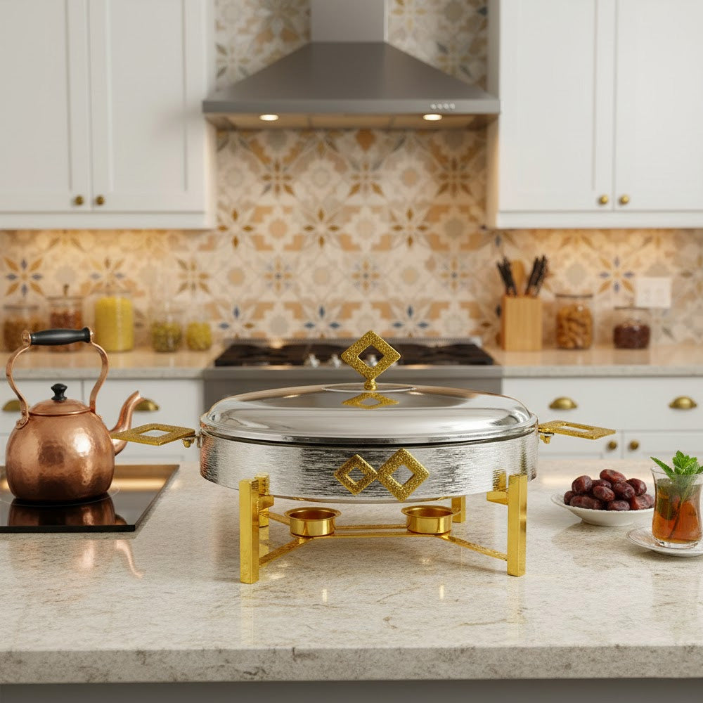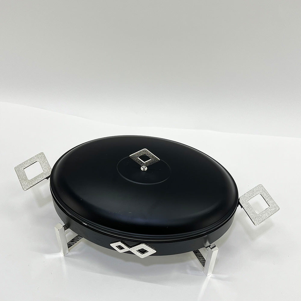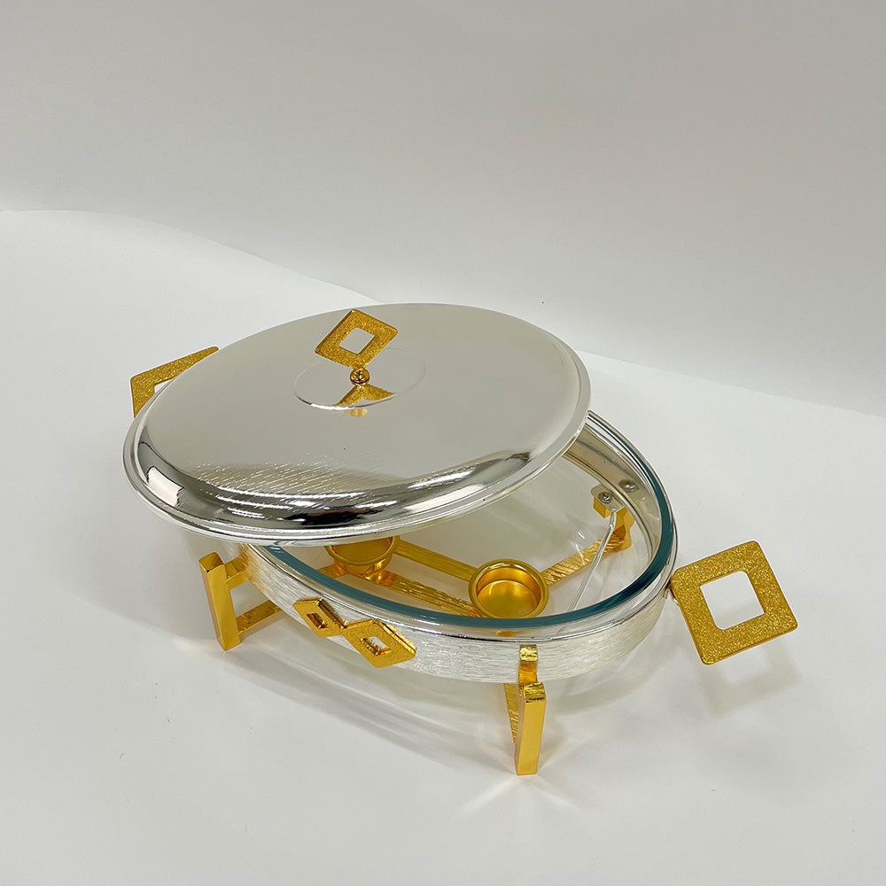 أضف لمسة من الفخامة والدفء على مائدتك مع سخان الطعام الأنيق هذا. يتميز بتصميم عصري جذاب مع تفاصيل هندسية راقية، ويعمل بالشموع للحفاظ على أطباقك الشهية دافئة وجاهزة للتقديم طوال فترة الضيافة.
