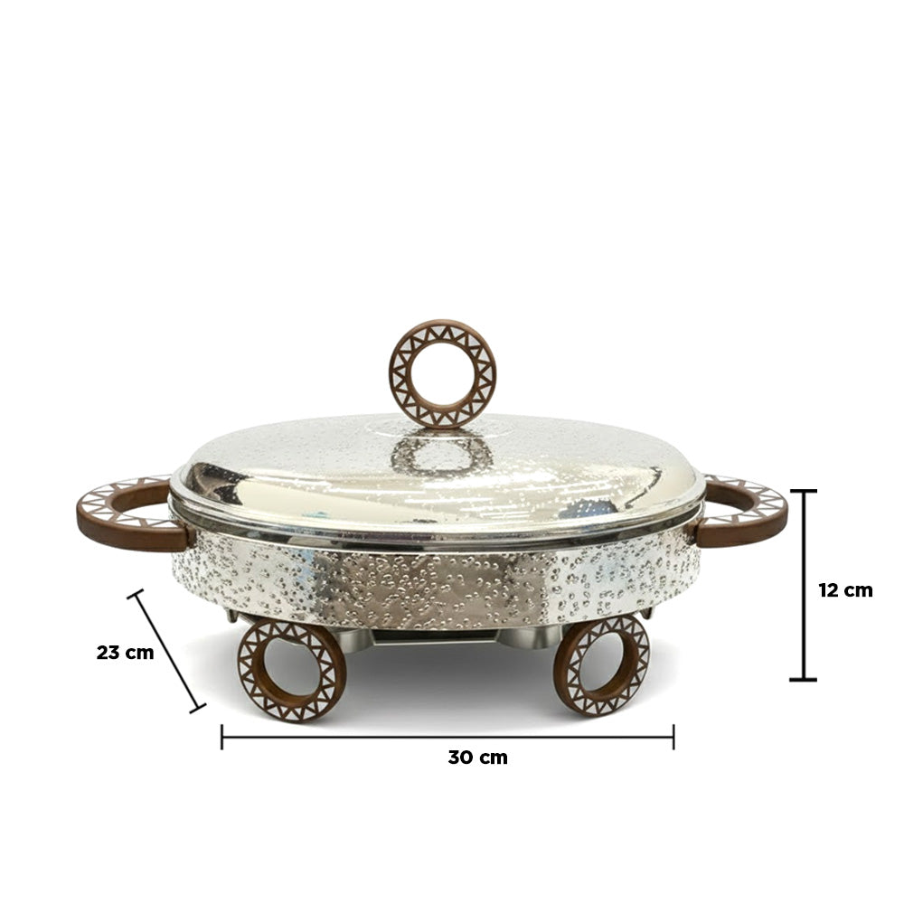 سخان طعام فاخر من الفولاذ المقاوم للصدأ سعة 2.5 لتر، يتميز بهيكل متين من الفولاذ المقاوم للصدأ المطروق وغطاء زجاجي شفاف مقاوم للحرارة. مصمم للحفاظ على سخونة الطعام وتقديمه بشكل جميل، وهو مثالي لتقديم الأرز واليخنات والمقبلات والأطباق العائلية. مقابض أنيقة وحامل مزخرف مرتفع يُضفيان لمسةً أنيقة على أي طاولة طعام، مع ضمان سهولة الاستخدام والثبات.