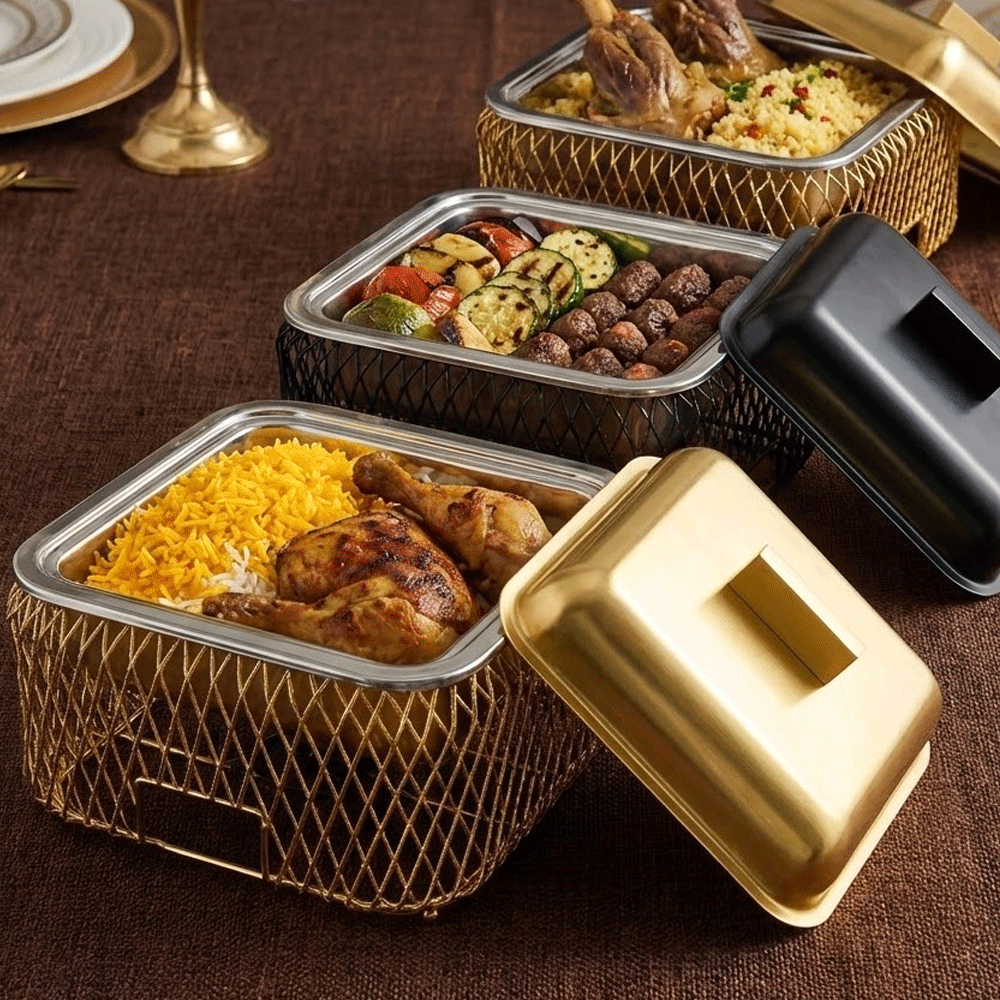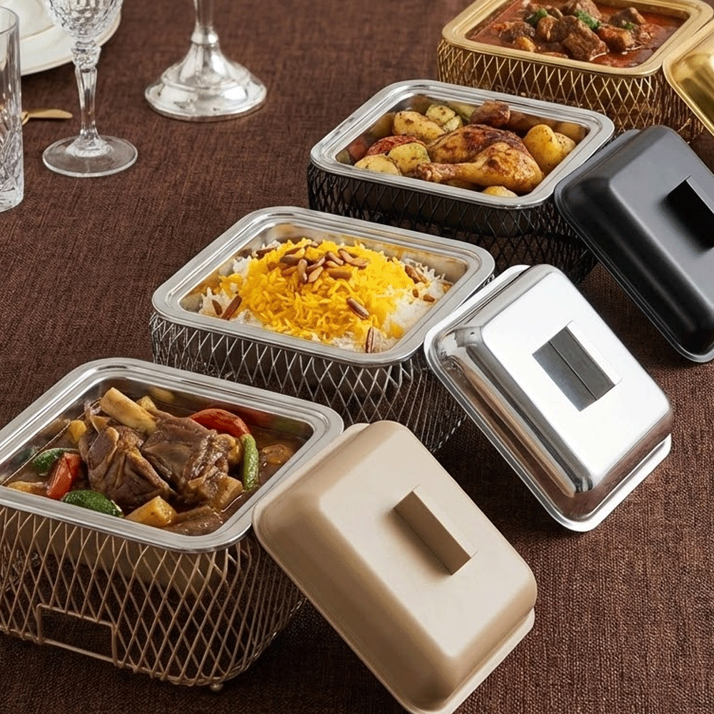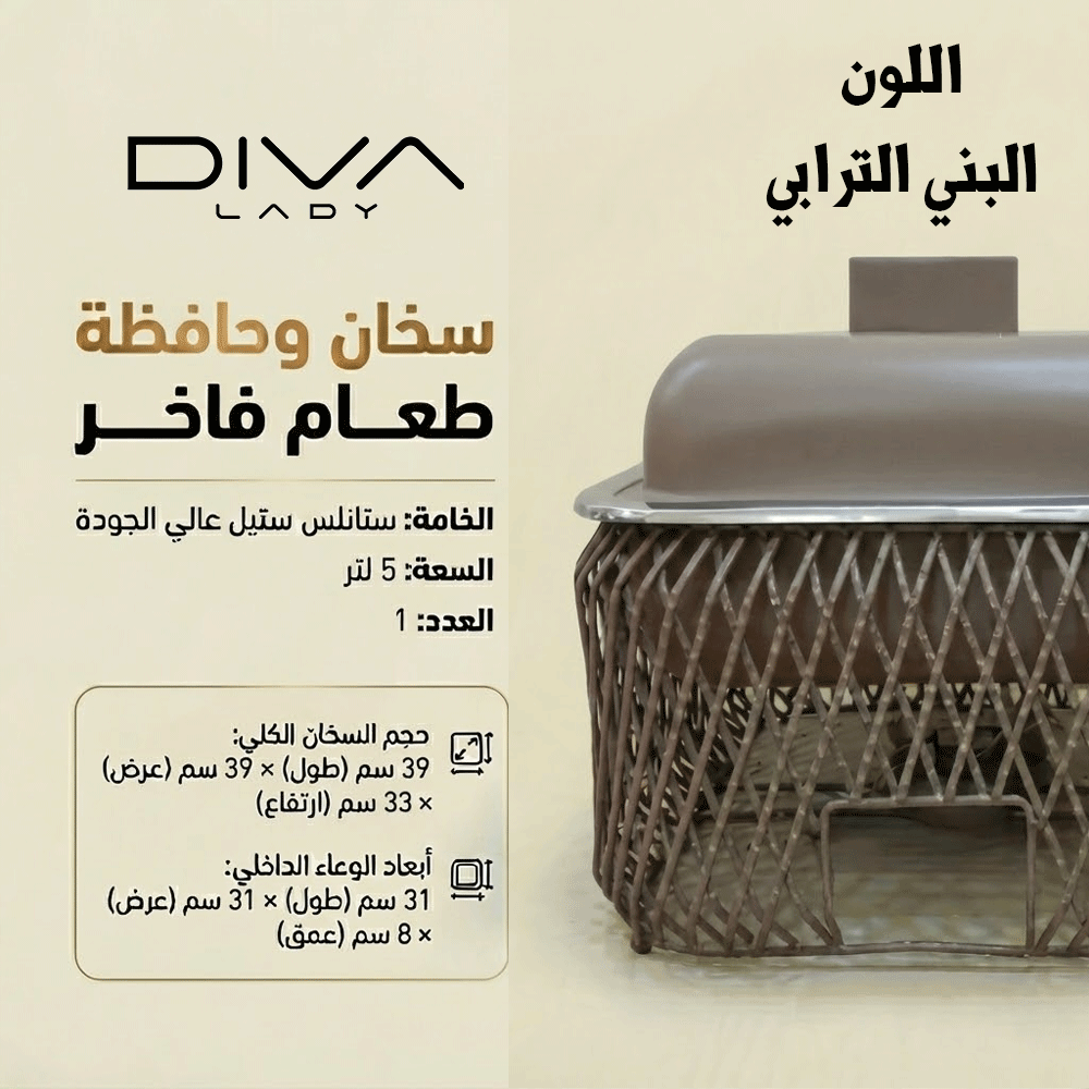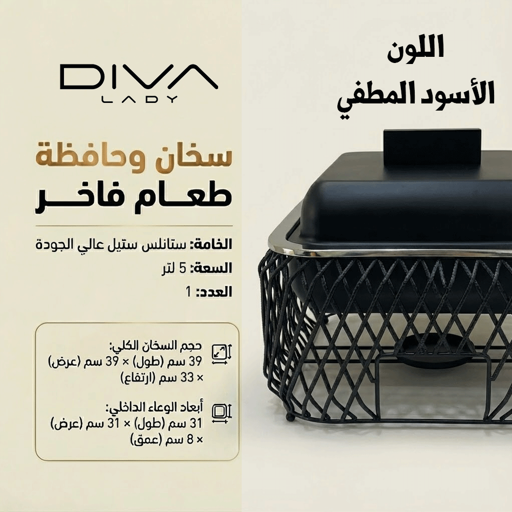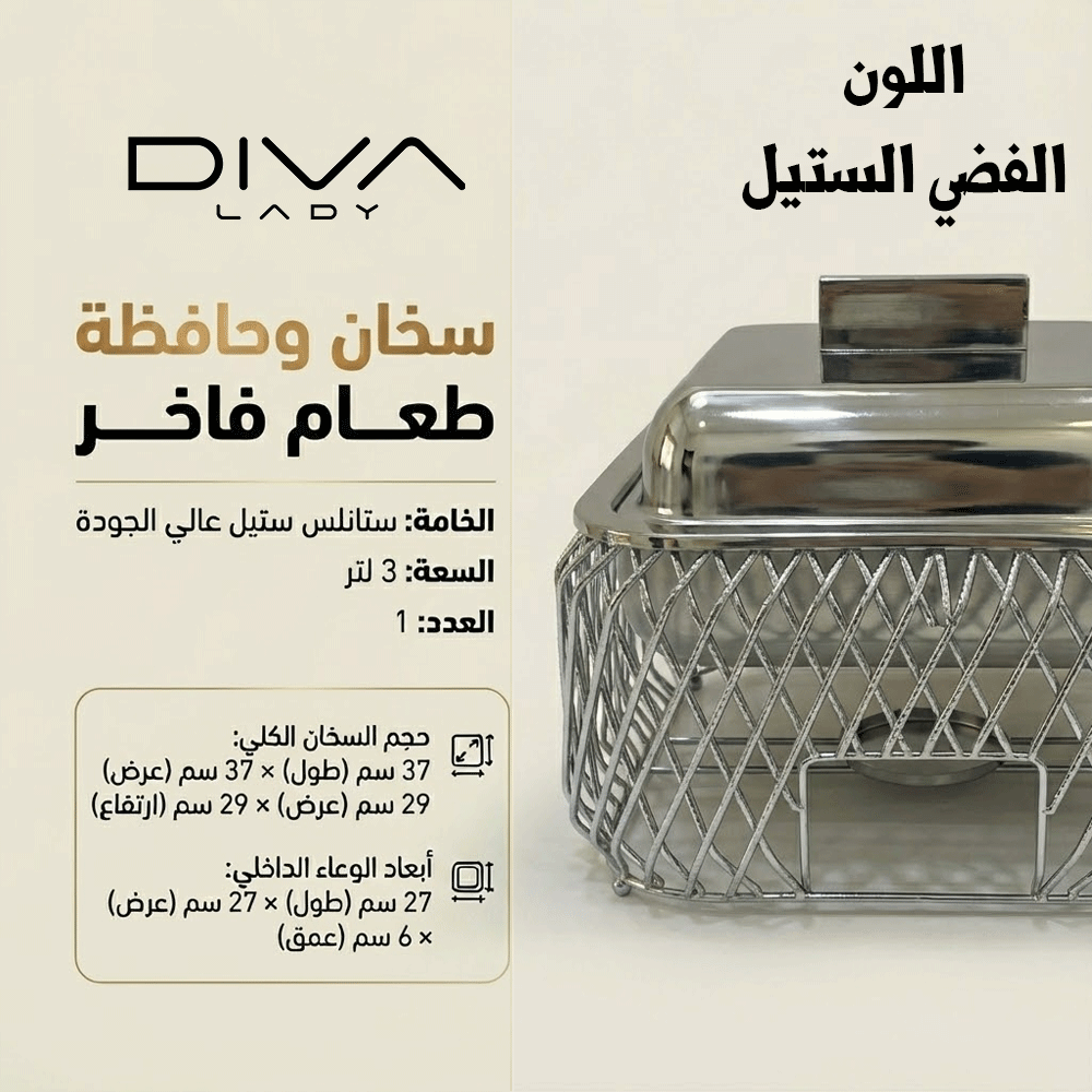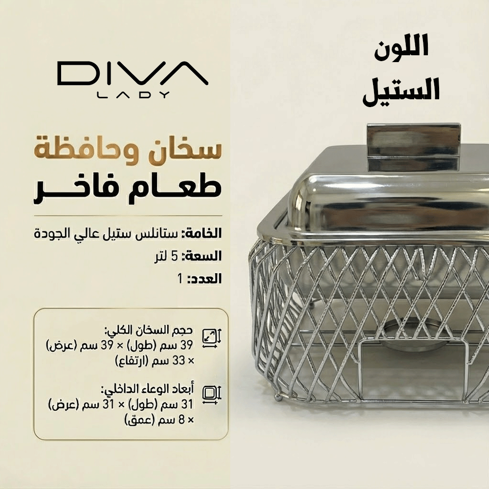 ارتقي بتجربة التقديم والضيافة مع سخان وحافظة الطعام المربعة من ديفا ليدي، قطعة أنيقة تجمع بين الوظيفة العملية والتصميم الفاخر، صُممت خصيصًا للحفاظ على حرارة الطعام وتقديمه بأسلوب راقٍ يليق بالمناسبات الخاصة والضيافة اليومية.